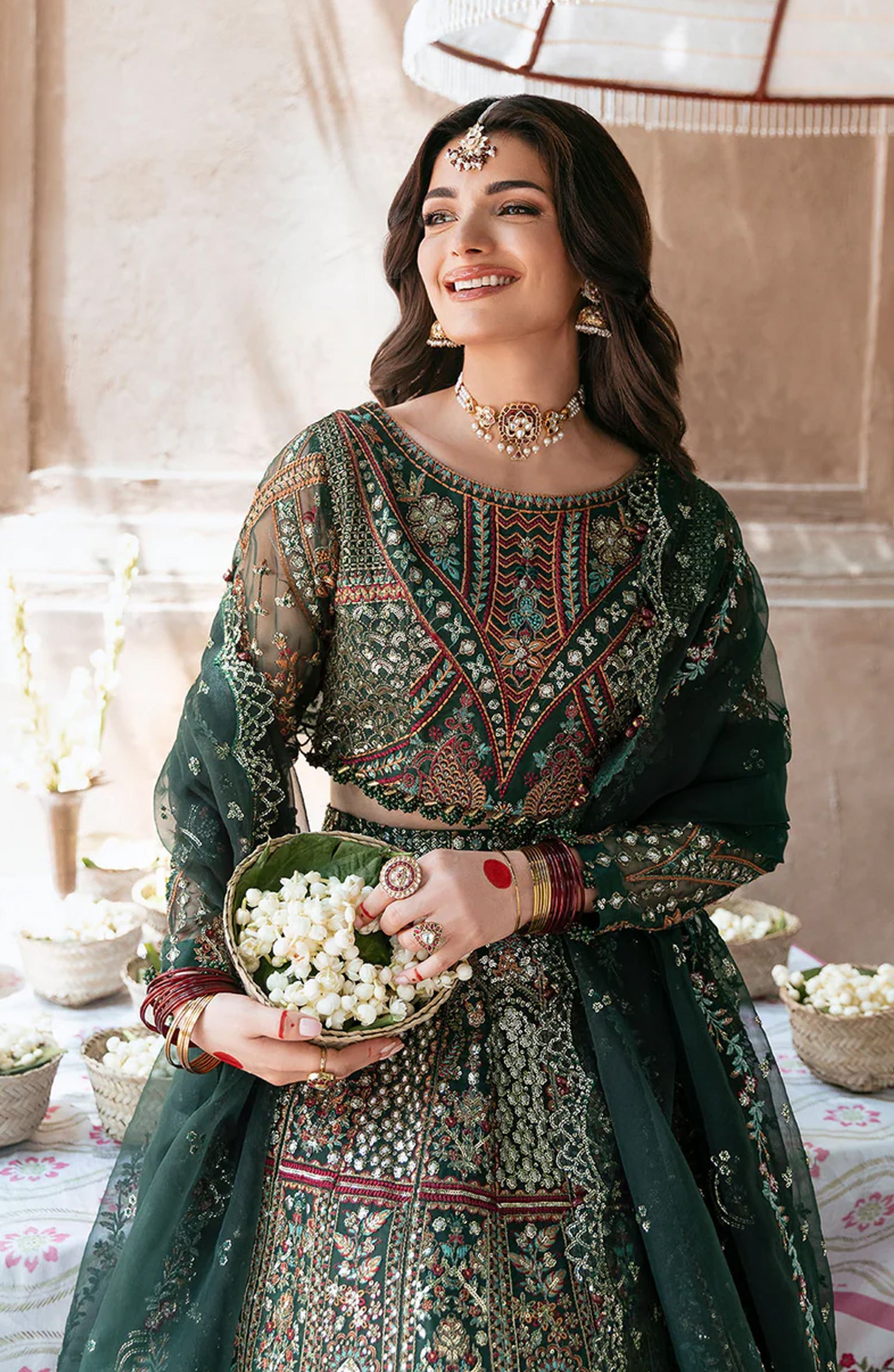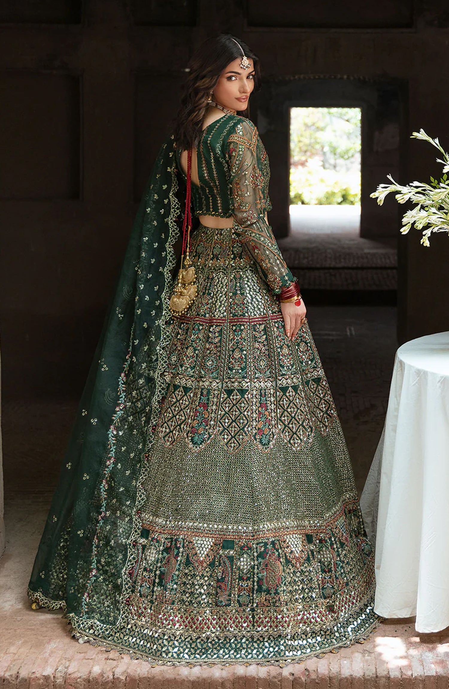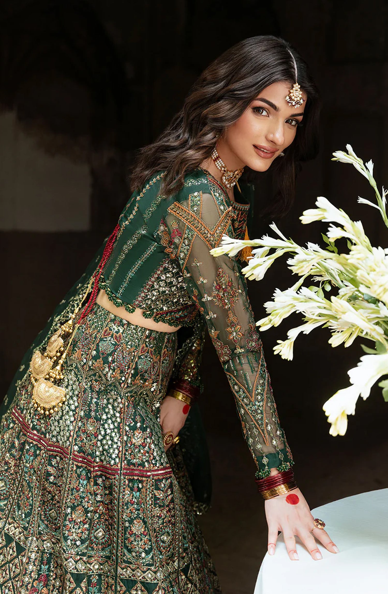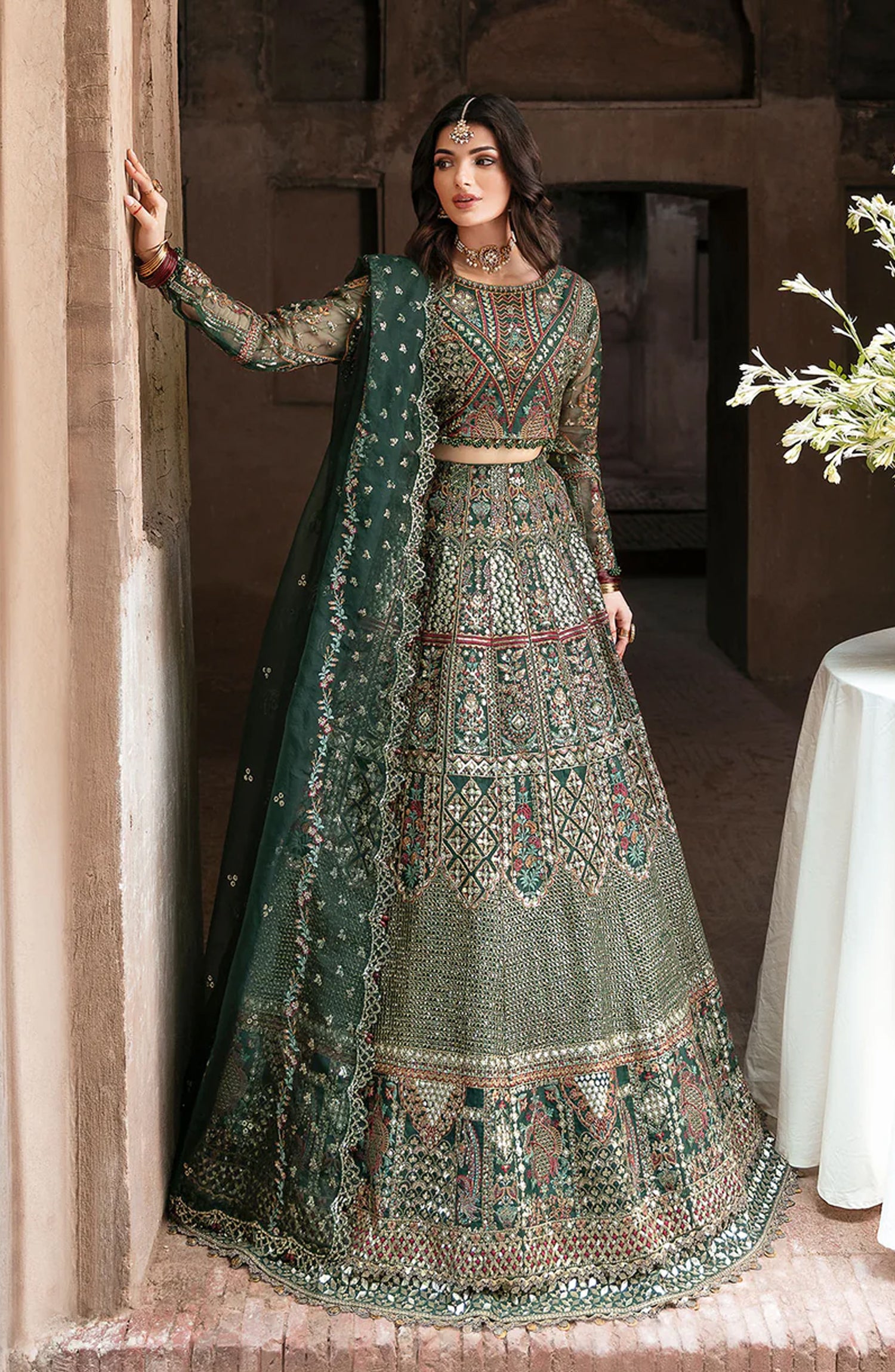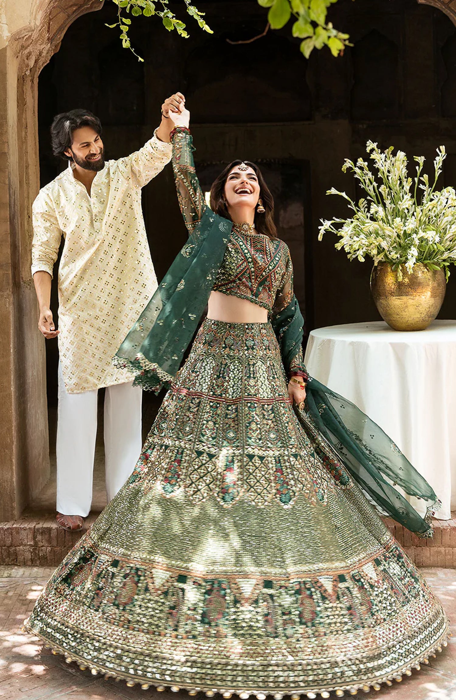 Timeless elegance with this intricately handcrafted green festive ensemble. Adorned with delicate Resham embroidery, shimmering sequins, and traditional motifs, this lehnga is a masterpiece of heritage craftsmanship. The richly detailed blouse, paired with a gracefully flowing dupatta, creates a regal silhouette — perfect for weddings and festive celebrations.