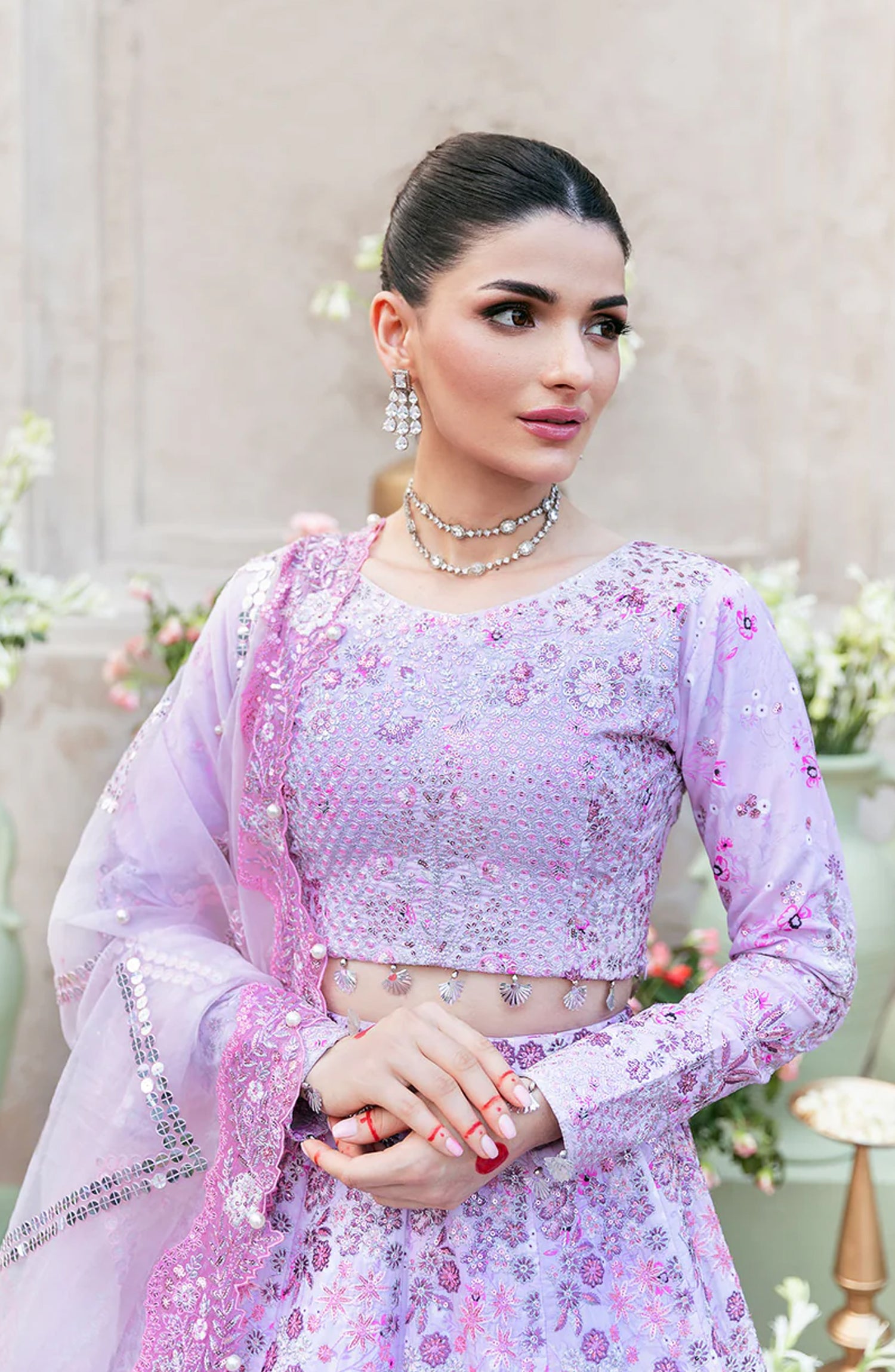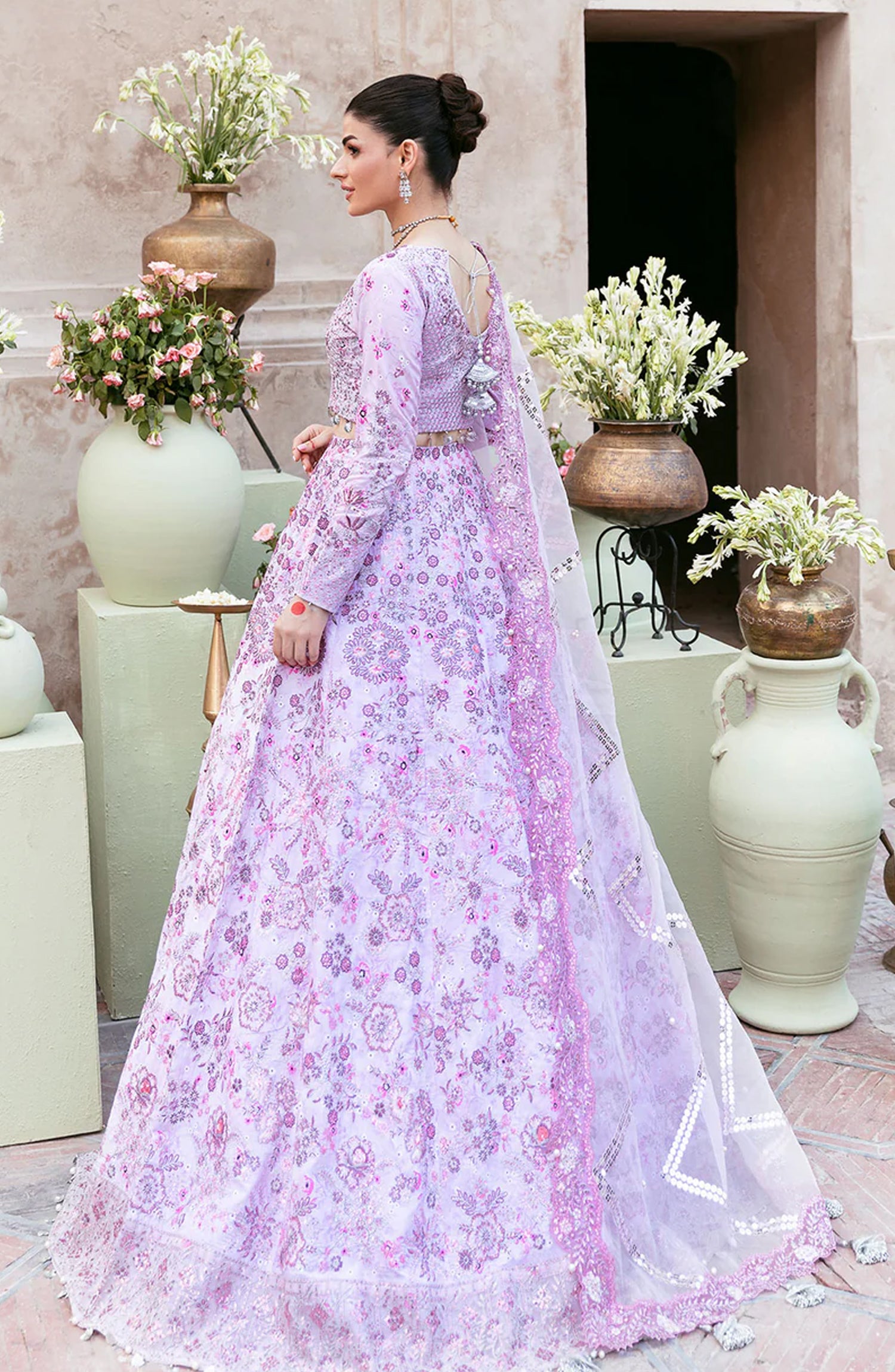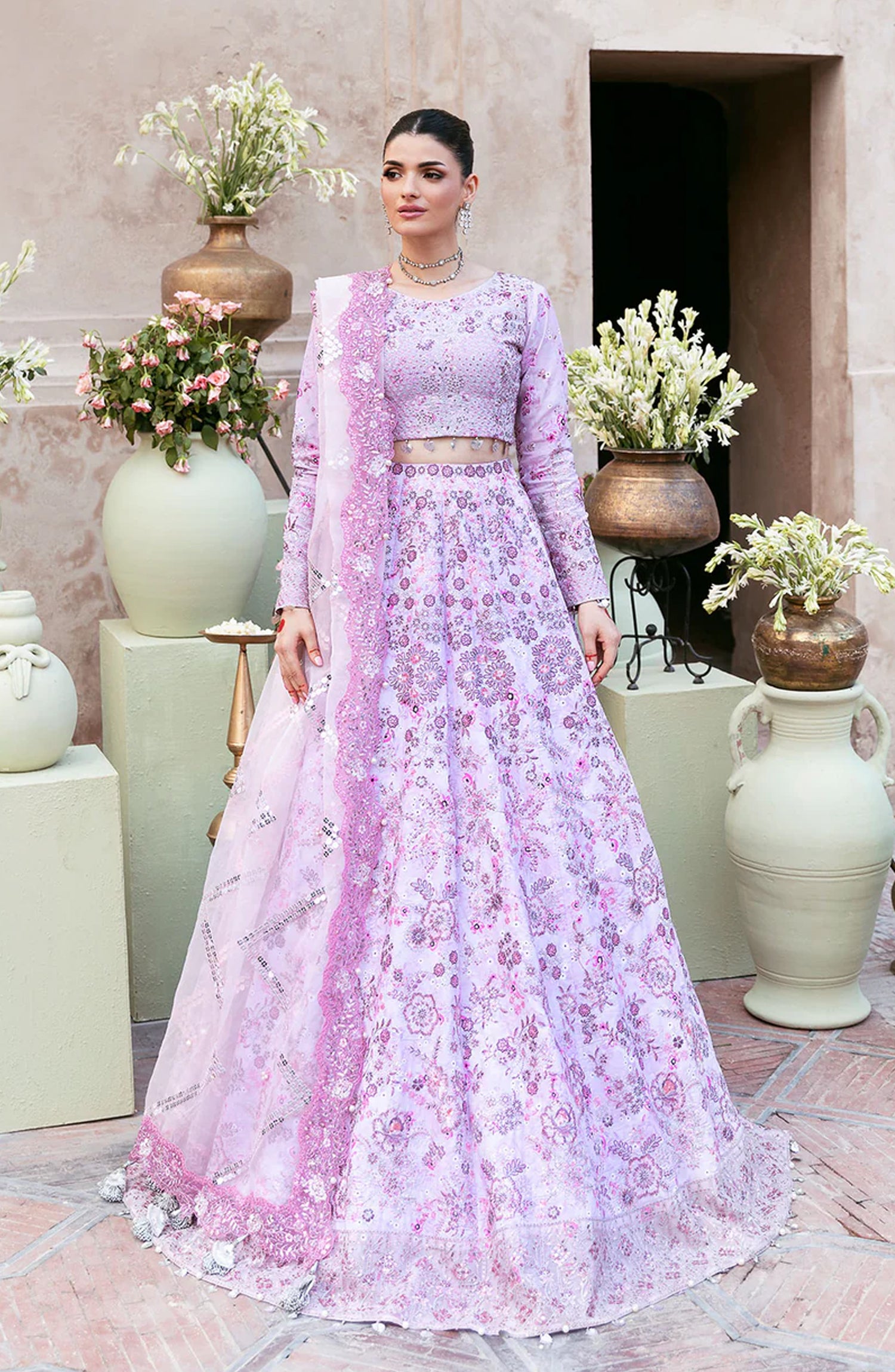 Timeless elegance with this intricately handcrafted powder pink festive ensemble. Adorned with delicate digital print, Resham embroidery, shimmering sequins, and traditional motifs, this lehnga is a masterpiece of heritage craftsmanship. The richly detailed blouse, paired with a gracefully flowing dupatta, creates a regal silhouette — perfect for weddings and festive celebrations.