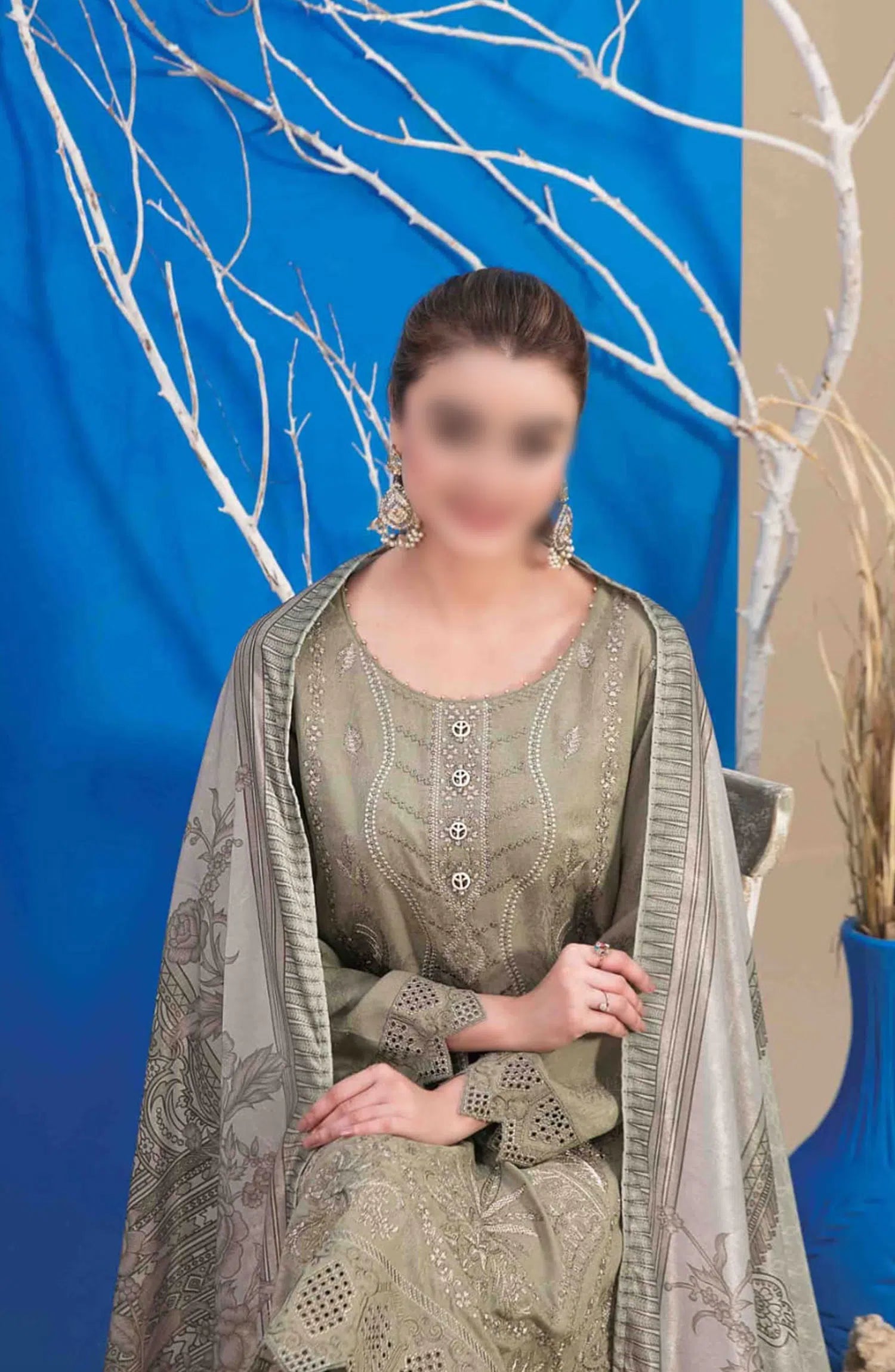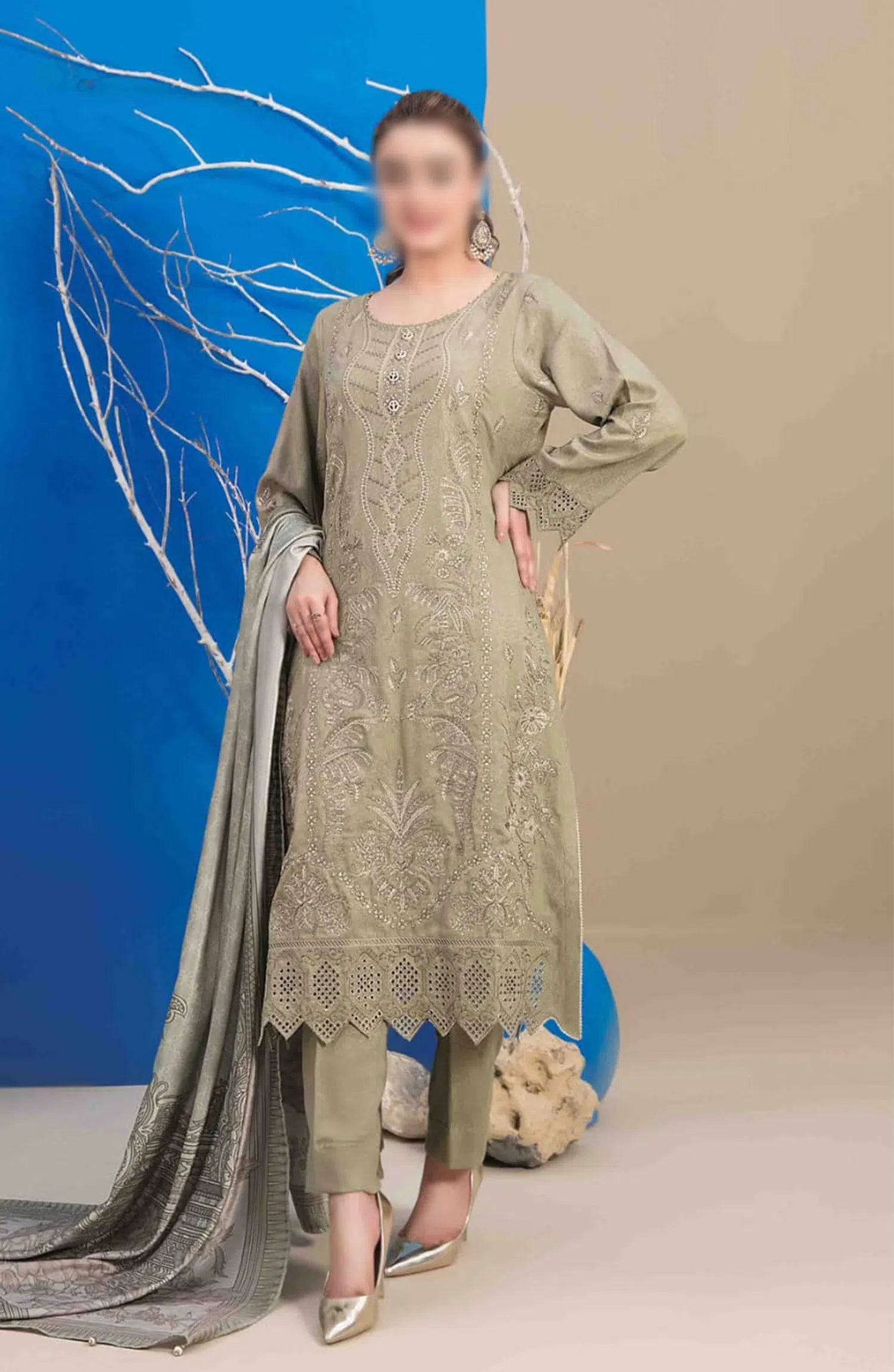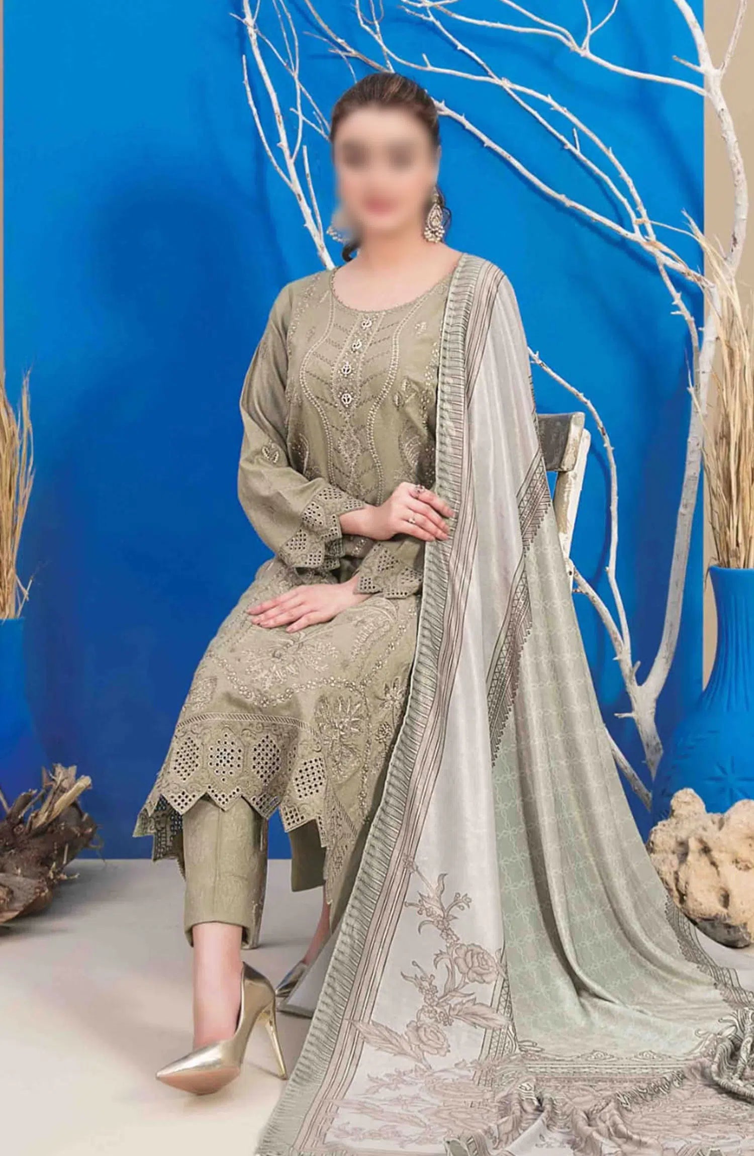 Rua by Casual Lite Embroidered Premium Linen Stitched 3 Piece Suit - D-01 Olive Mustard Hue - CL25RU - Dhani - Winter Collection