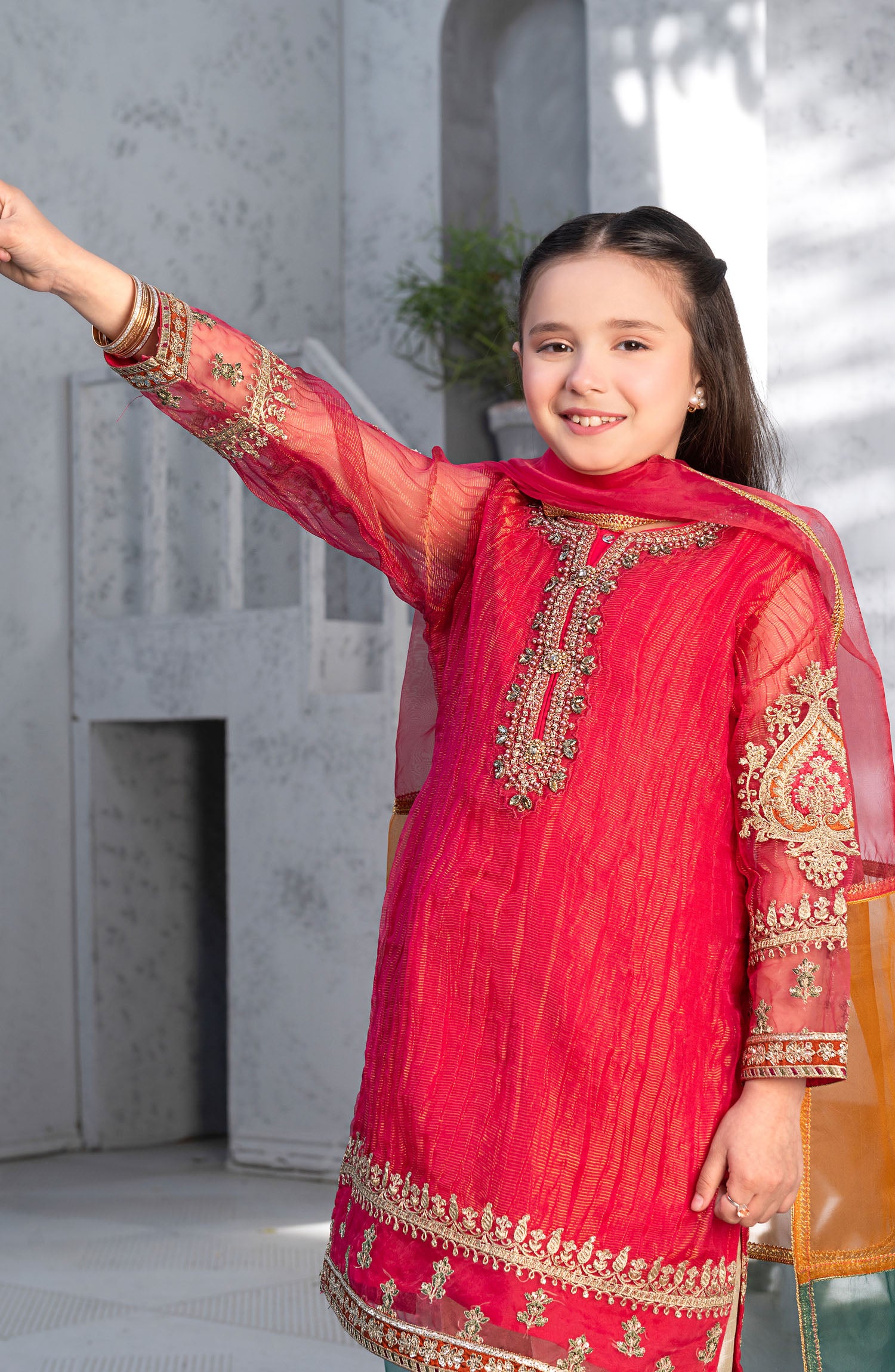 The standard style comes as a long-sleeved kameez with dupatta and trouser/shawlar.