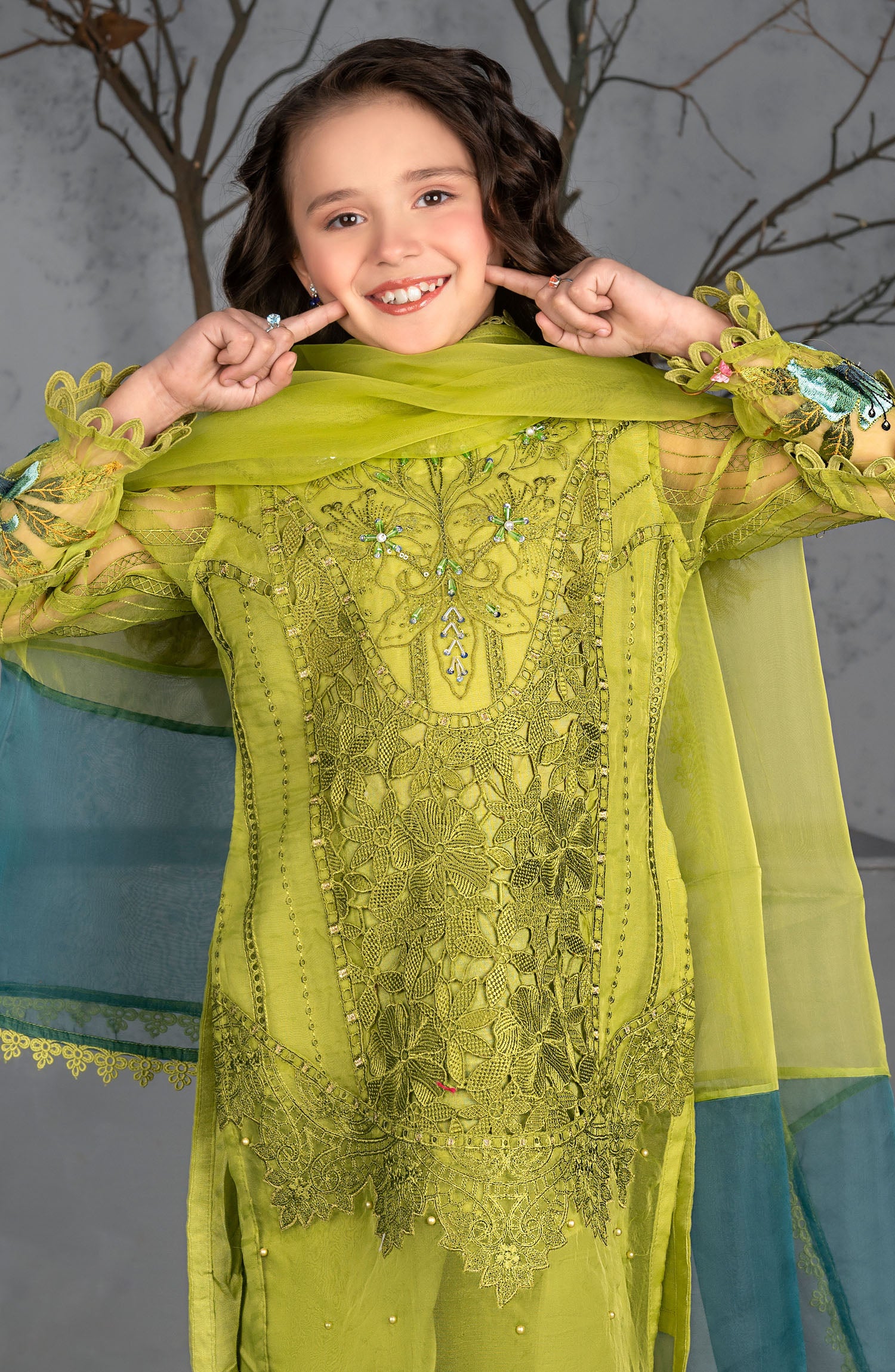 Organza shirt adorned with intricate embroidery, pearls, crystal embellishments, and delicate border laces