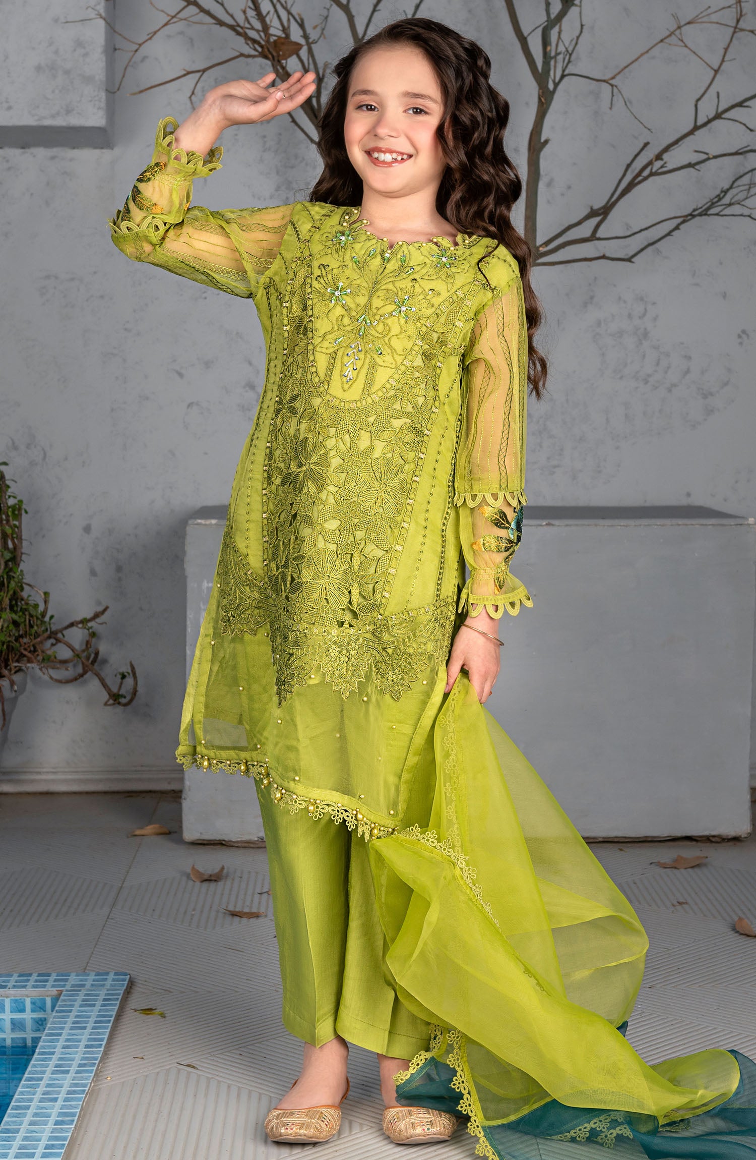 The standard style comes as a long-sleeved kameez with dupatta and trouser/shawlar.