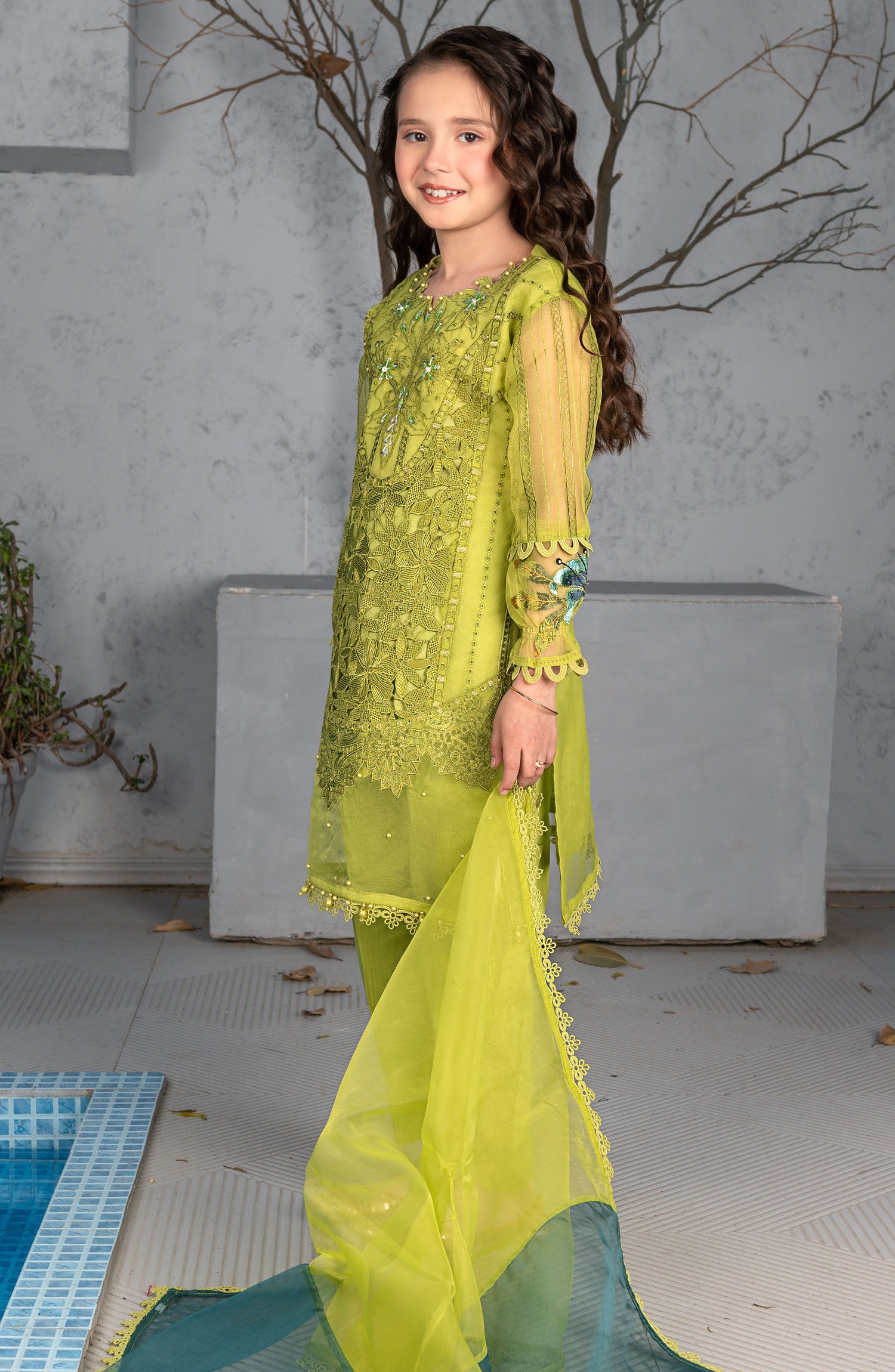 Organza dupatta featuring elegant lace detailing,
