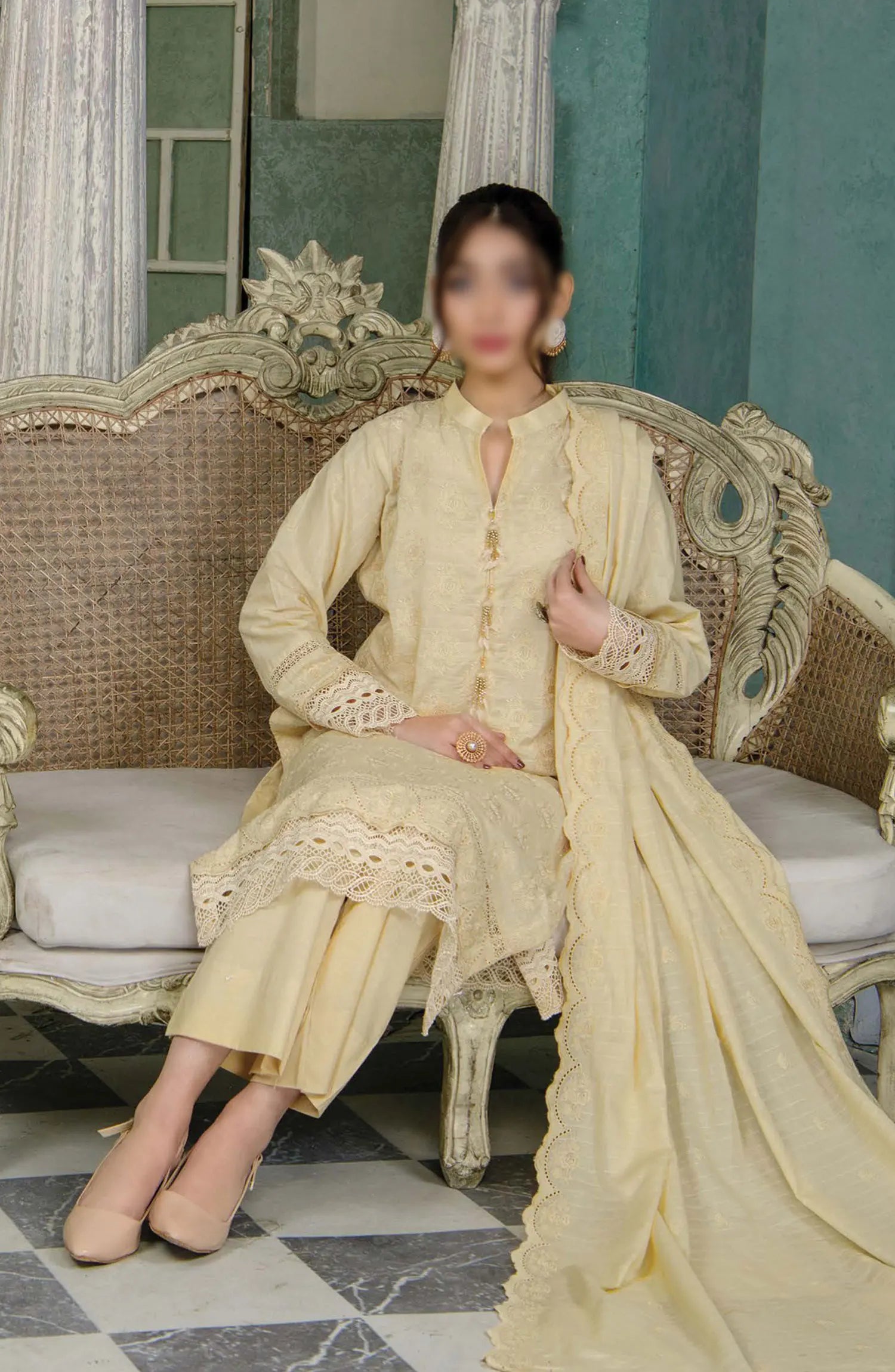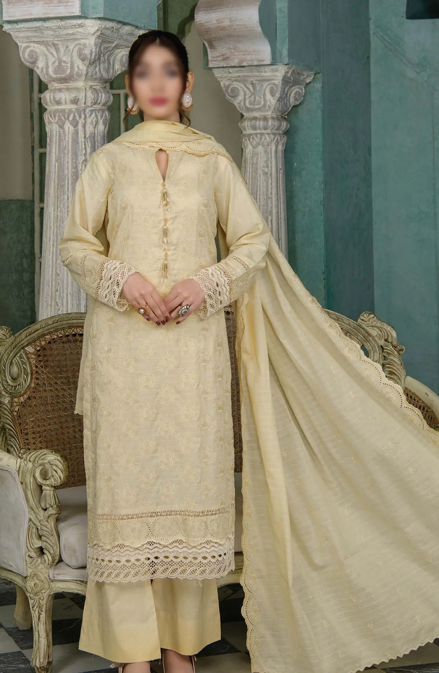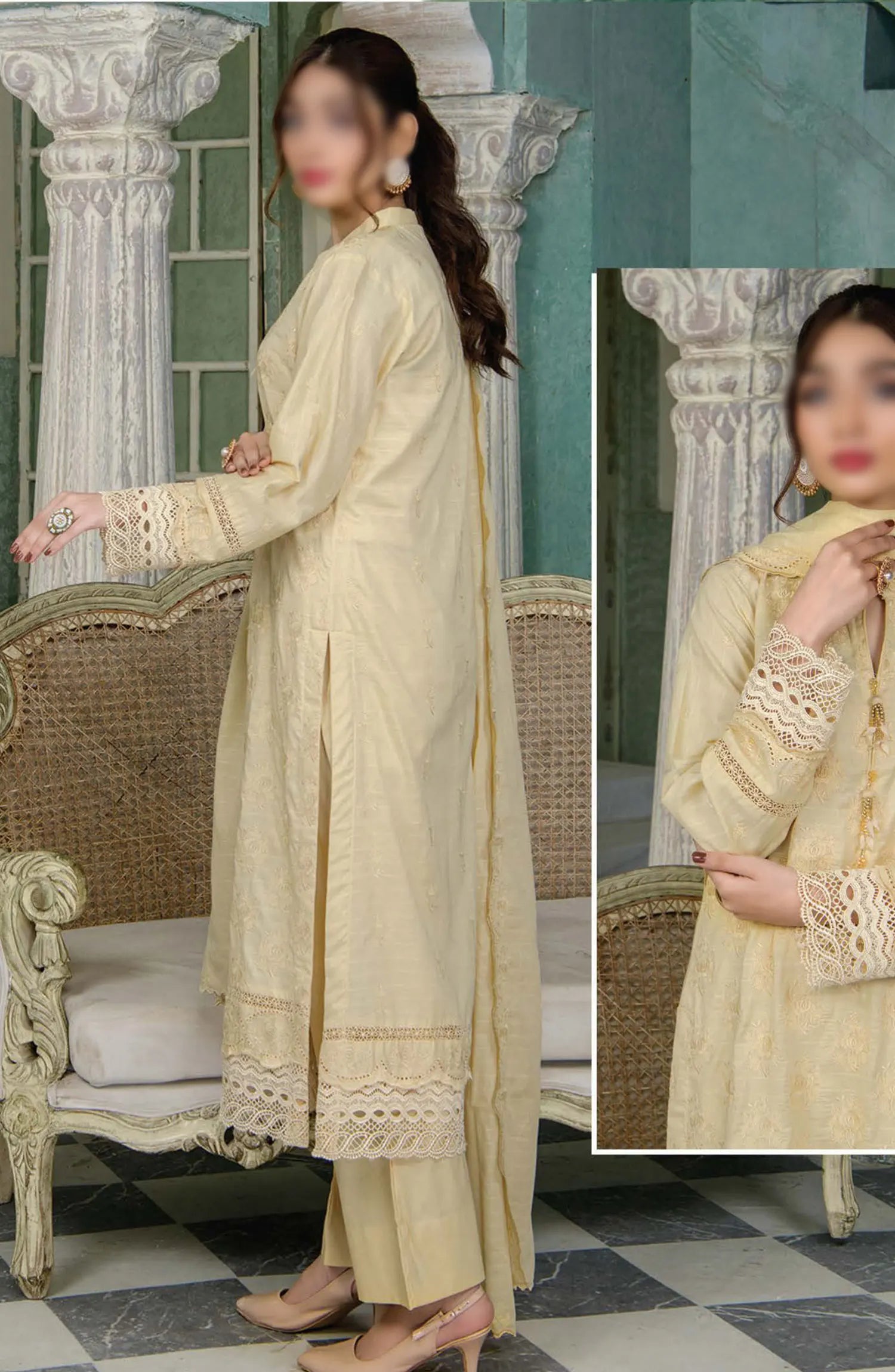 Meraki Exclusive Chikankari Embroidered Lawn Collection 2024 has been styled in the image for photography and illustrative purposes.