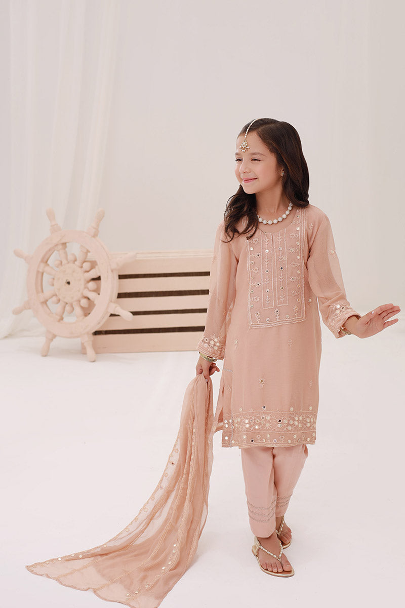 Merakish Kids Embroidered Chiffon Collection 2023 has been styled in the image for photography and illustrative purposes.
