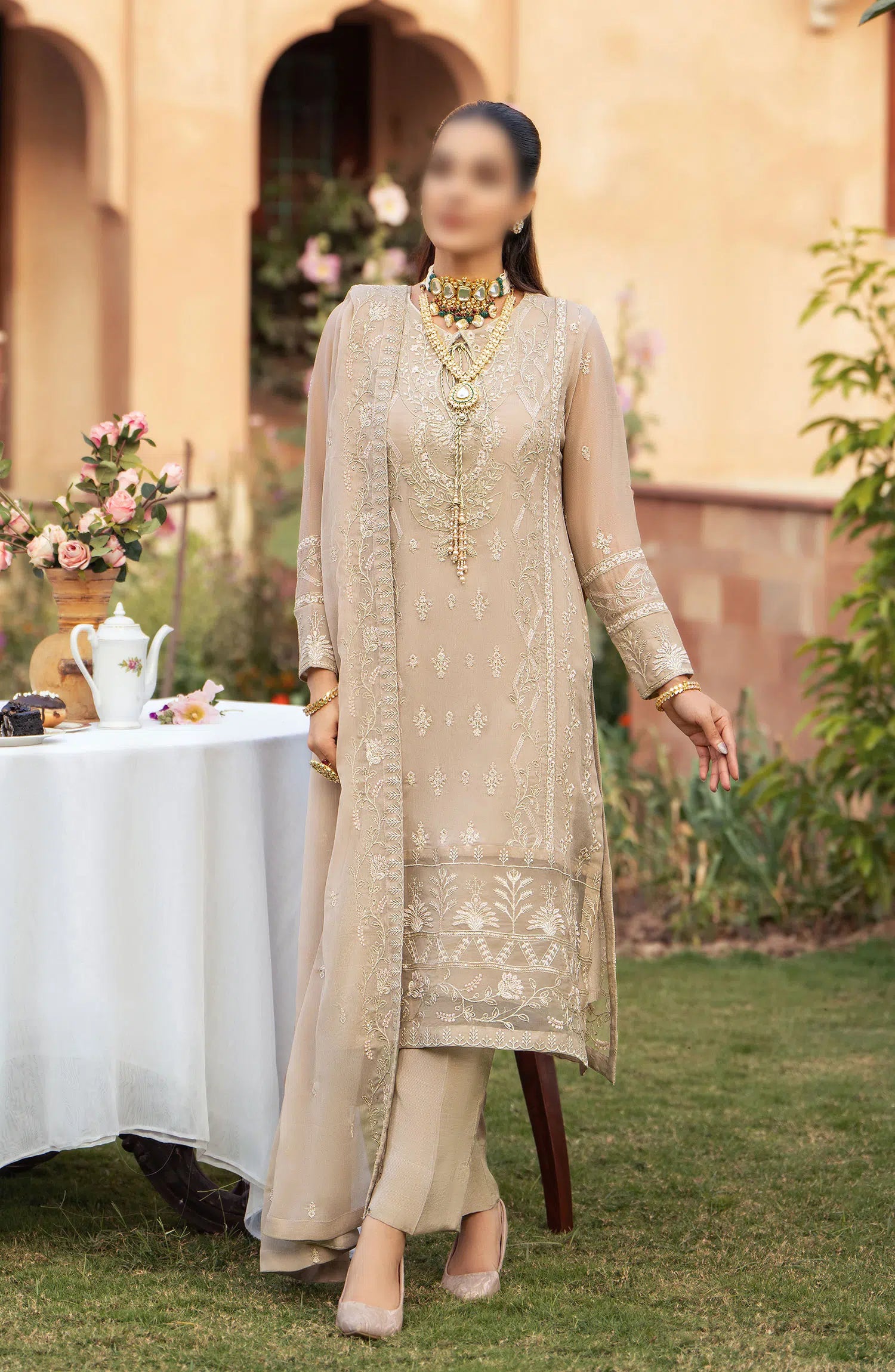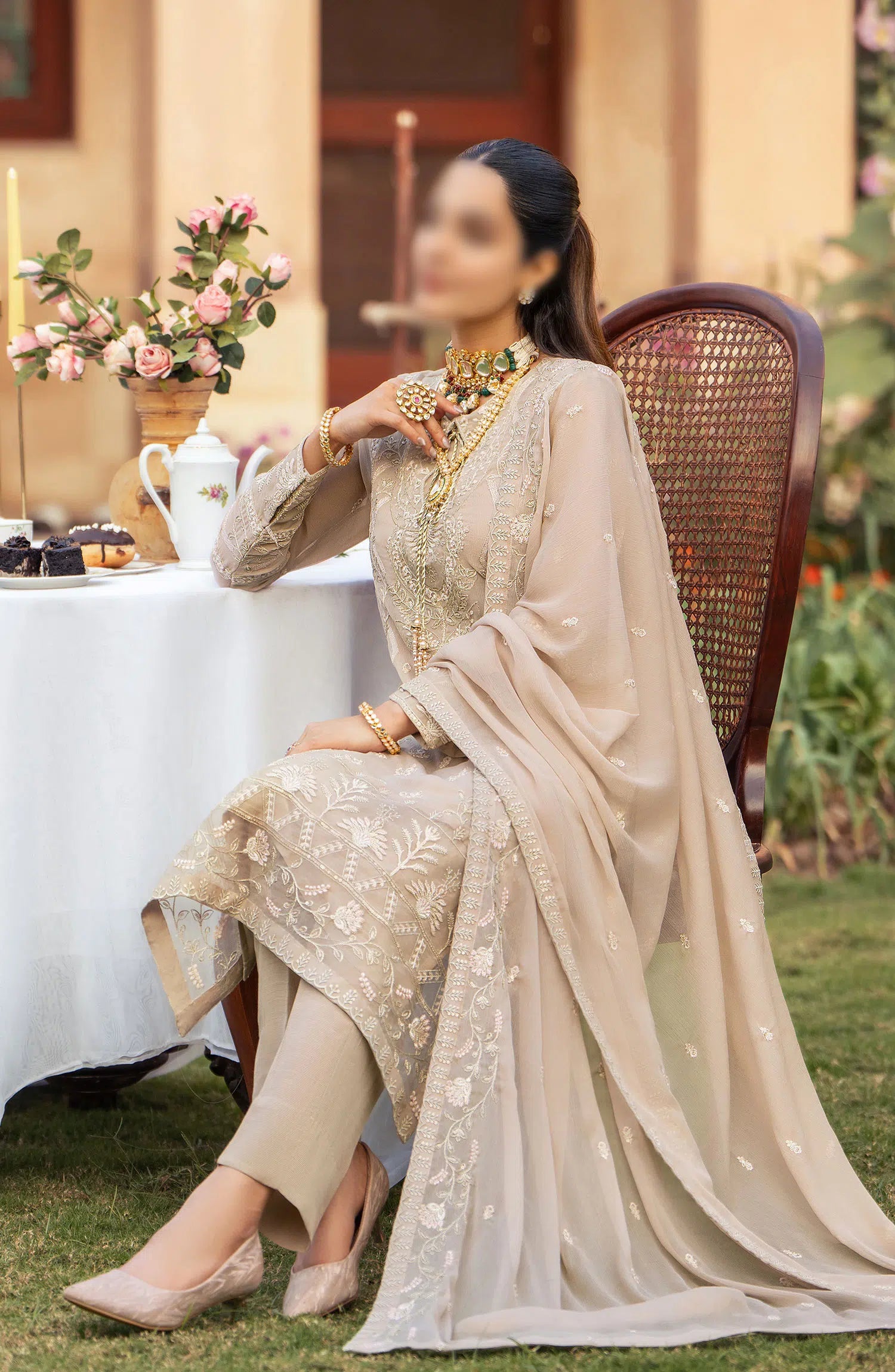 Merakish Unstitched Luxury Chiffon Formal Collection 2024 has been styled in the image for photography and illustrative purposes.