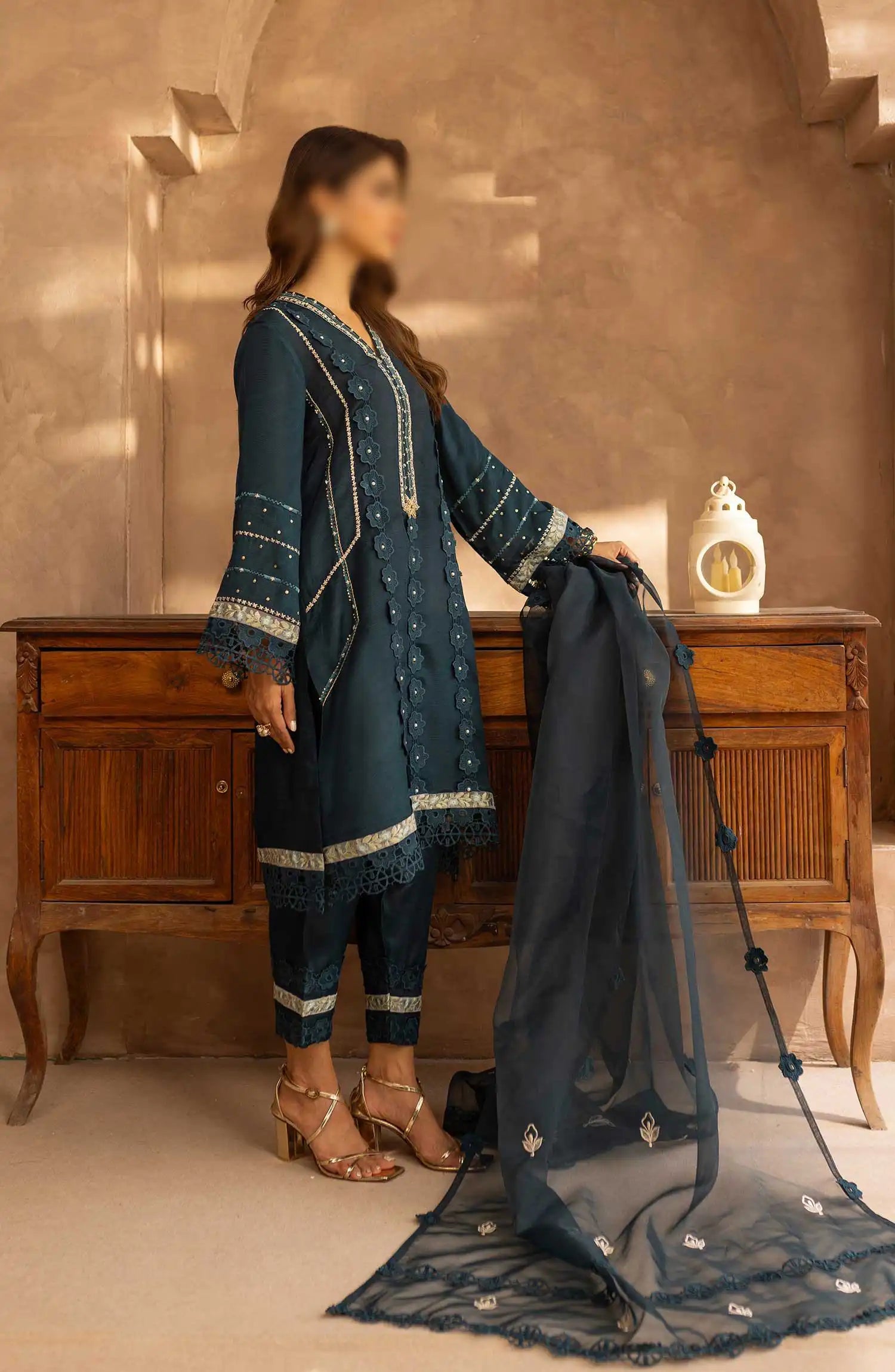 Shafaq by Riaz Arts Luxury Embroidered Peach Leather Unstitched 3 Piece Suit - Design-03 - RA25SHQ - Blue - Winter Collection