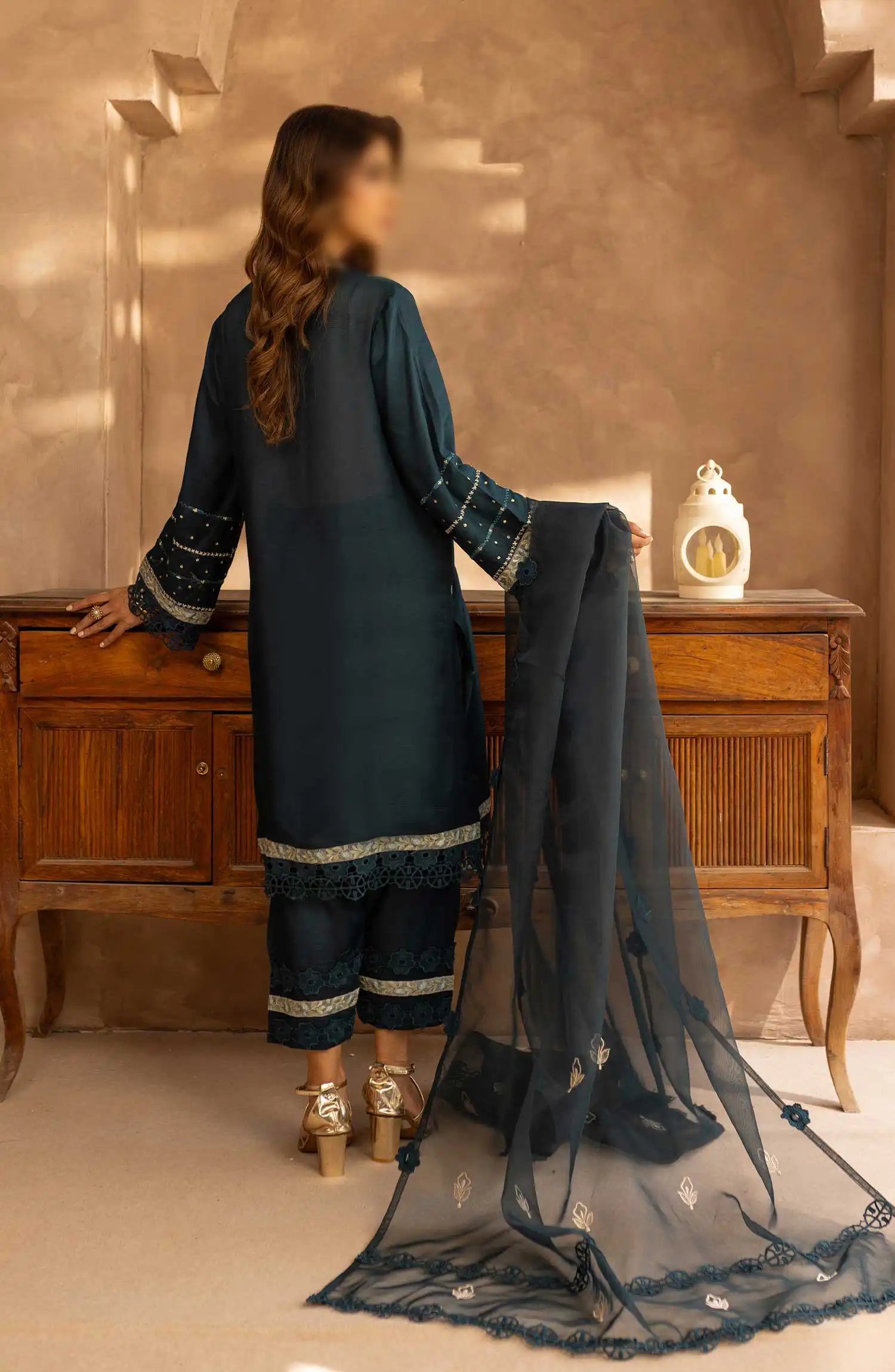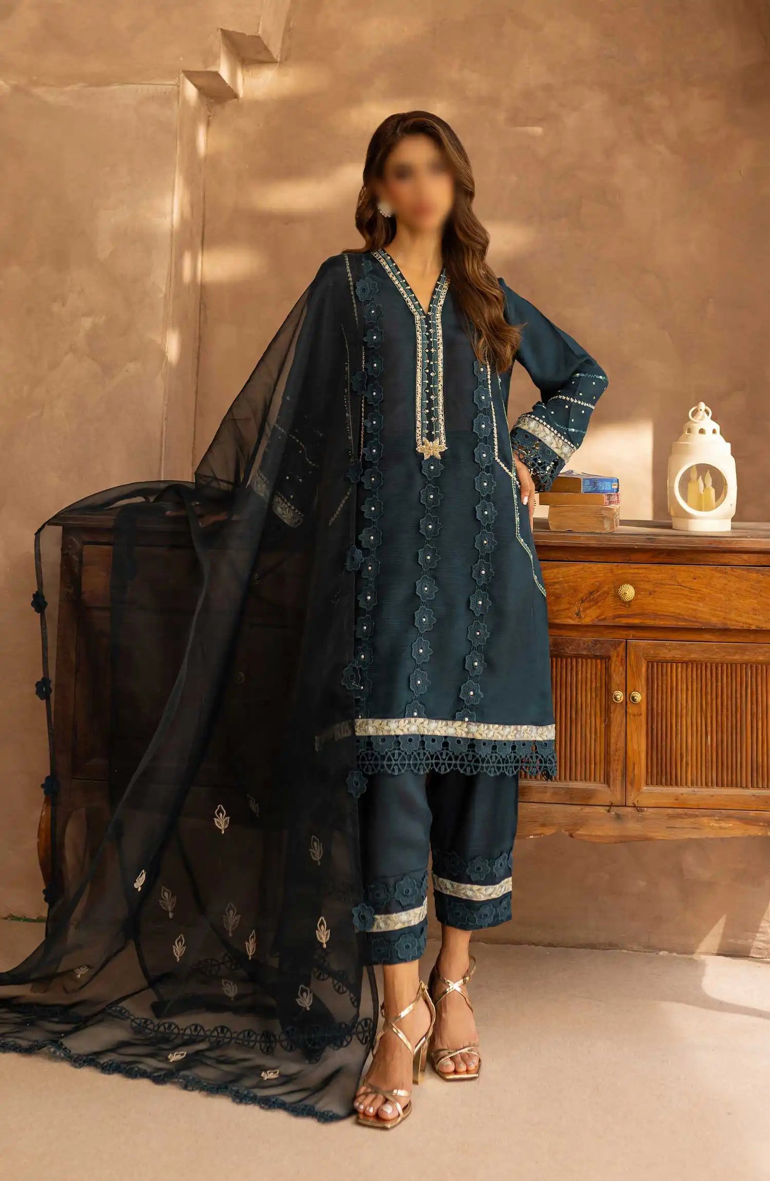 Merakish Zunairi Raw Silk Hand Work Embellished Collection - Prussian blue