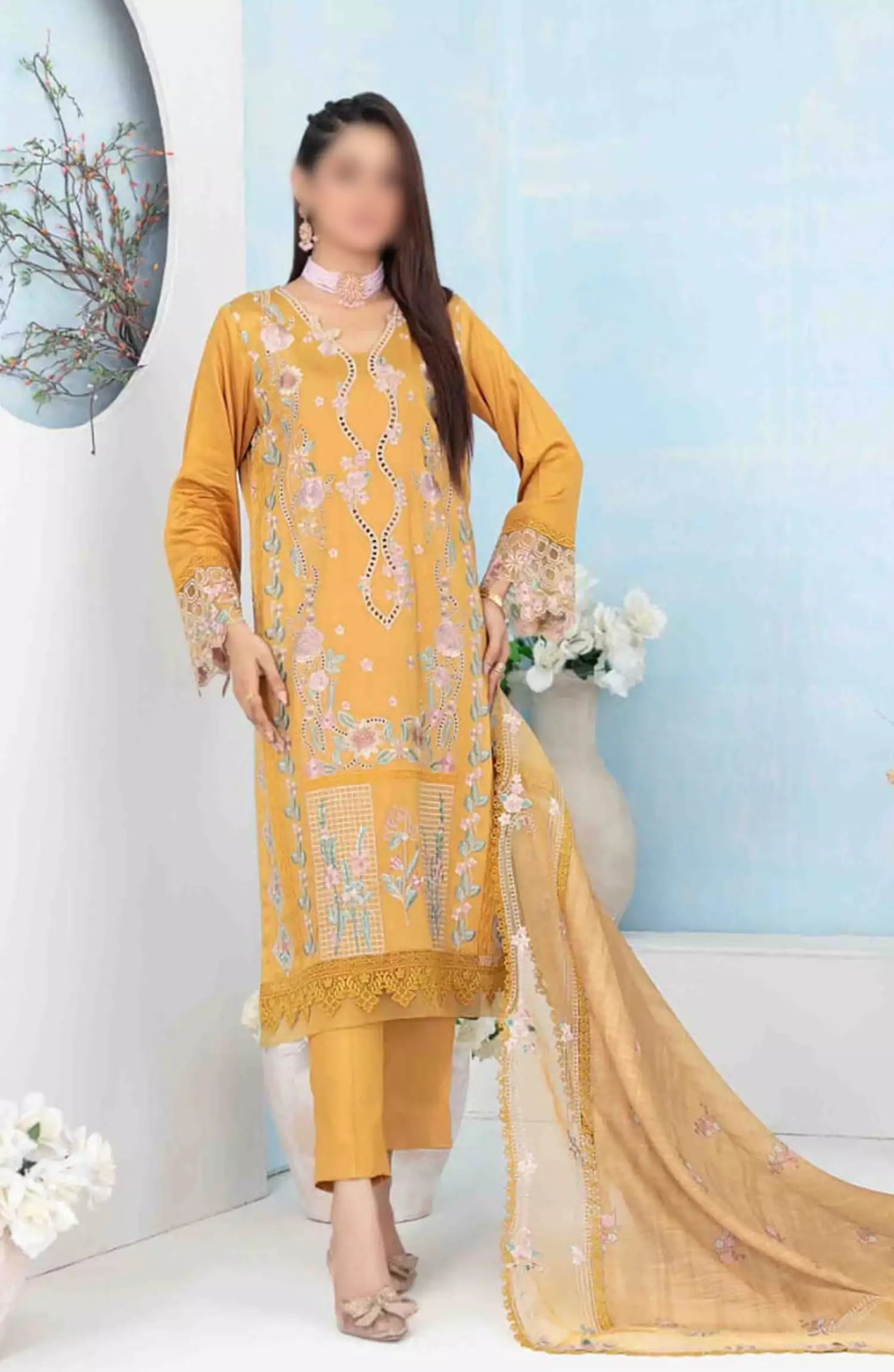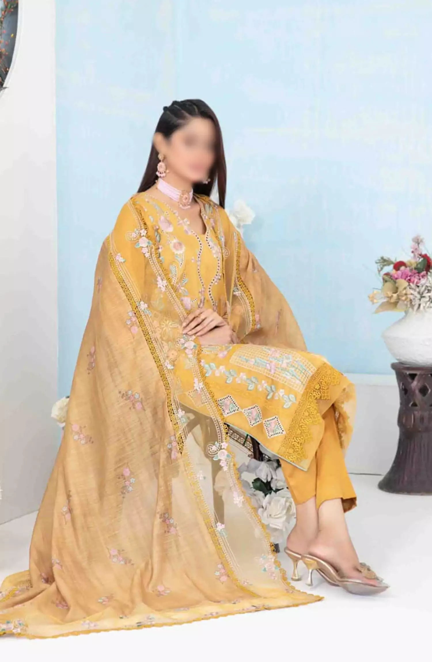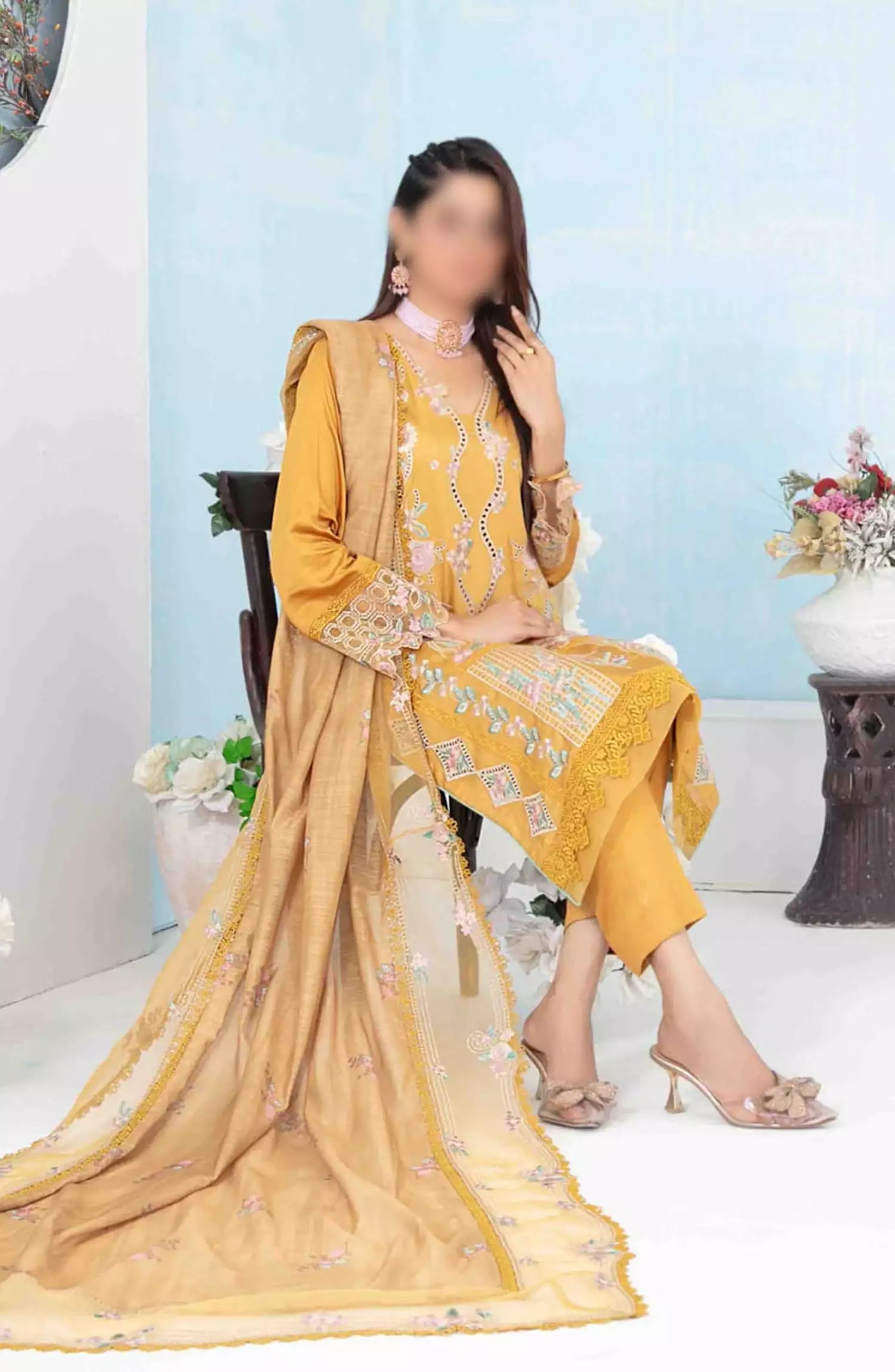 Queen Embroidered Sweet Peach Unstitched 3 Piece Suit - Design-01 - QU25SW - Mustard - Winter Collection