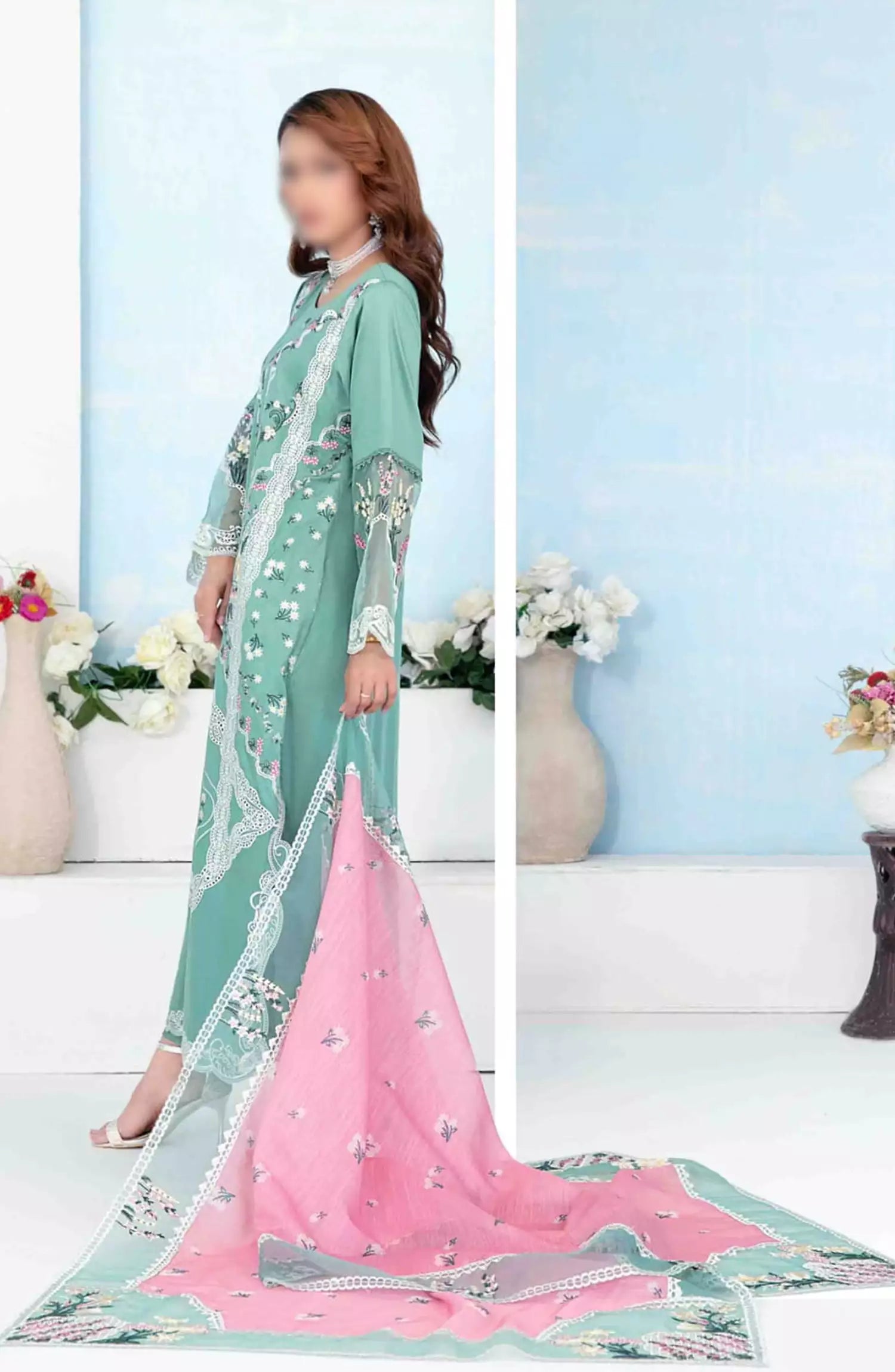 The standard style comes as a long-sleeved kameez with dupatta and trouser/shawlar.