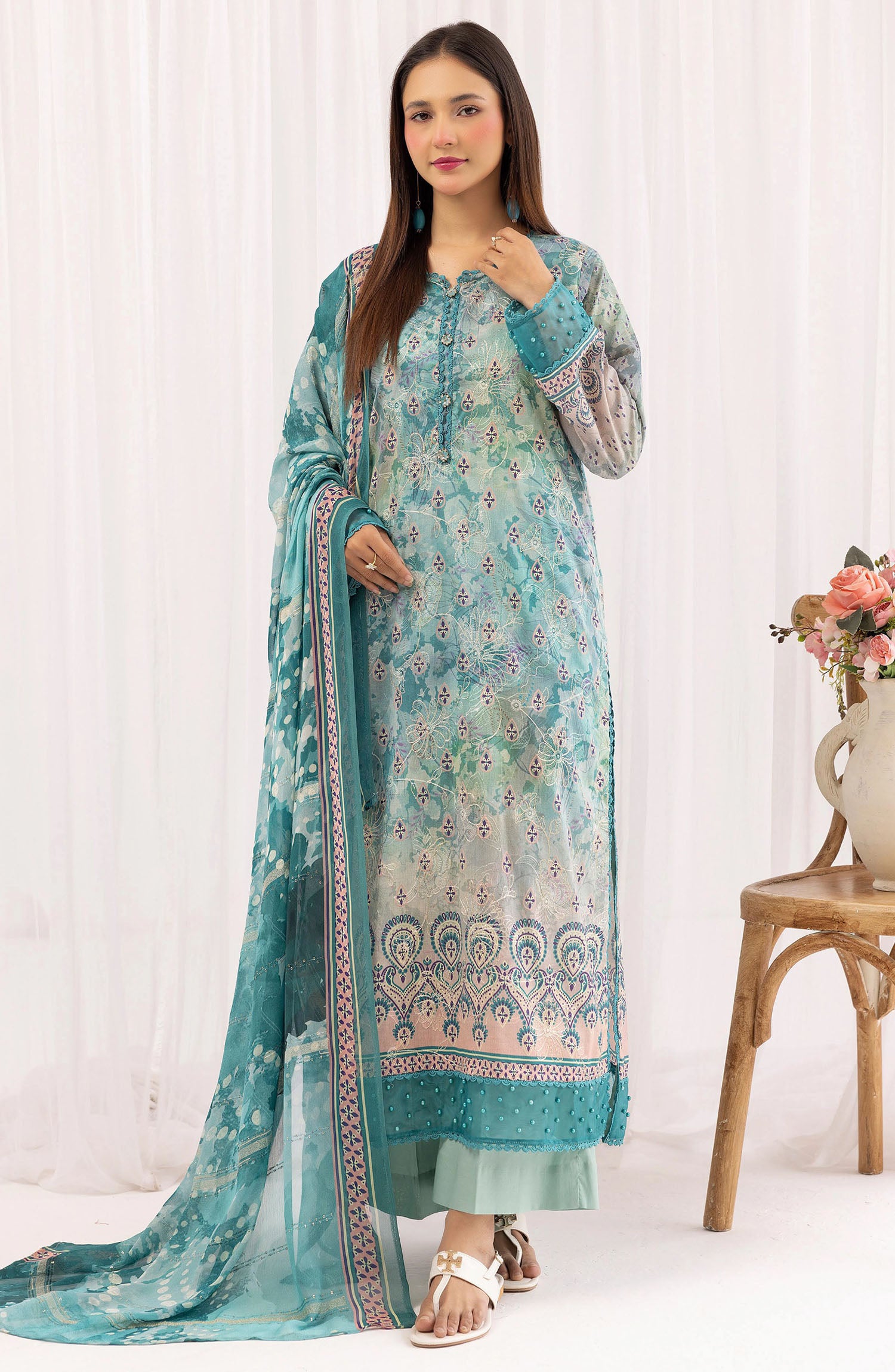 Modest Embroidered Chiffon Stitched 3 Piece Suit - 9615-Nblu - MOD25PRF - Blue - Festive Girls Collection
