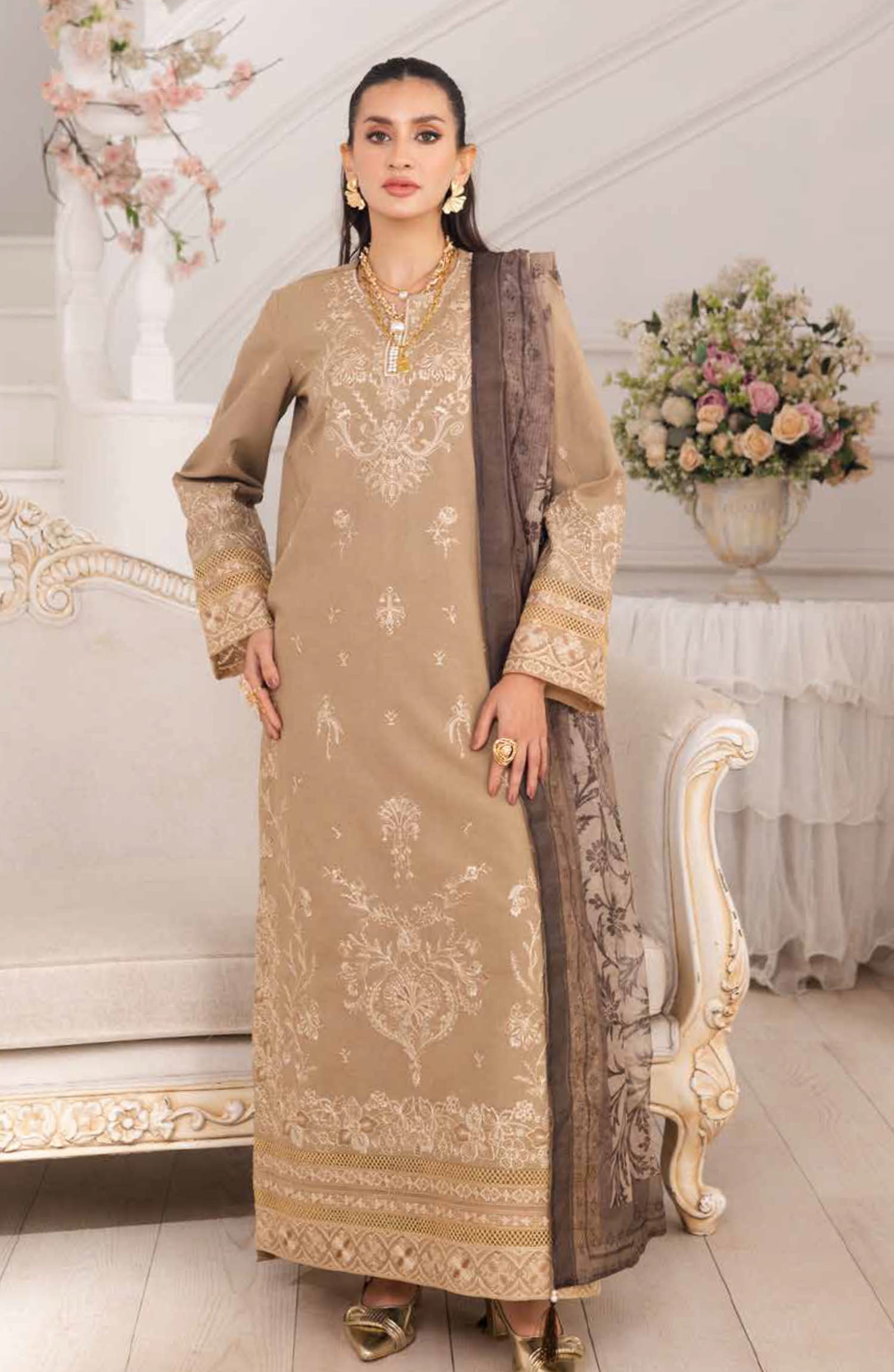 The standard style comes as a long-sleeved kameez with dupatta and trouser/shawlar.