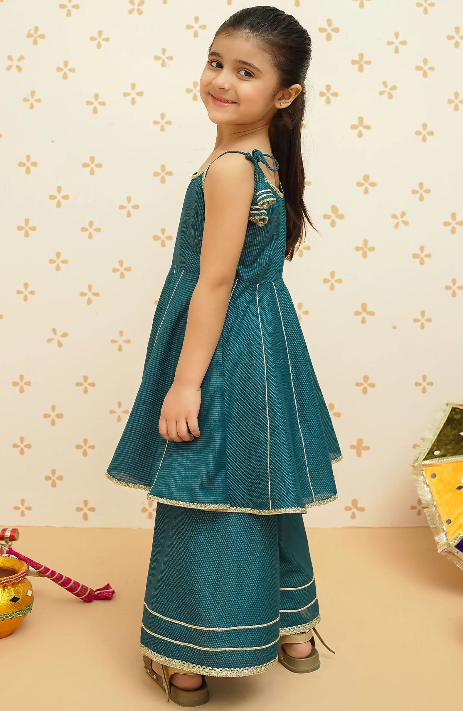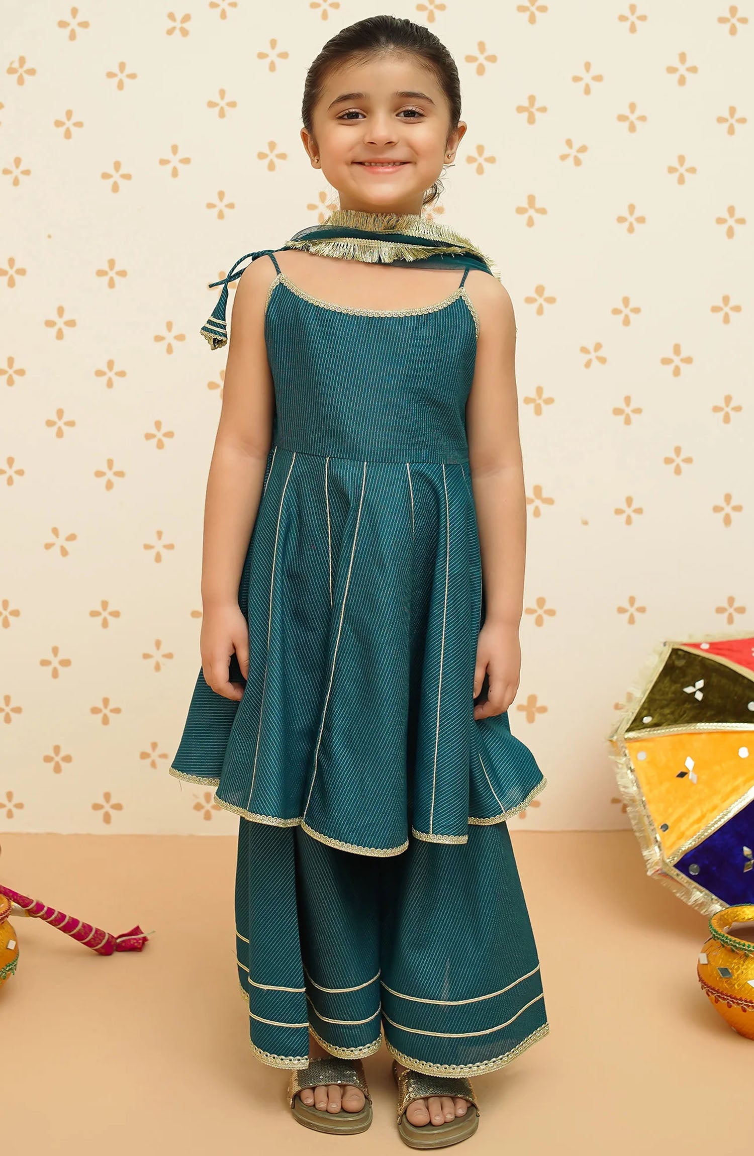 Detailing: This set features a sleeveless flared frock with intricate gota lace detailing,