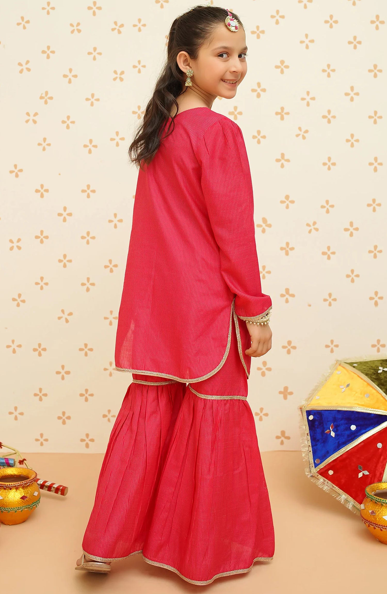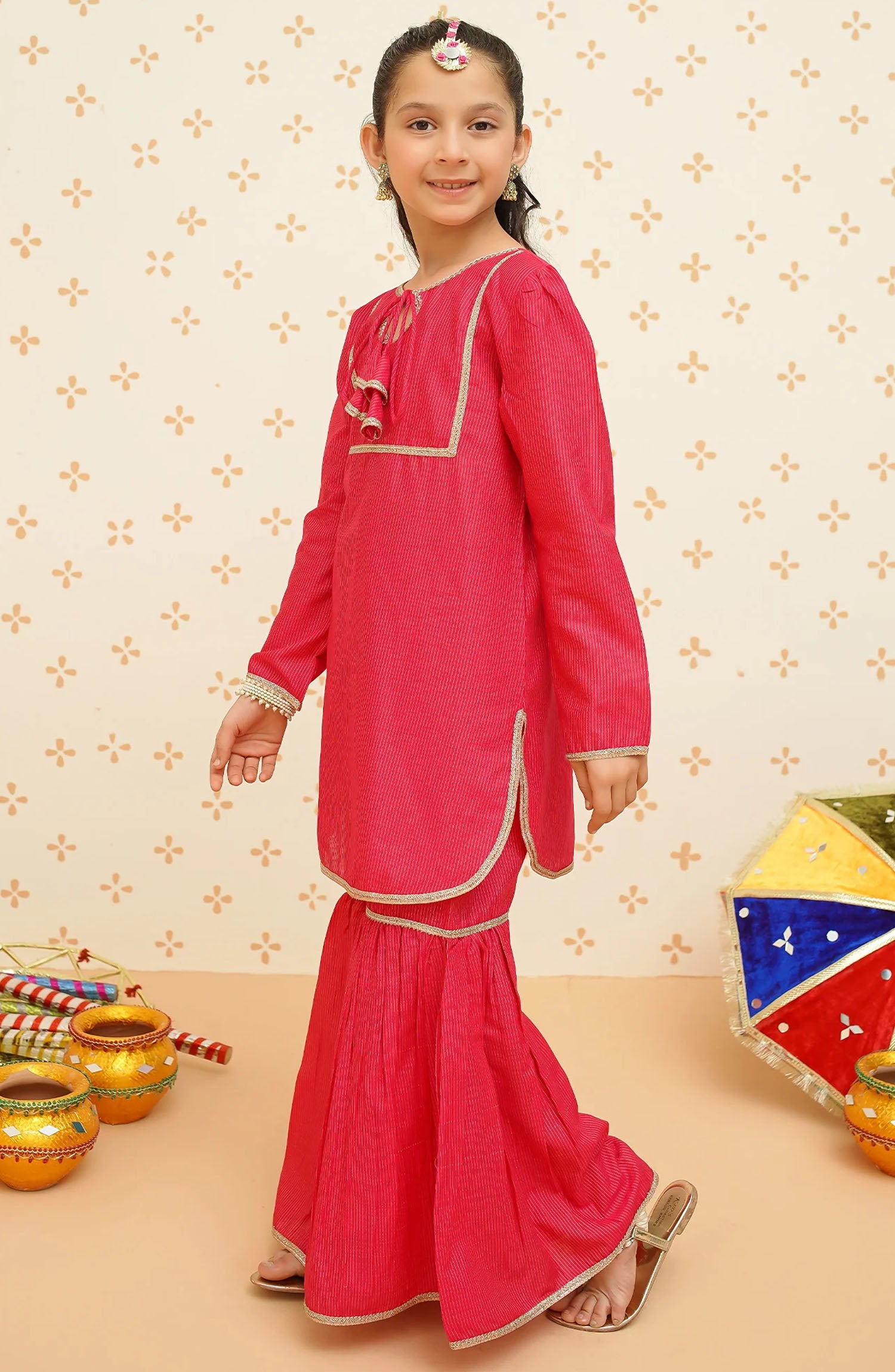 Detailing: The long-sleeved kurti features a charming square neckline with delicate tassels and gota lace accents, adding a traditional touch. Paired with a flowy gharara, detailed with matching gota work, this outfit is the epitome of grace and style. A coordinated dupatta completes the ensemble, making it perfect for special celebrations. Perfect for Eid, weddings, and cultural festivities!