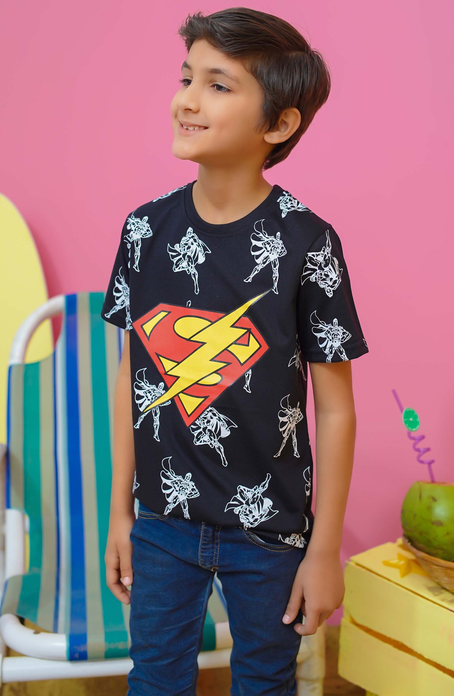 Home Modest Casual Jersey Stitched T-Shirt - BS2404-Blk Superman Graphic Tee - MOD25STS - Black - Casual Collection