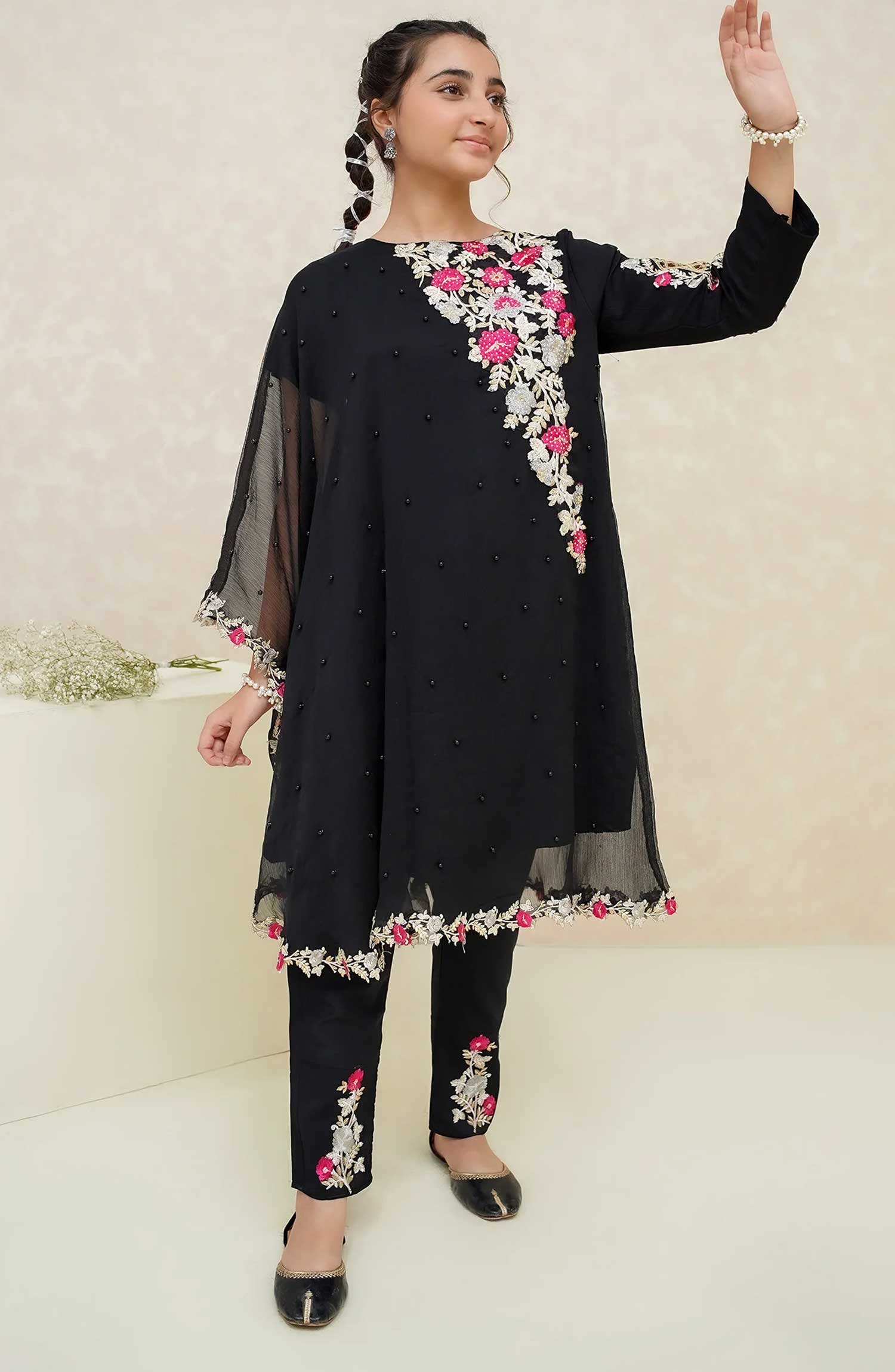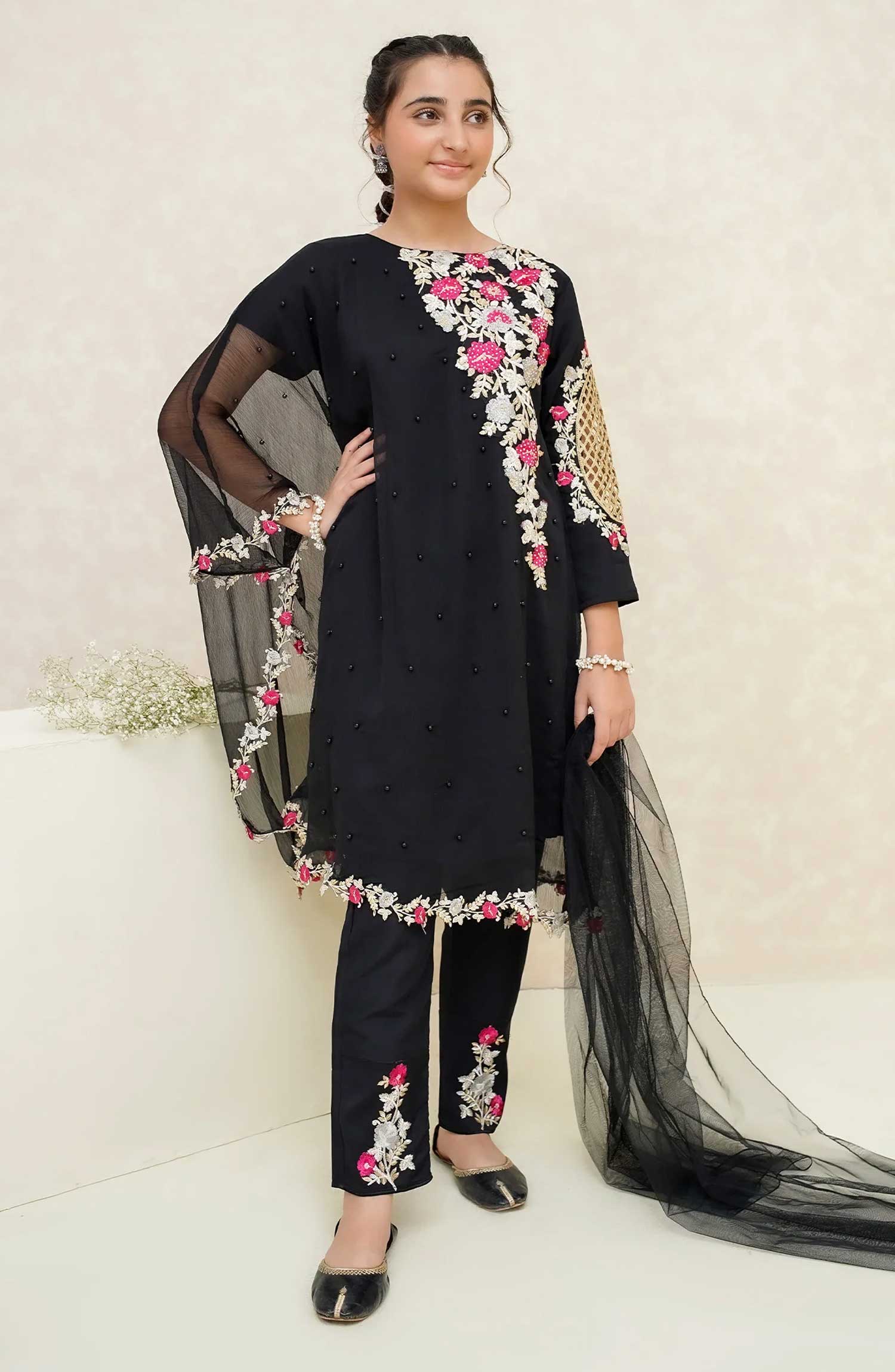 Modest Embroidered Chiffon Stitched 3 Piece - Pearl Cape Dress - Black - MD25F - Festive Collection
