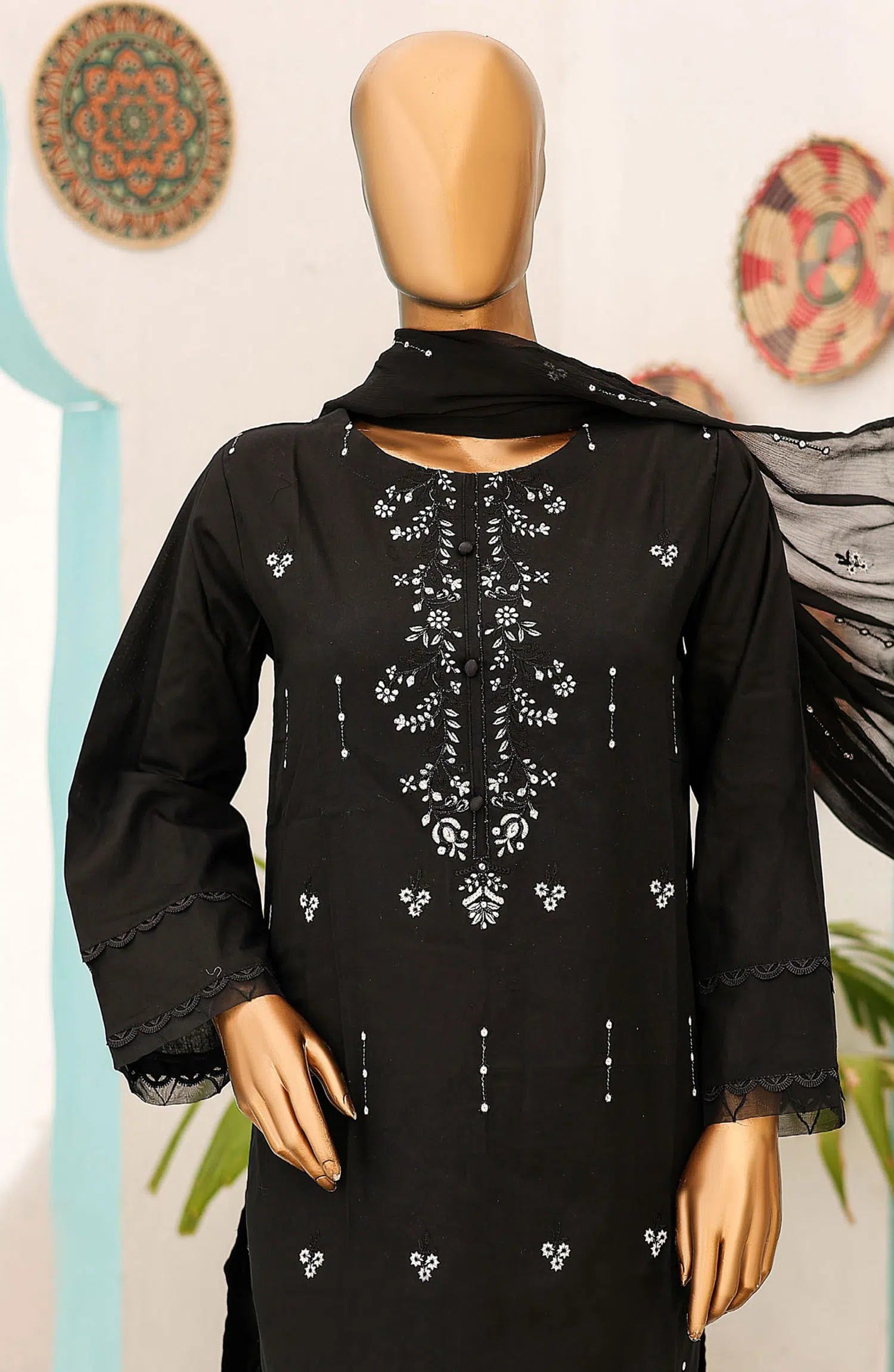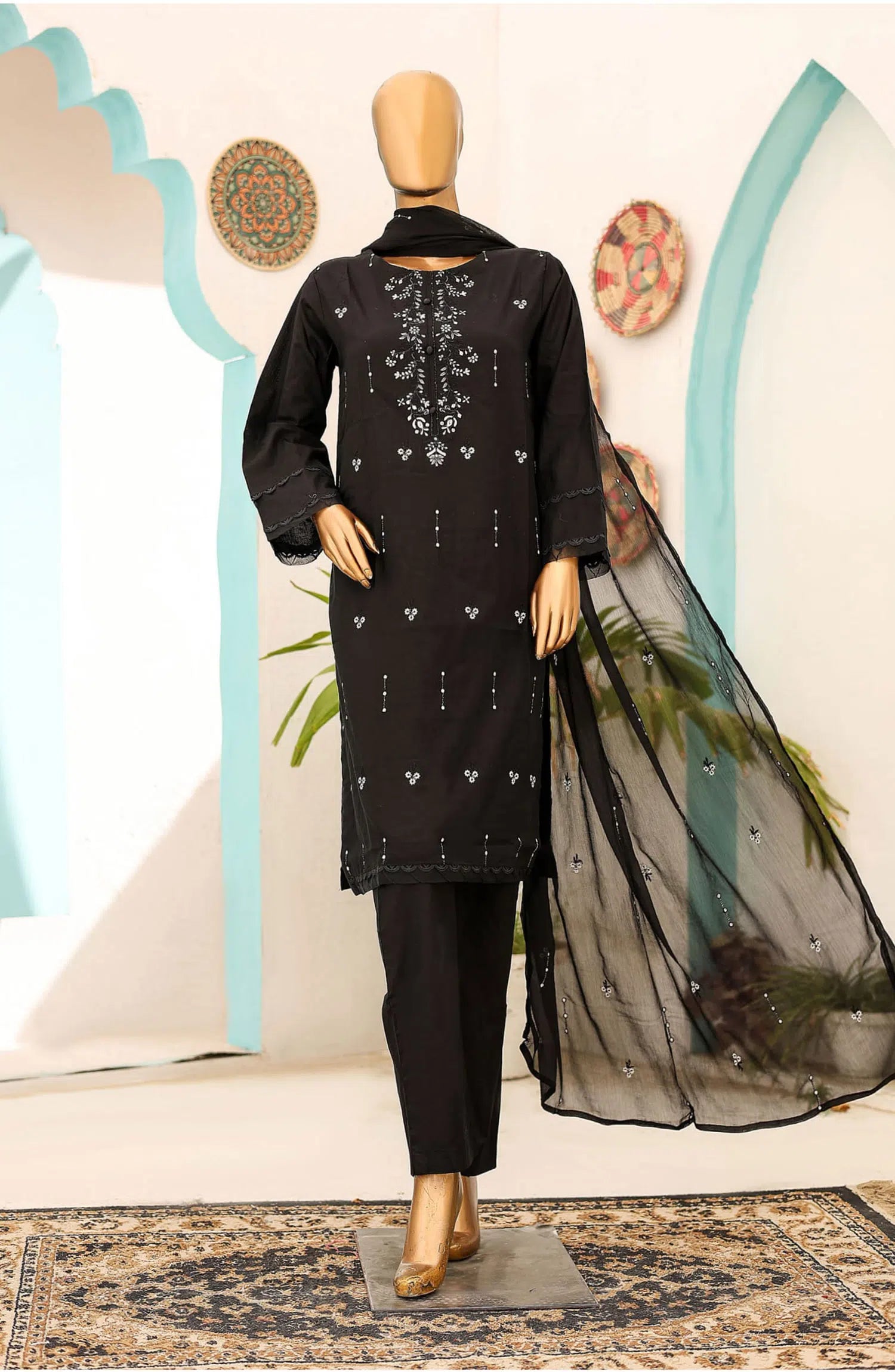 Monochrome Embroidered Lawn Collection by Naubahar has been styled in the image for photography and illustrative purposes.
