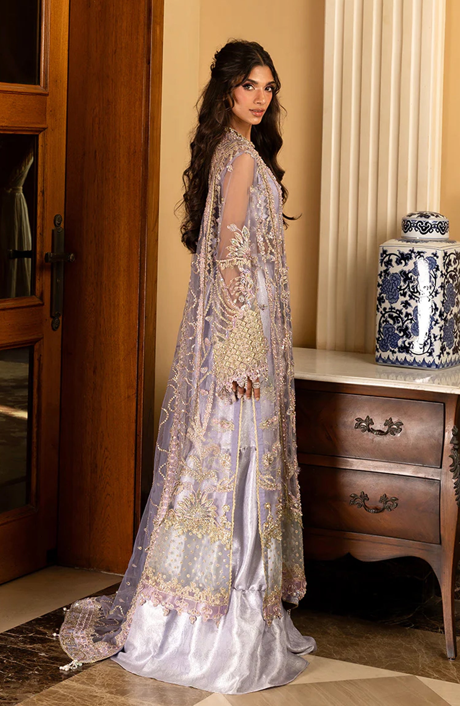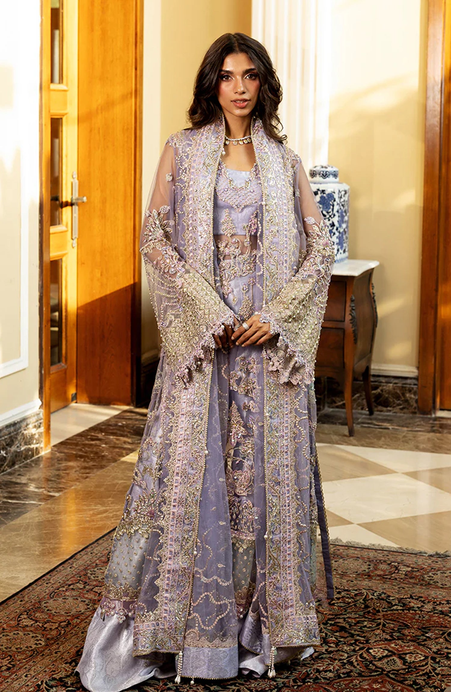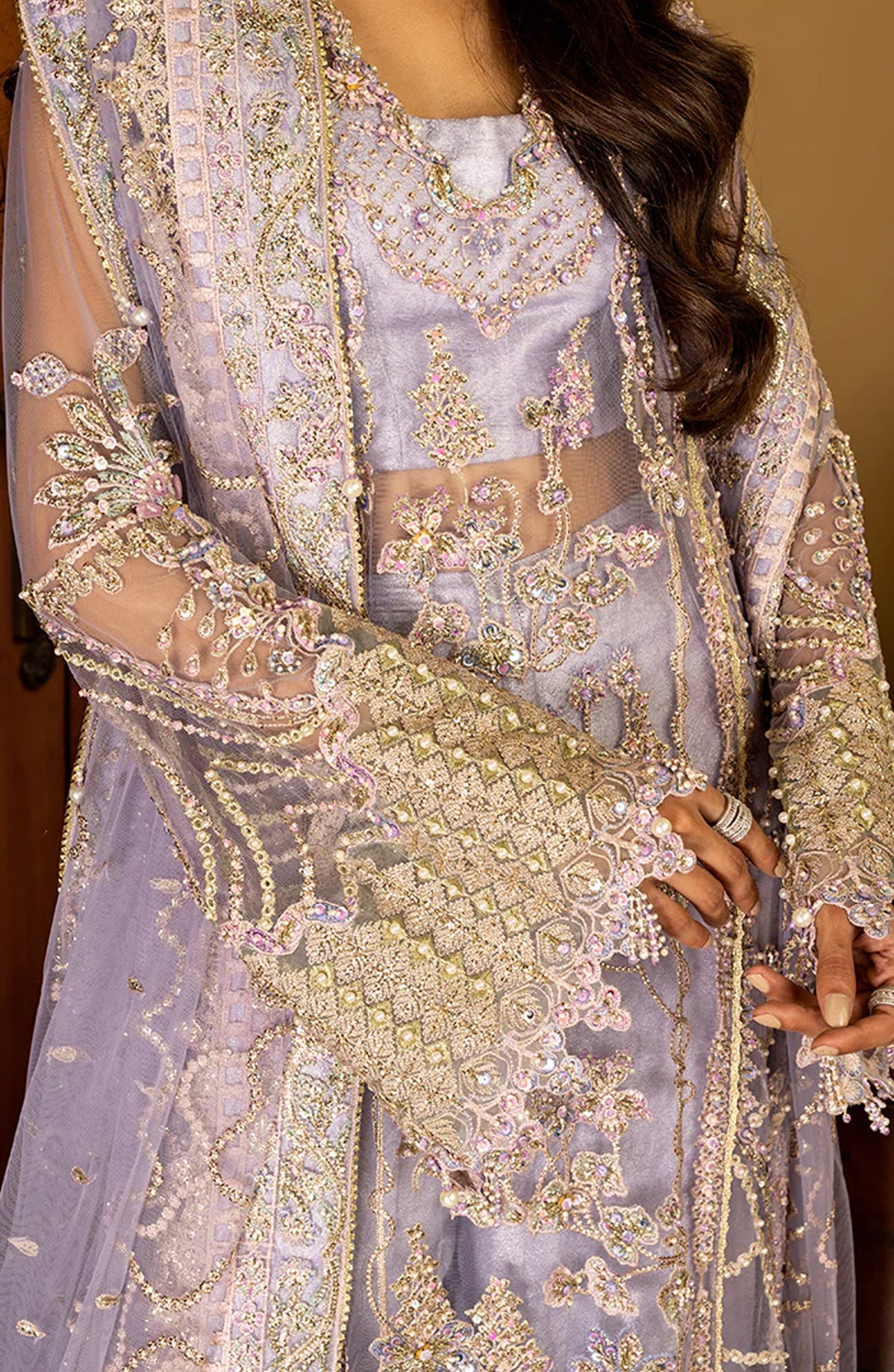• Embroidered, sequined & hand embellished front daman lace (organza)