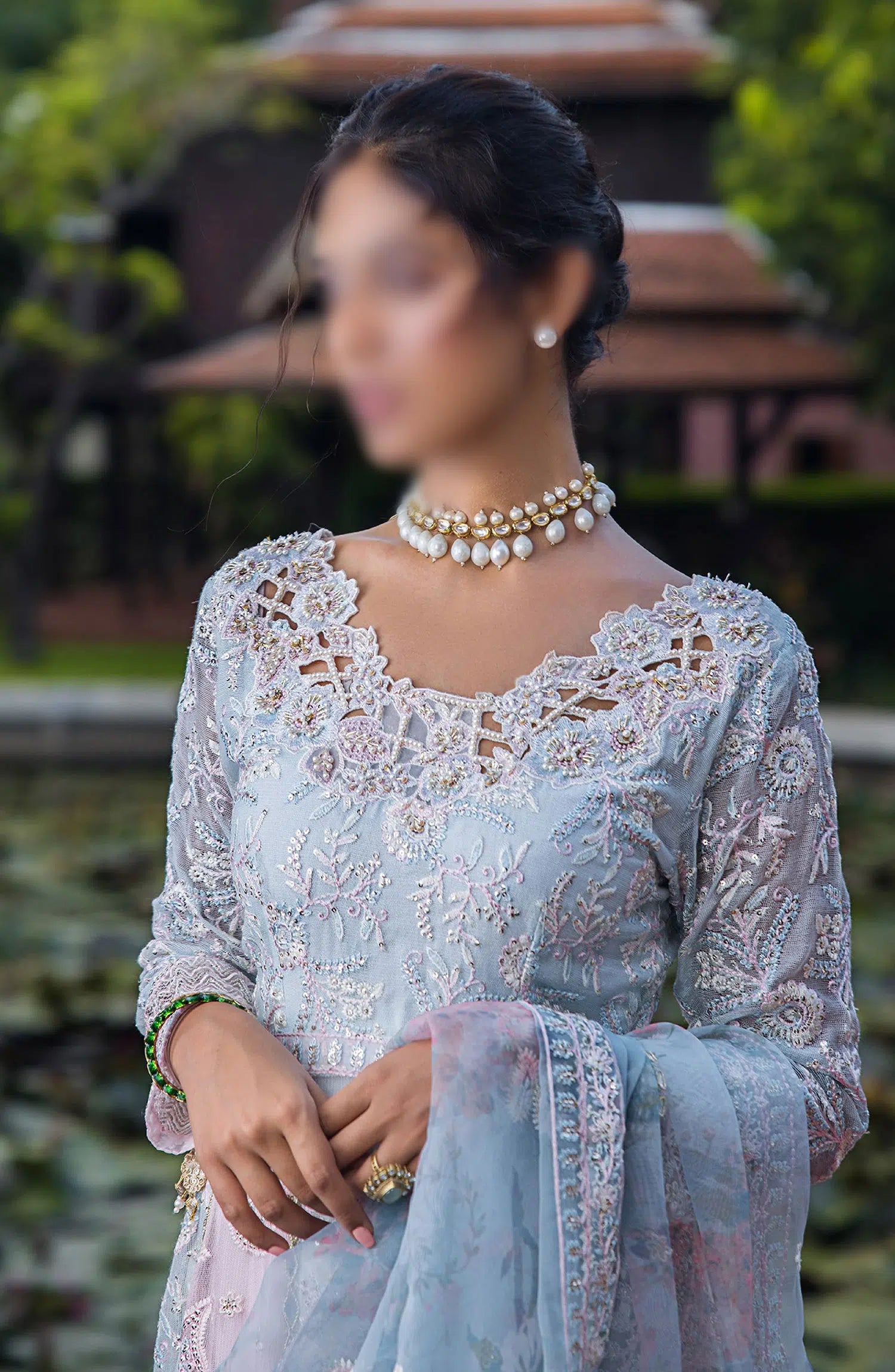 Embroidered, sequinned & hand embellished front neckline