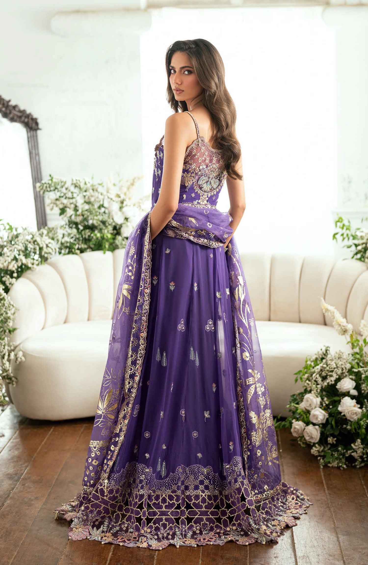 • Embroidered, sequinned pearl embellished front daman border (organza)