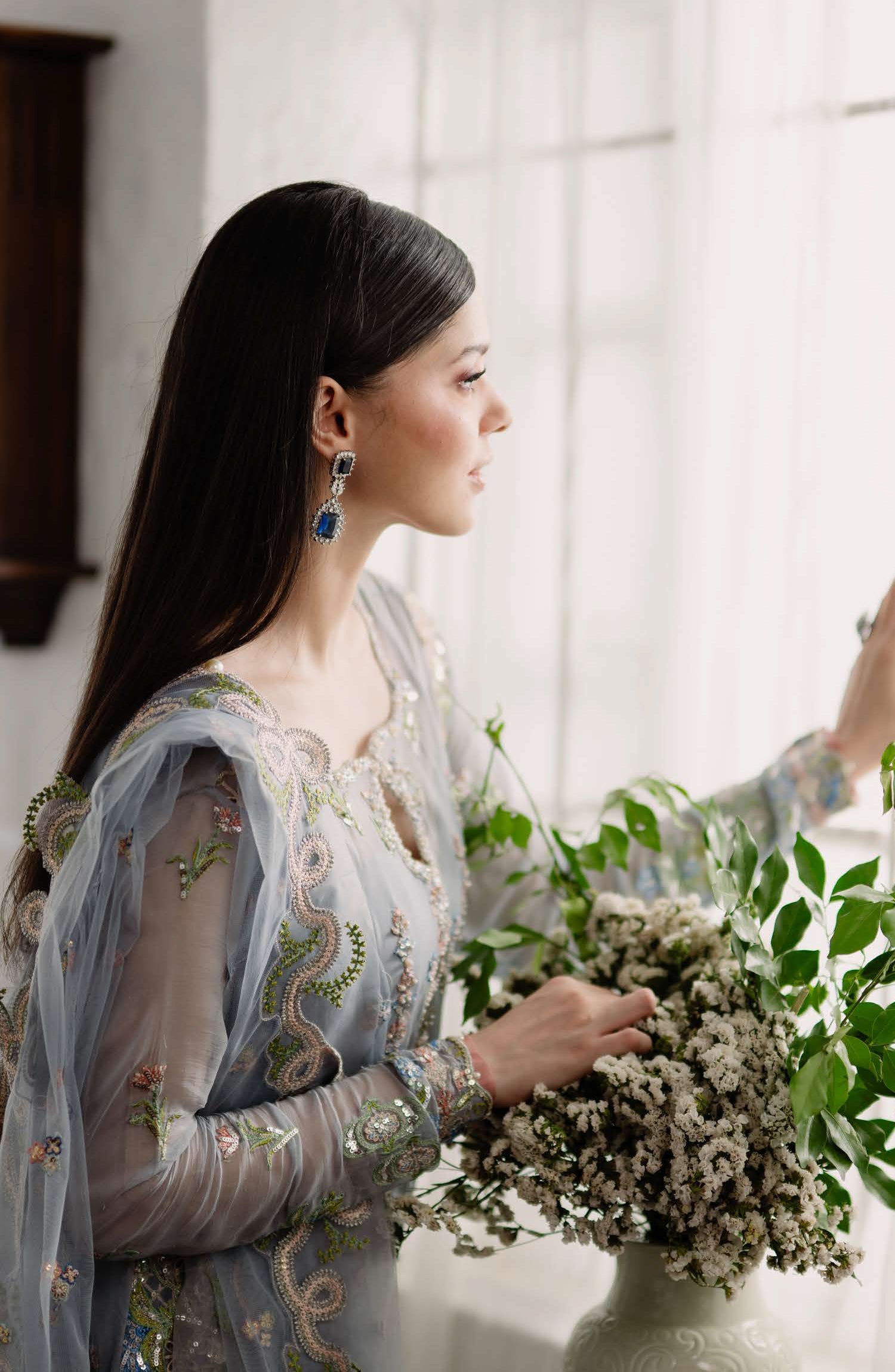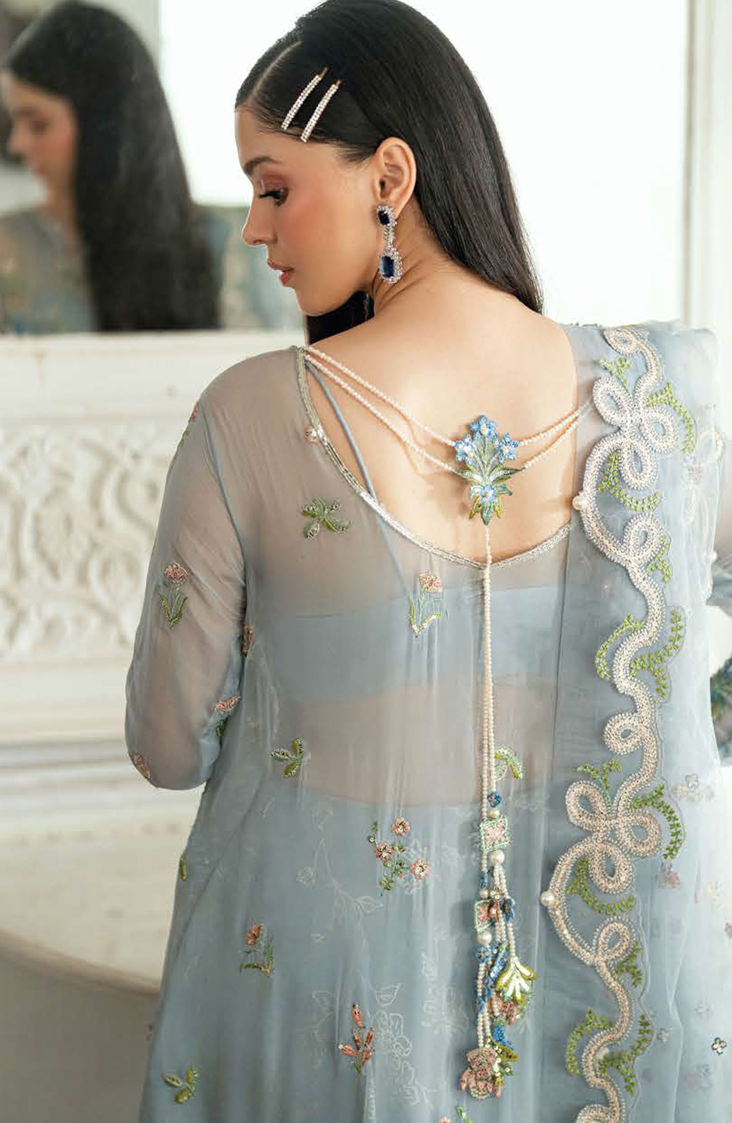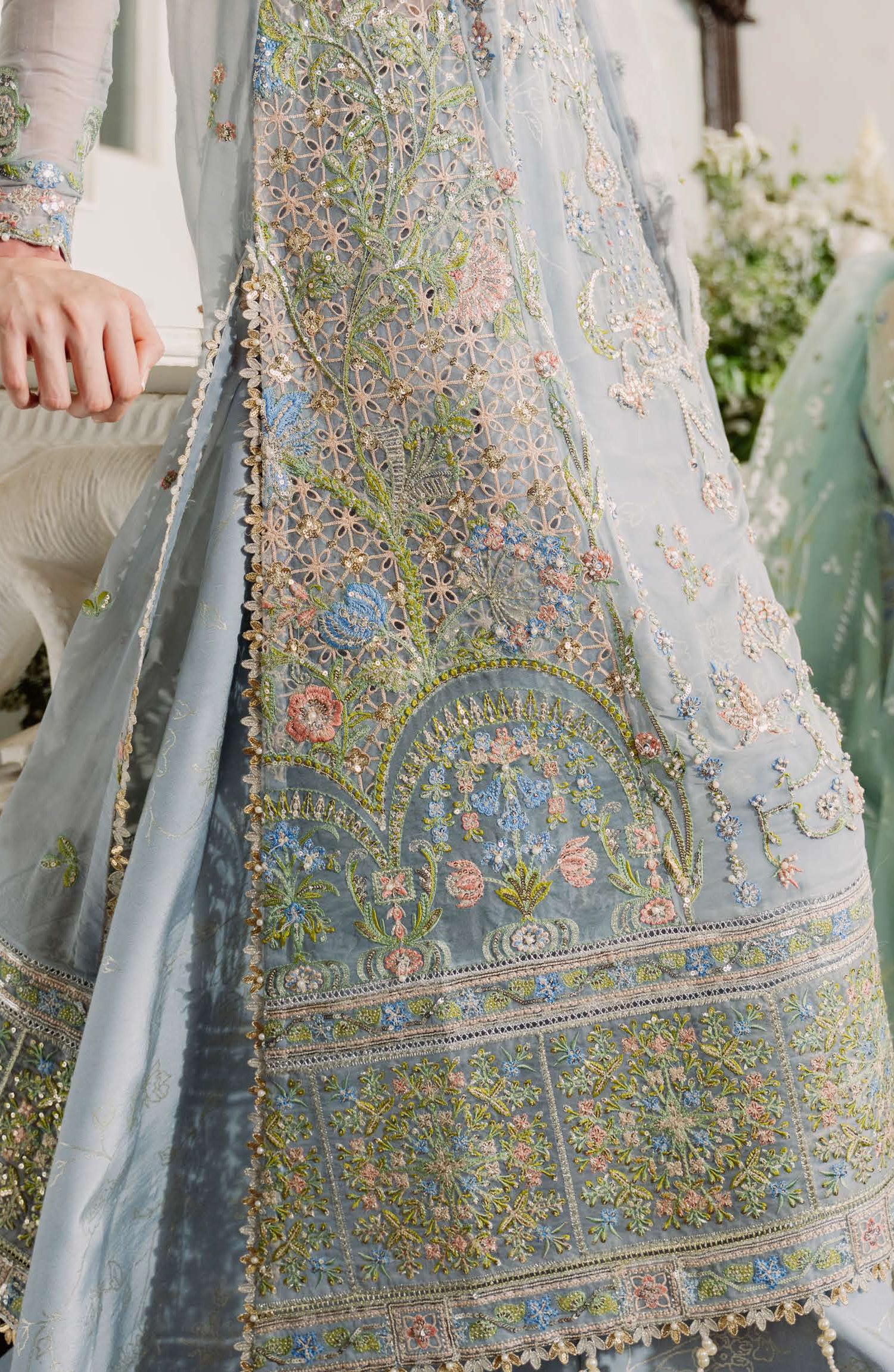 • Embroidered, sequinned pearl embellished front left panel (organza)