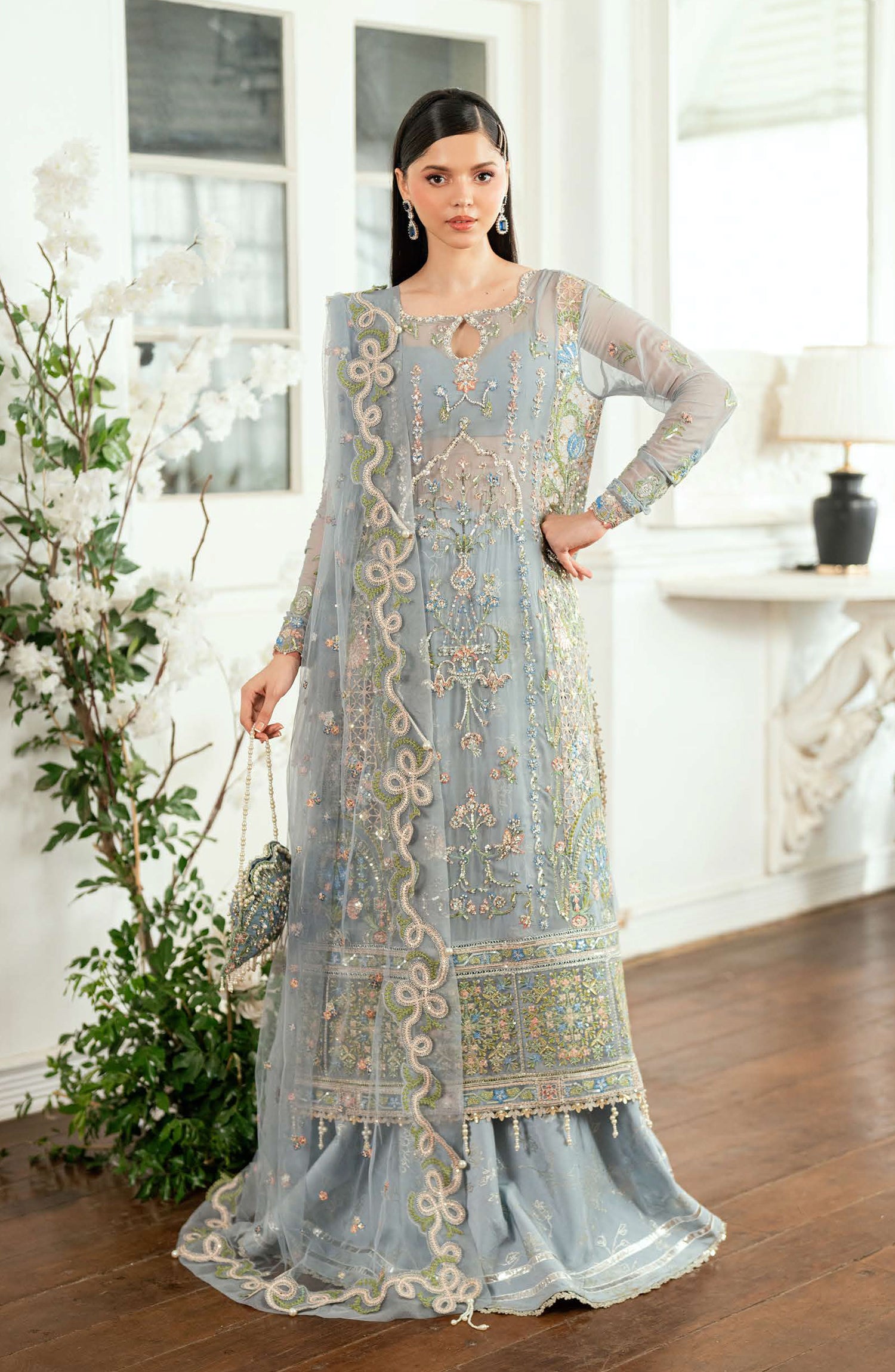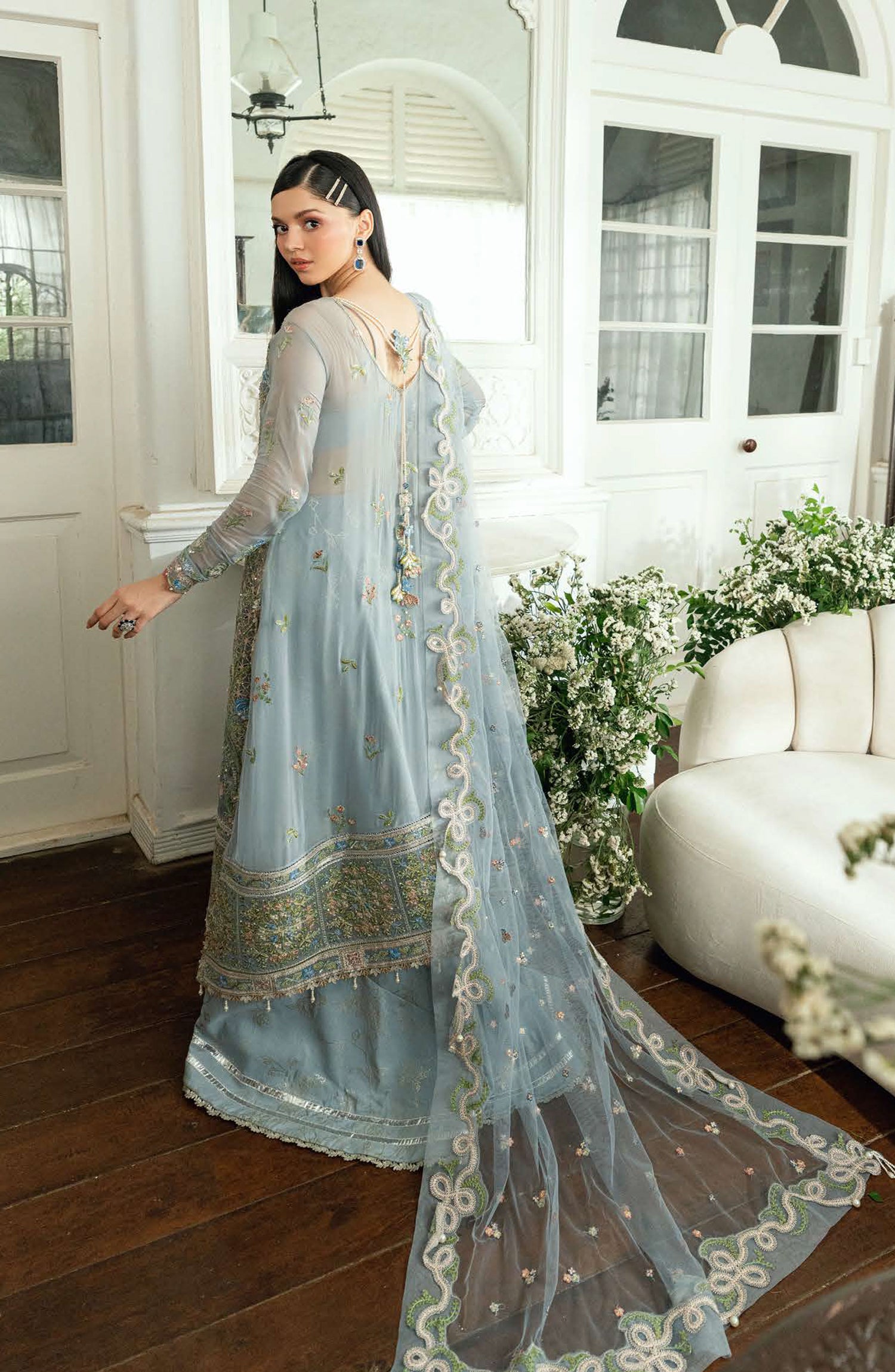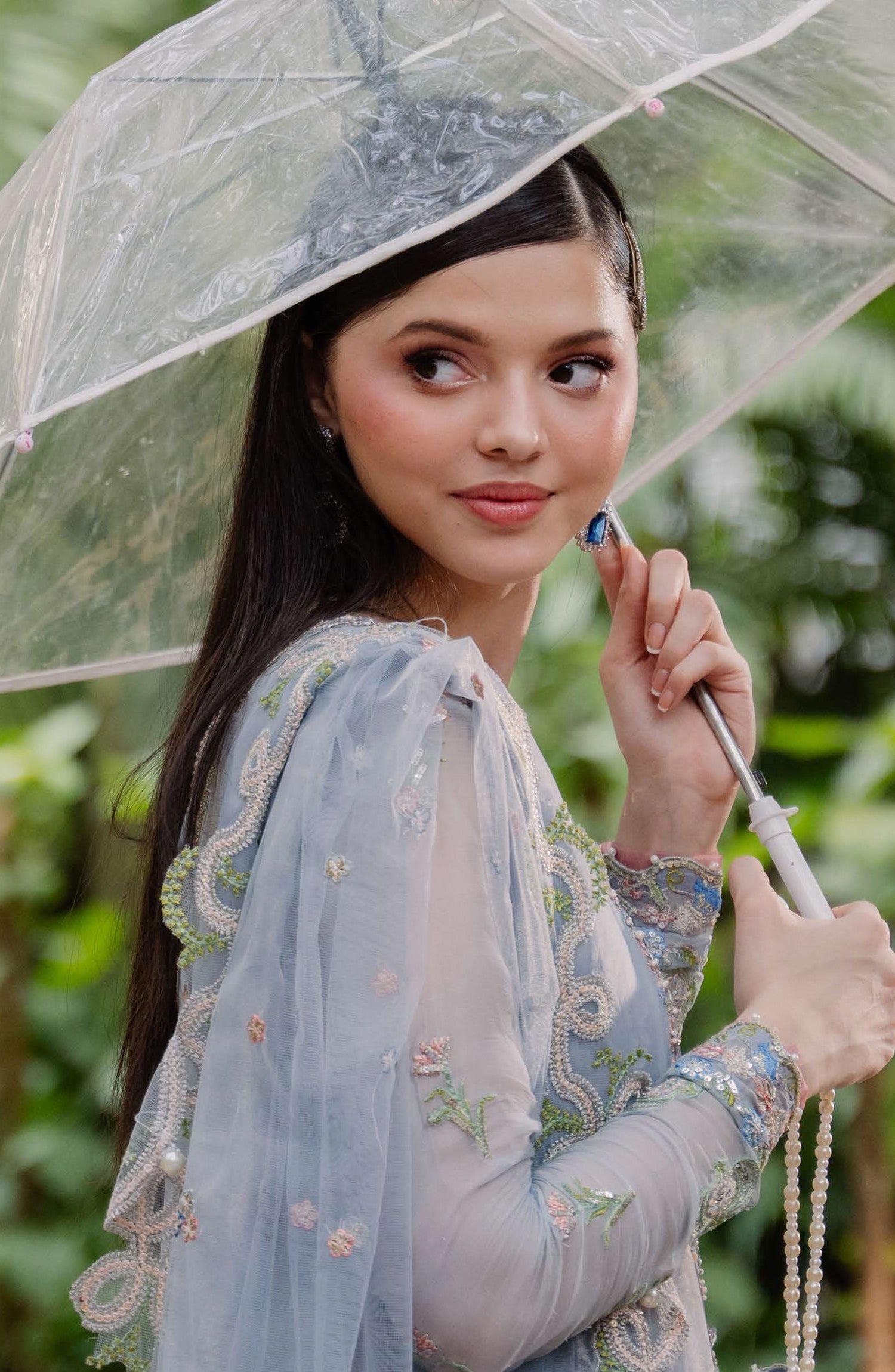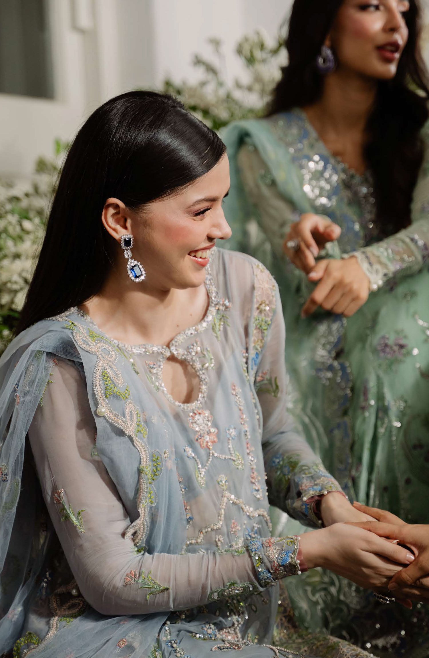 • Embroidered, sequinned pearl embellished front left panel (organza)