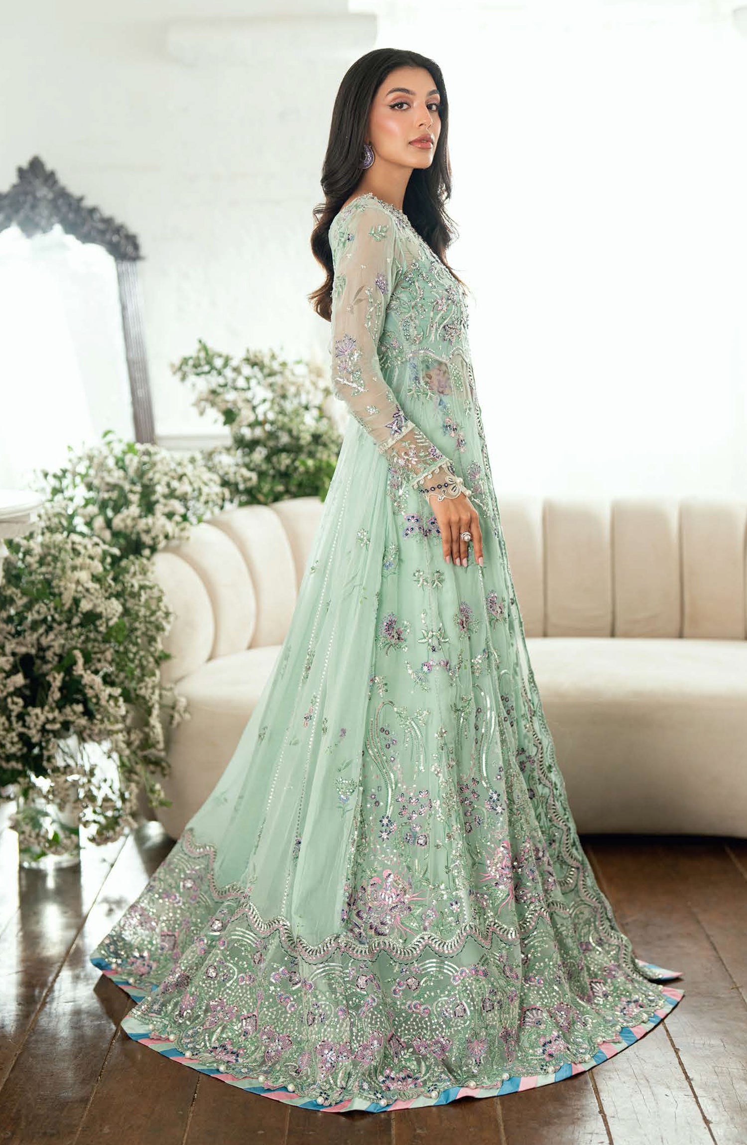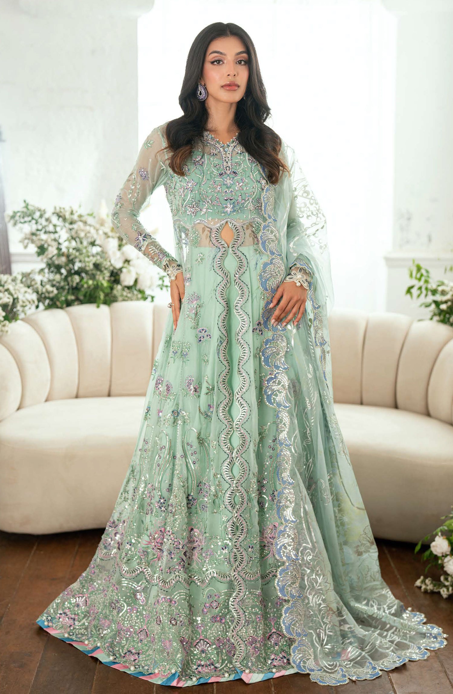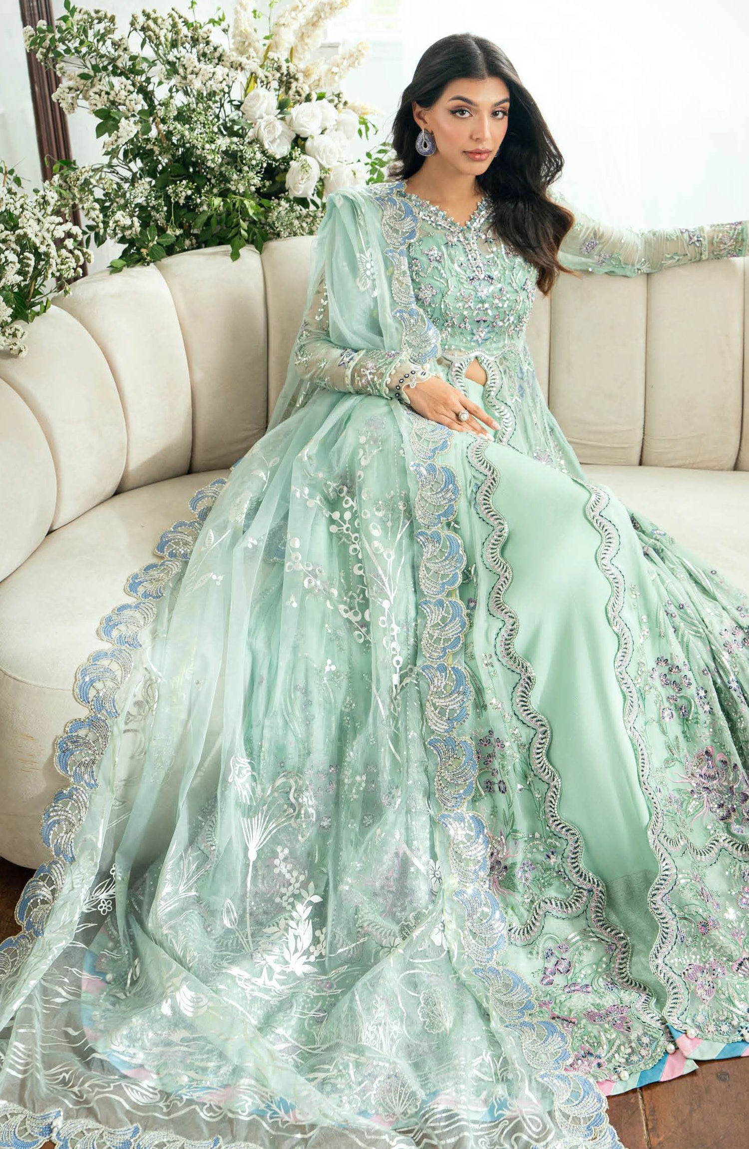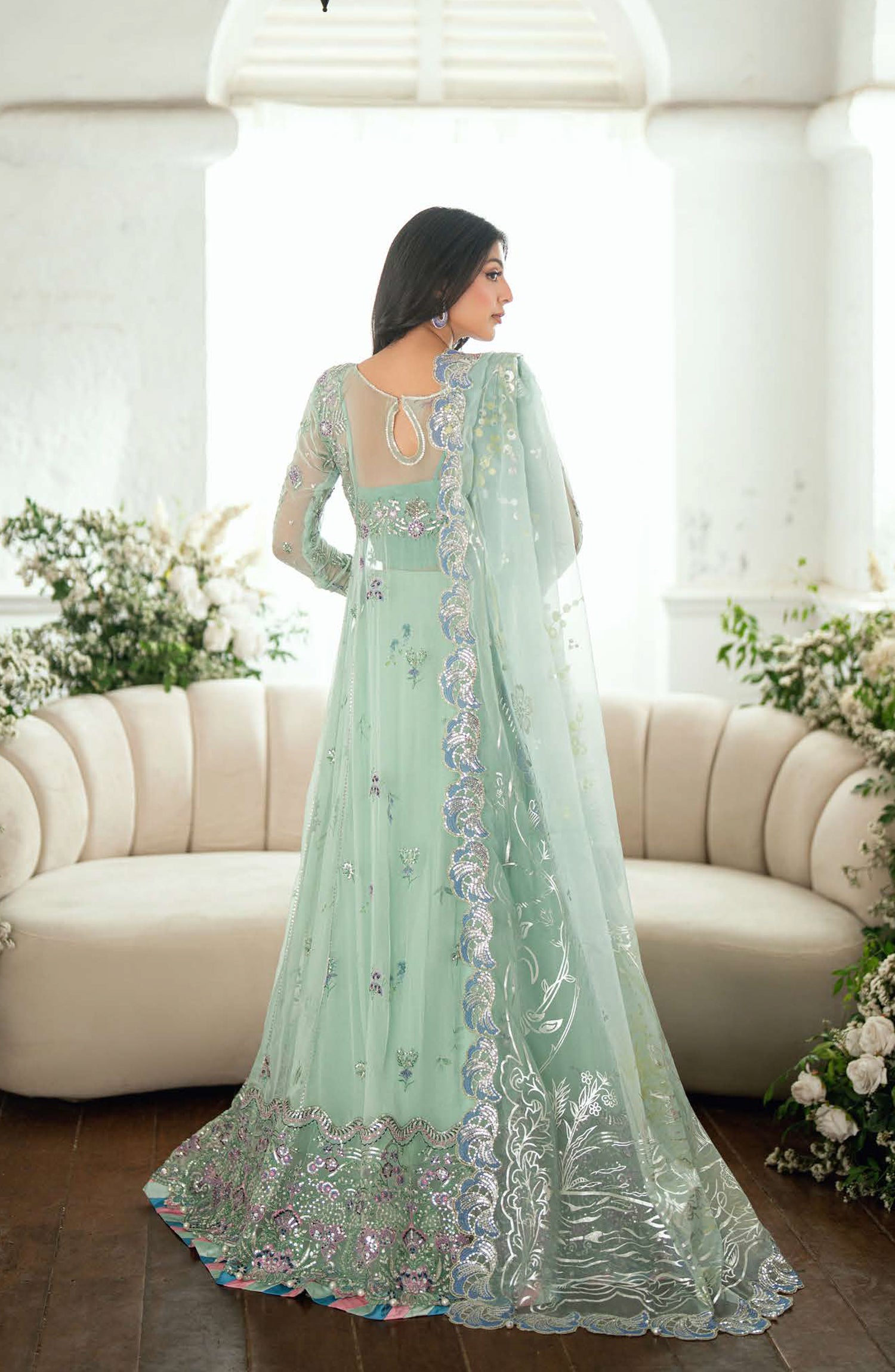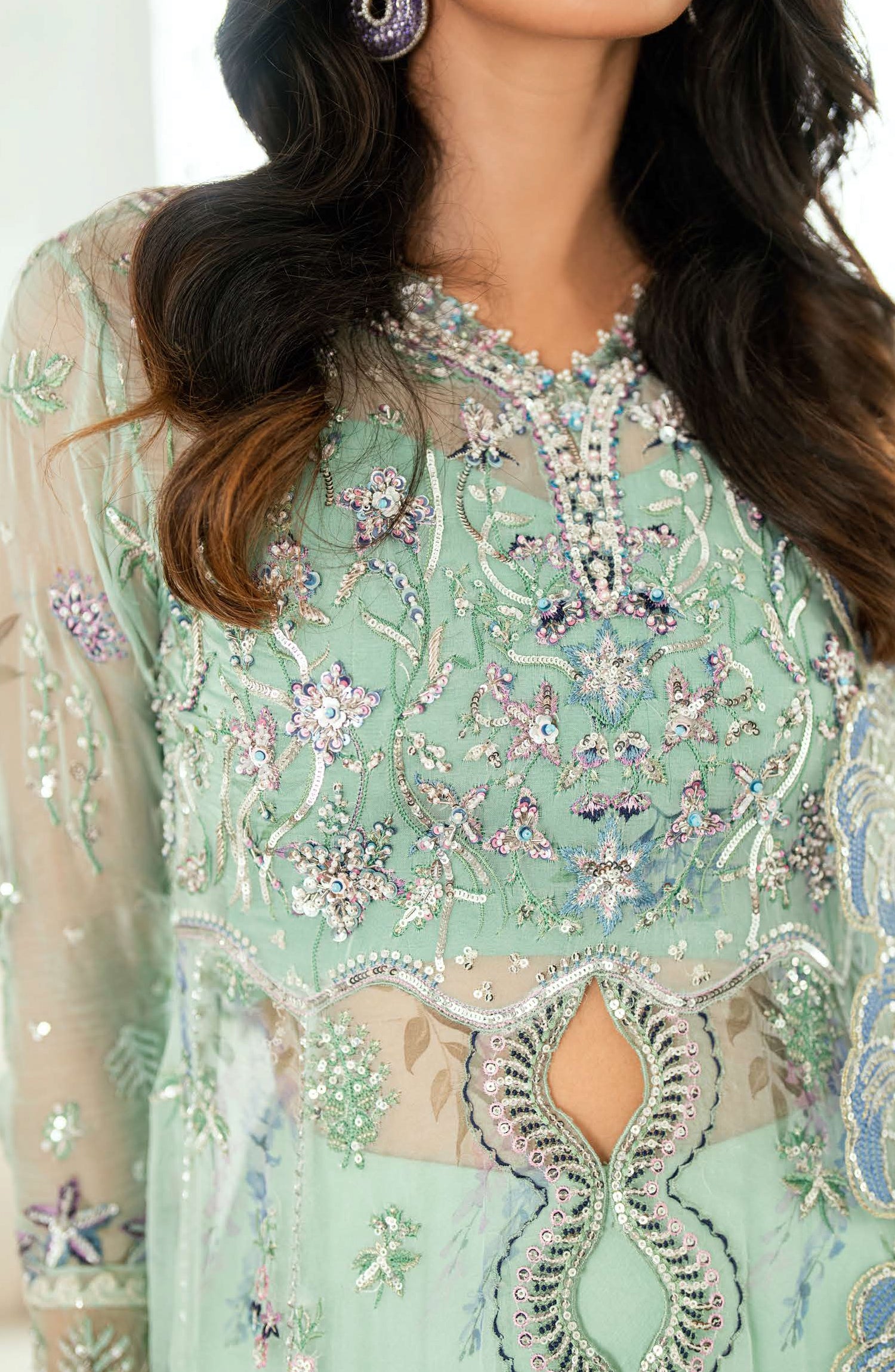 • Embroidered, sequinned front & back daman border (organza)