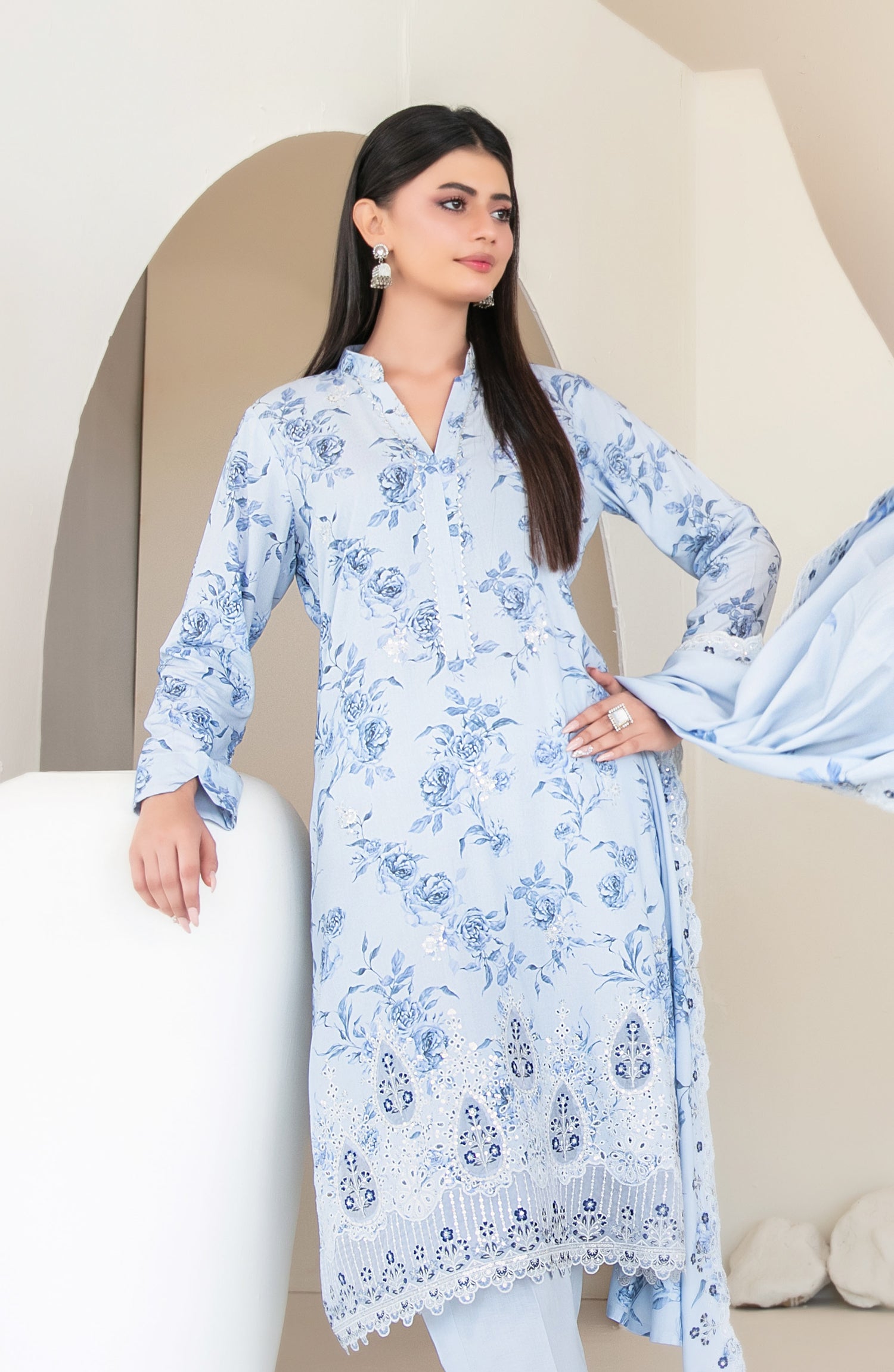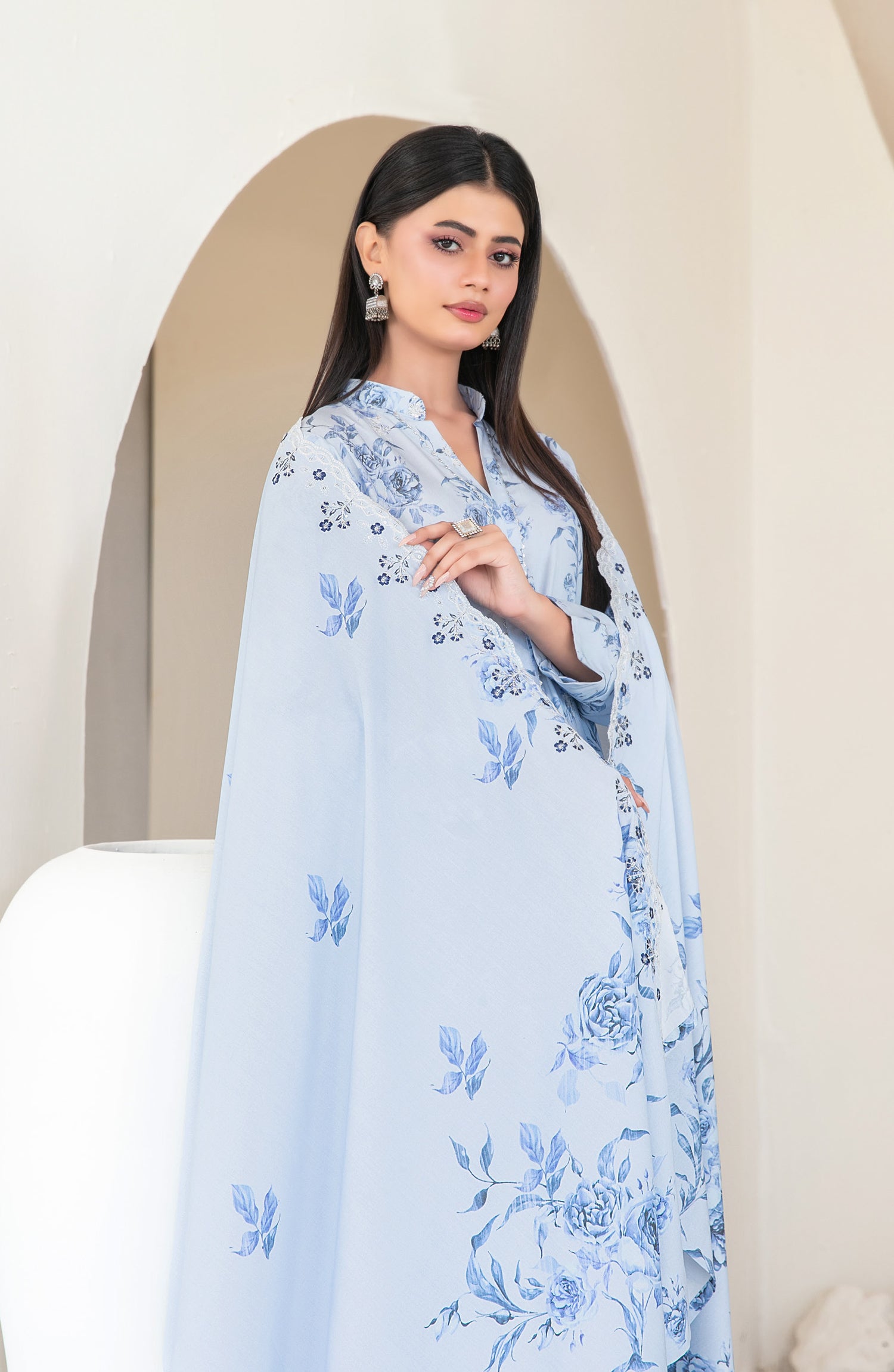 Un-Stitched Embroidered Digital Printed Staple Shirt with Embroidered Digital Printed Staple Shawl Dupatta & Un-Stitched Plain Staple Shalwar Fabric