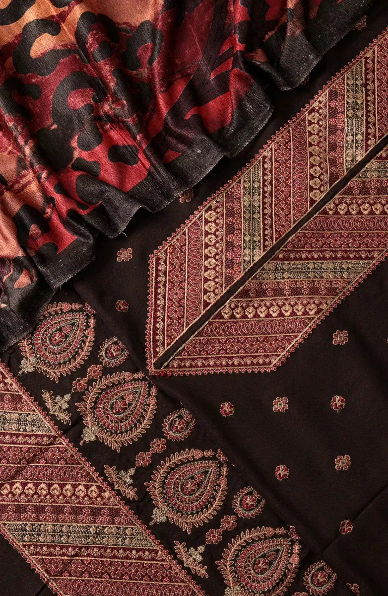 Rua by Casual Lite Embroidered Premium Linen Stitched 3 Piece Suit - D-03 Shadow Bloom - CL25RU - Black - Winter Collection