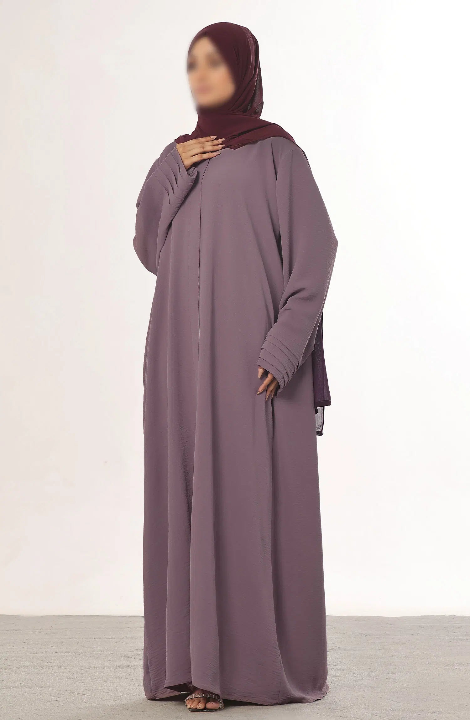 This is a must for your wardrobe collection with our new latest colors which is breathtaking and ultimately gorgeous which is our hot sellers these days front open style abaya and plates on sleeves come along with pure Contrast Korean chiffon Sheila