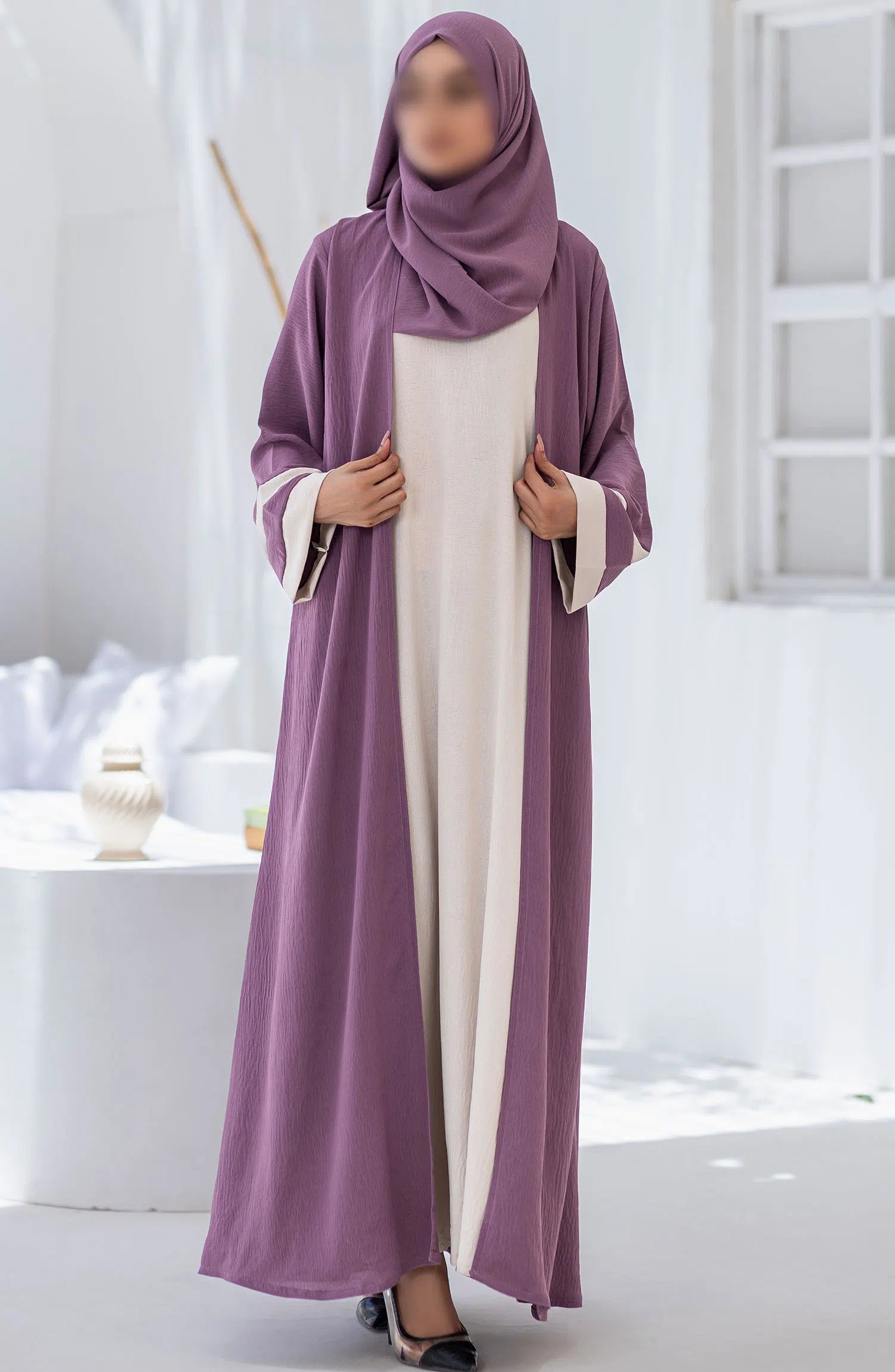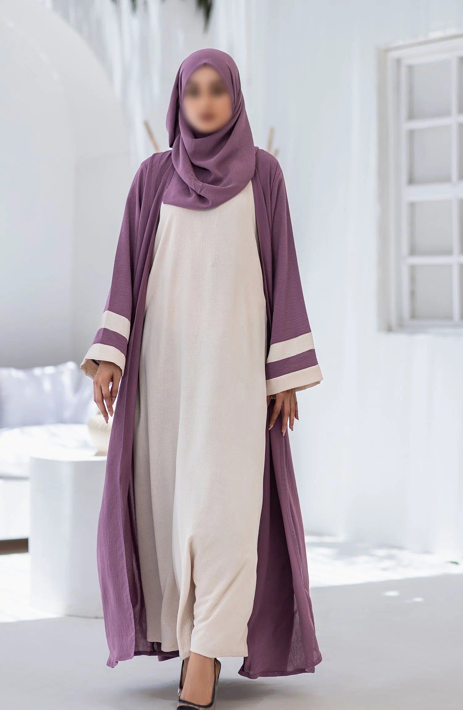 A beautiful contrast of lavender with fawn, with inner and coat style abaya is a must for this festive season purely elegant design, comes along with pure Korean chiffon Sheila.