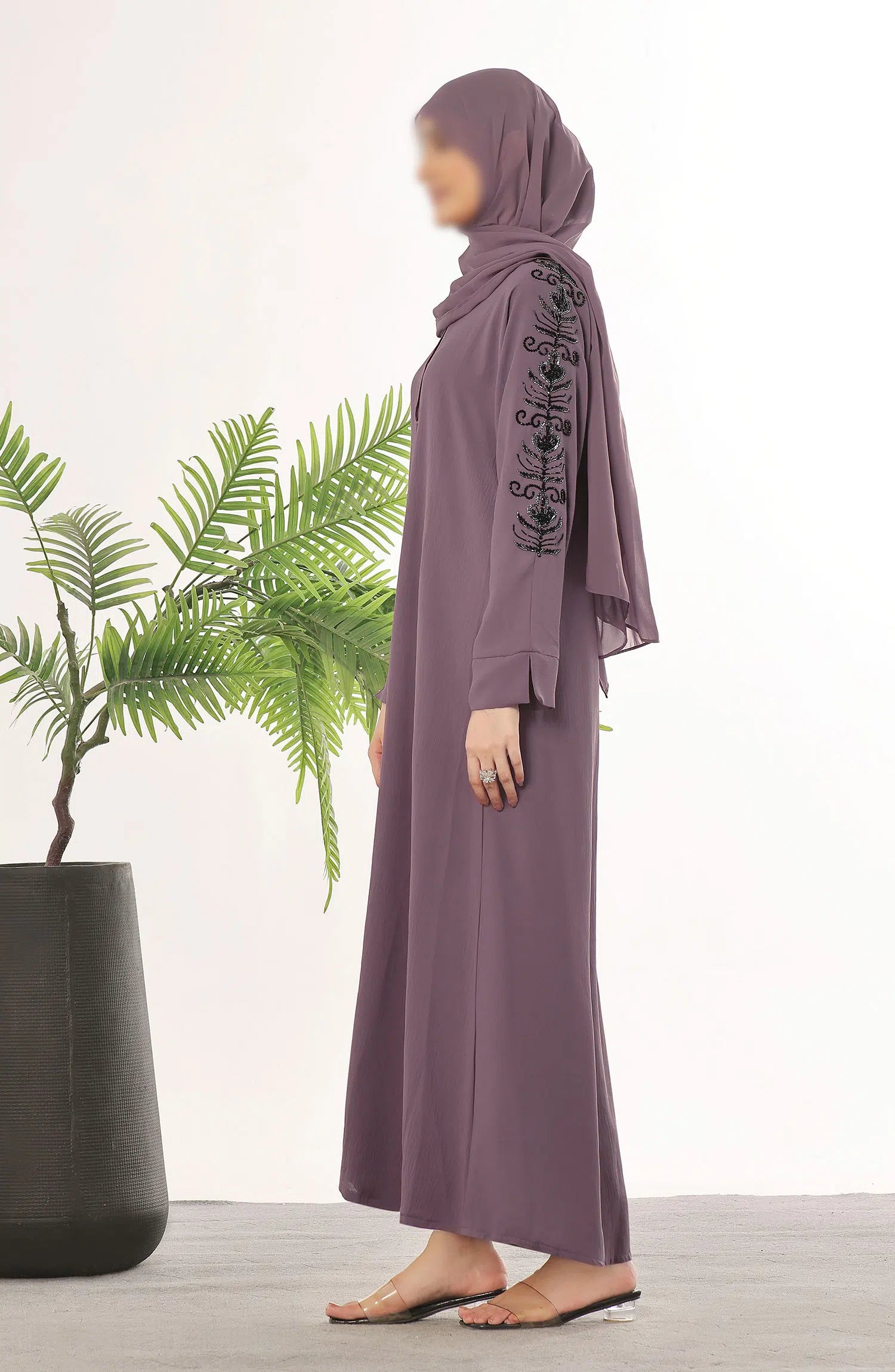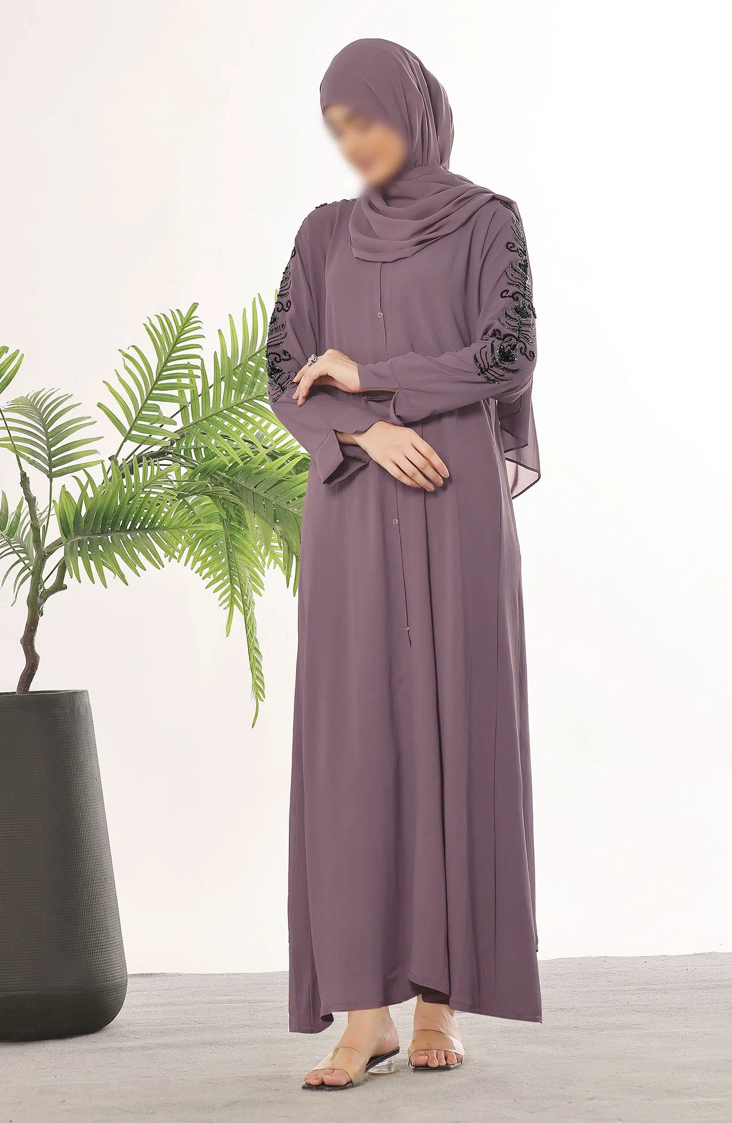 Front open style with hand embroidered sleeves makes it super gorgeous for everyone to wear in every event beautiful flared style abaya in maroon durable fabric, Dubai premium made comes along with pure Korean chiffon Sheila