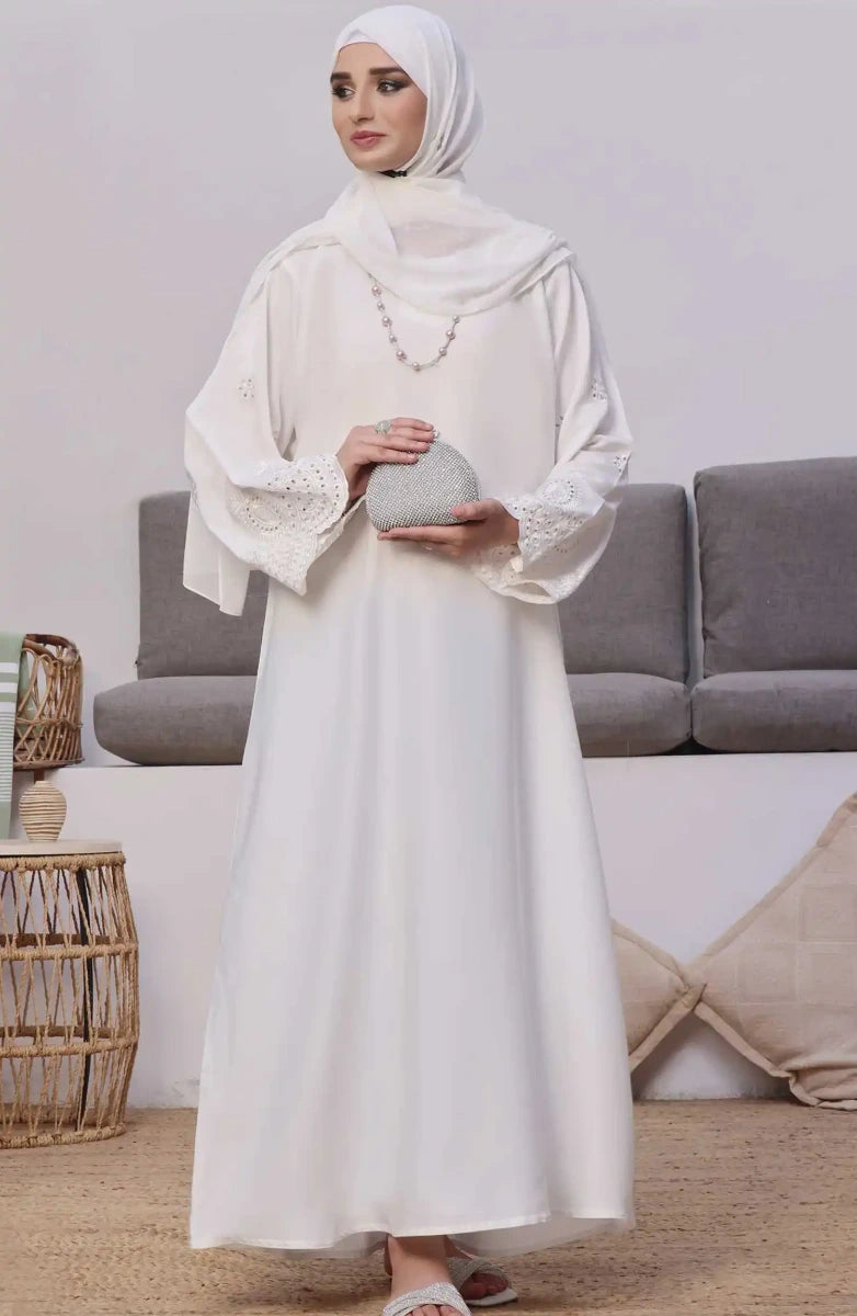 When looking for something Classy and Unique, our beautiful laser cut work Abaya is gorgeous yet elegant with cutwork on sleeves and paired with pure Korean Nidha Sheila