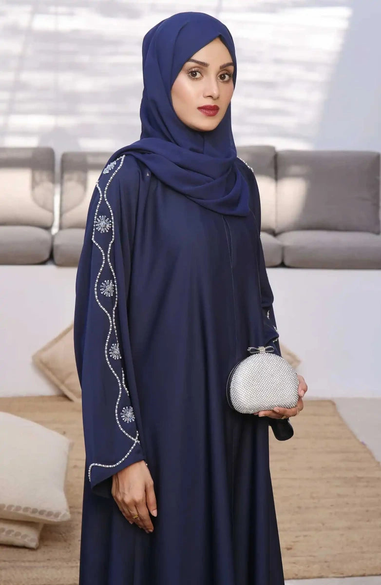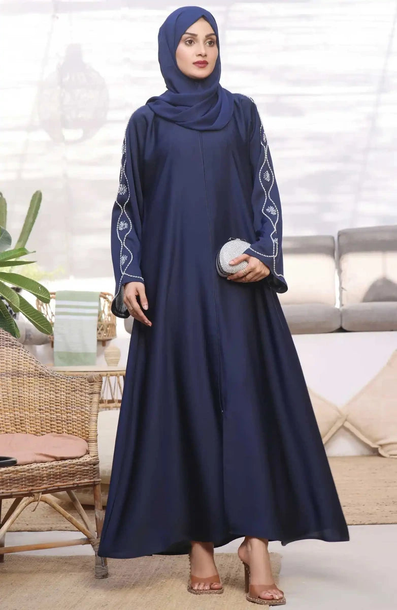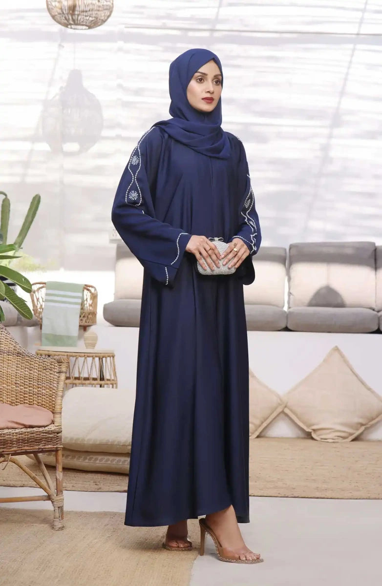 When looking for something Classy and Unique, our beautiful Flower Pearls work Abaya is gorgeous yet elegant with work on sleeves and paired with pure Korean Nidha Sheila