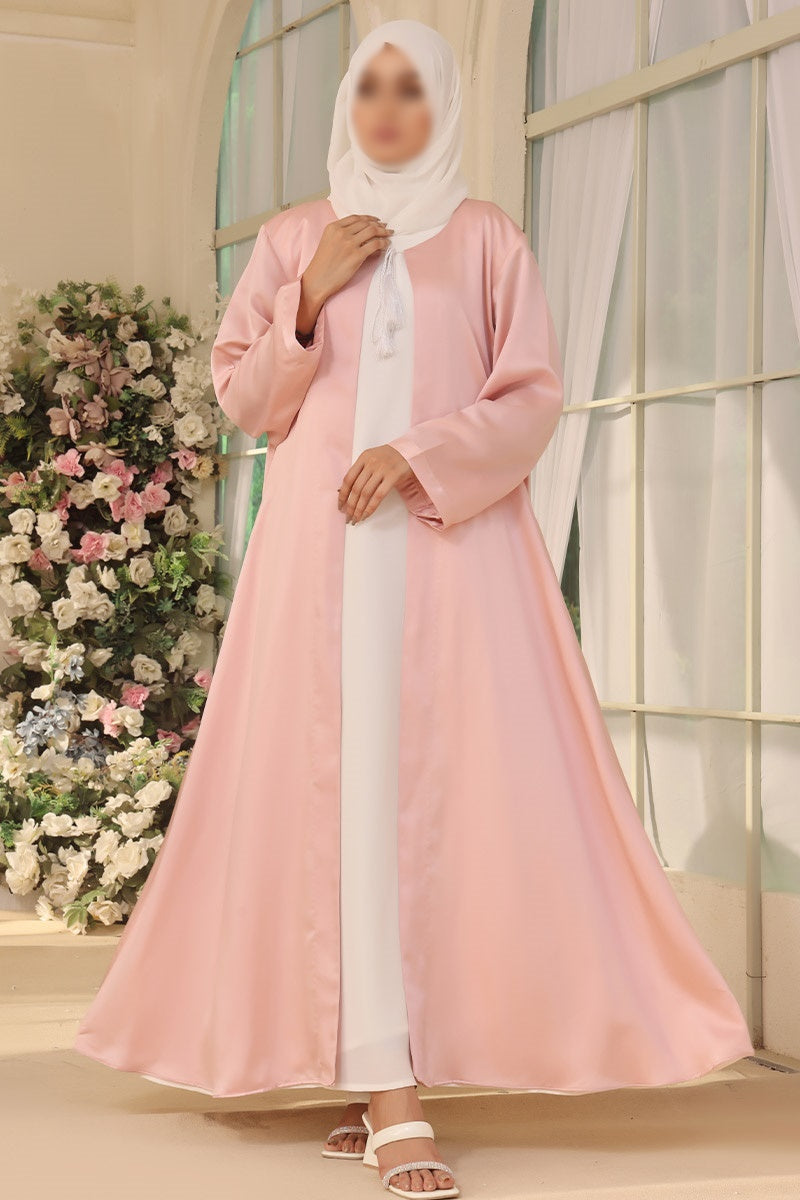 A beautiful contrast of pink and white, with inner and coat style abaya is a must for this festive season purely elegant design, comes along with pure Korean chiffon Sheila.