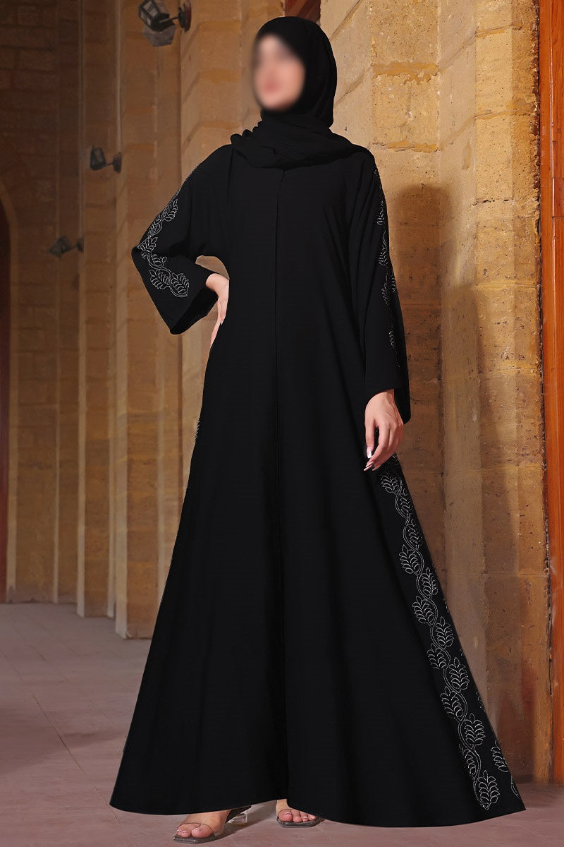 Our beautiful style abaya is best for all day everyday wear , hareer fabric which is soft and breathable premium Dubai fabric having embroidery on sleeves, sober and elegant design which is best to carry and comes along with chiffon Sheila