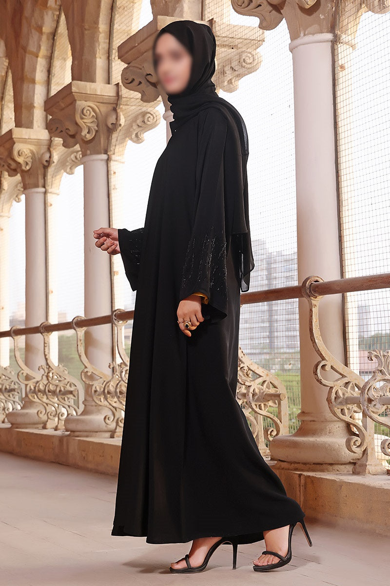 Our beautiful style abaya is best for all day everyday wear , Korean Nidha fabric which is soft and breathable premium Dubai fabric having handwork on sleeves, sober and elegant design which is best to carry and comes along with chiffon Sheila