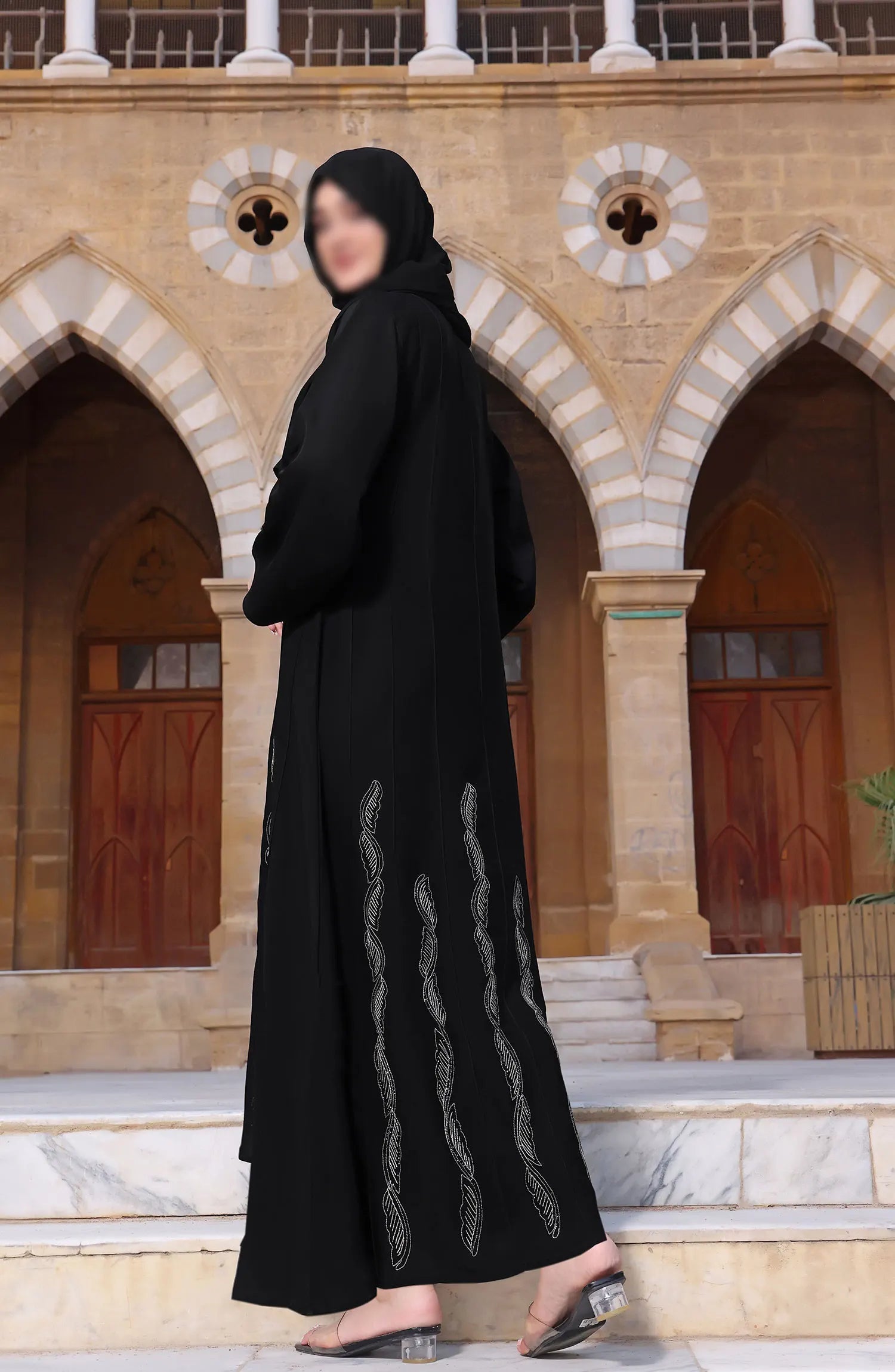 Front open style with hand embroidered front makes it super gorgeous for everyone to wear in every event beautiful flared style abaya in maroon durable hareer fabric, Dubai premium made comes along with pure Korean chiffon Sheila.
