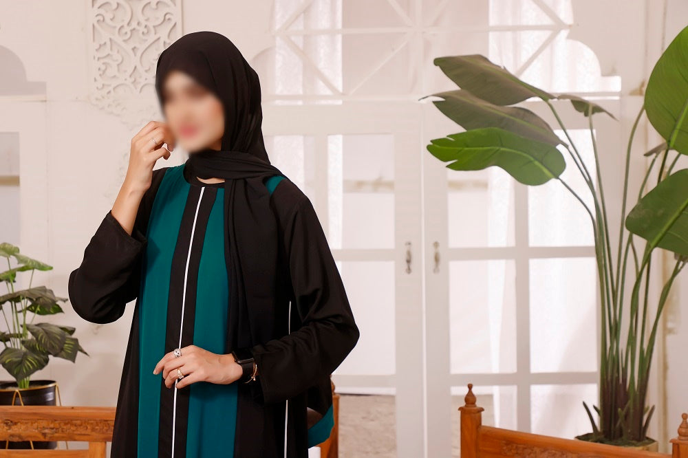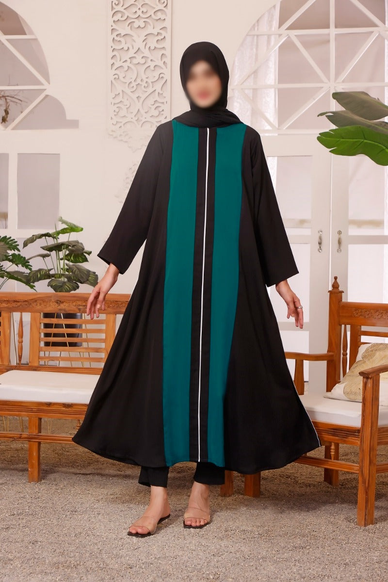 A perfect choice for modern women our beautiful front closed style abaya is a must for you wardrobe, green color combination with front pipin maxi style constructed on pure Korean nidha fabric comes along with pure Korean chiffon Sheila