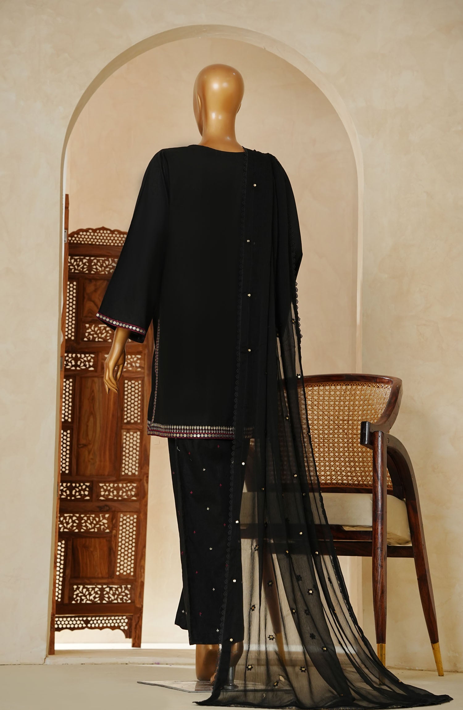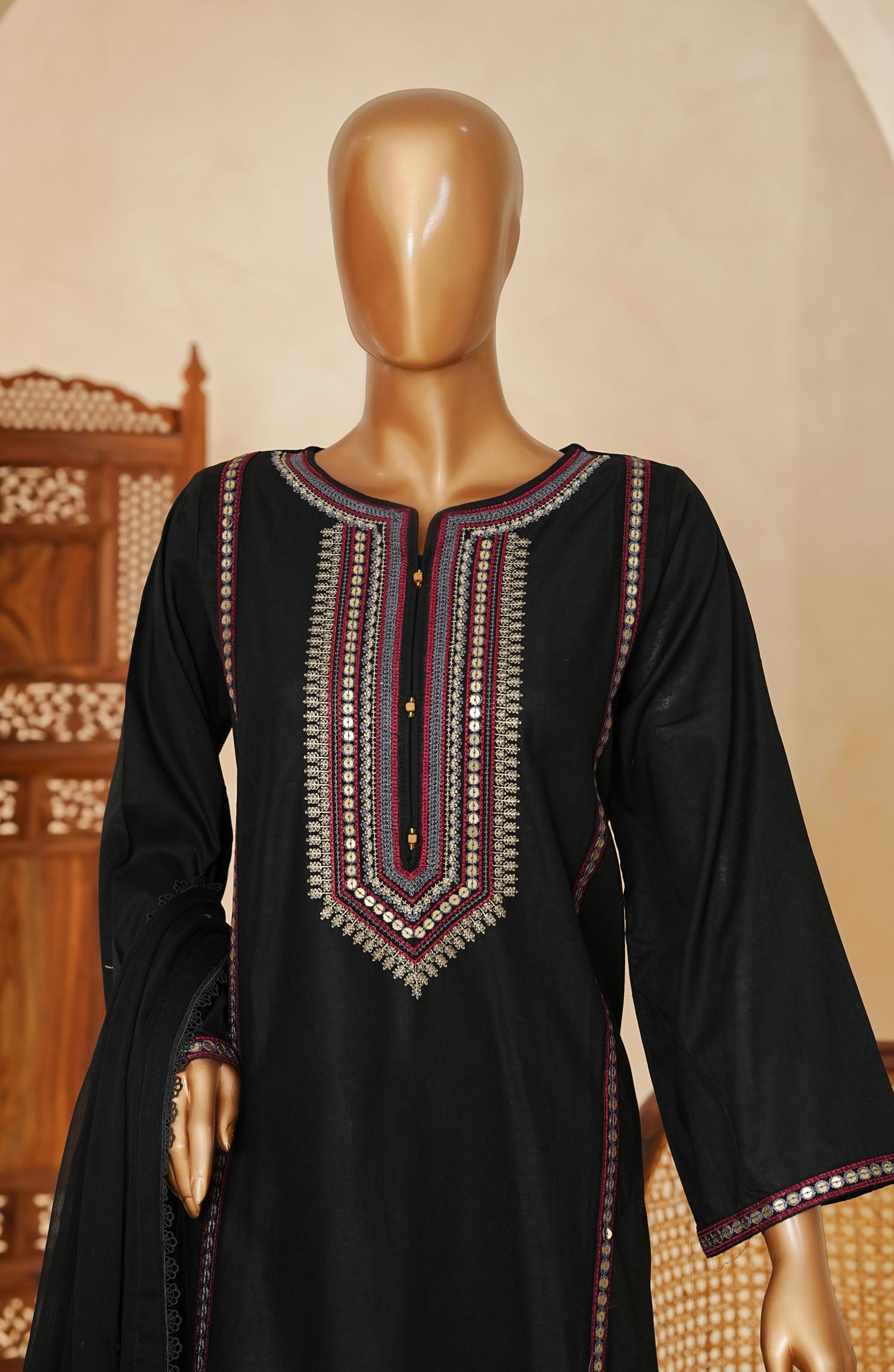 Thread and Sequins Exclusive Embroidered Stitched Cotton Cambric Shirt with Lacework and Embellishments
