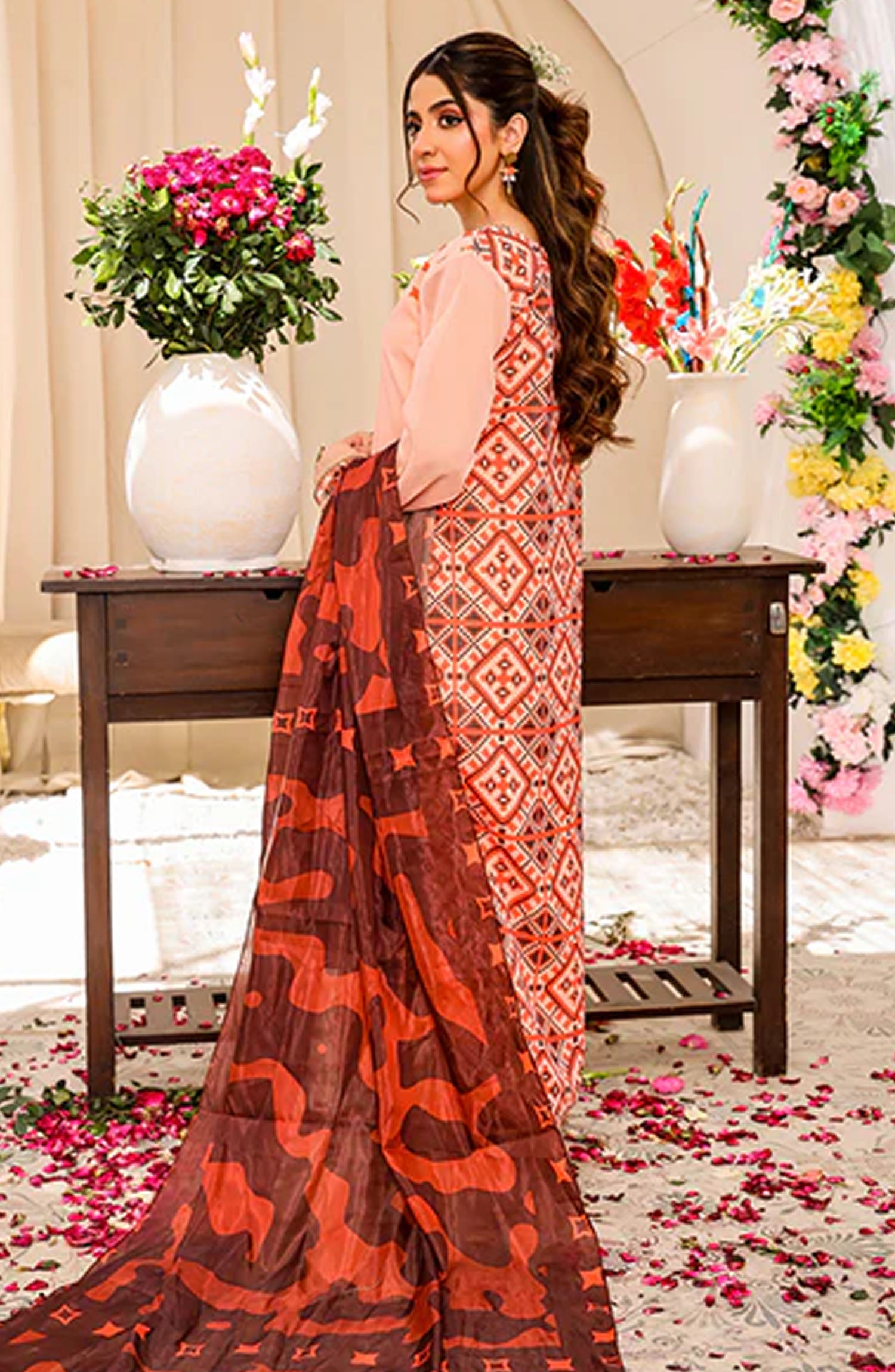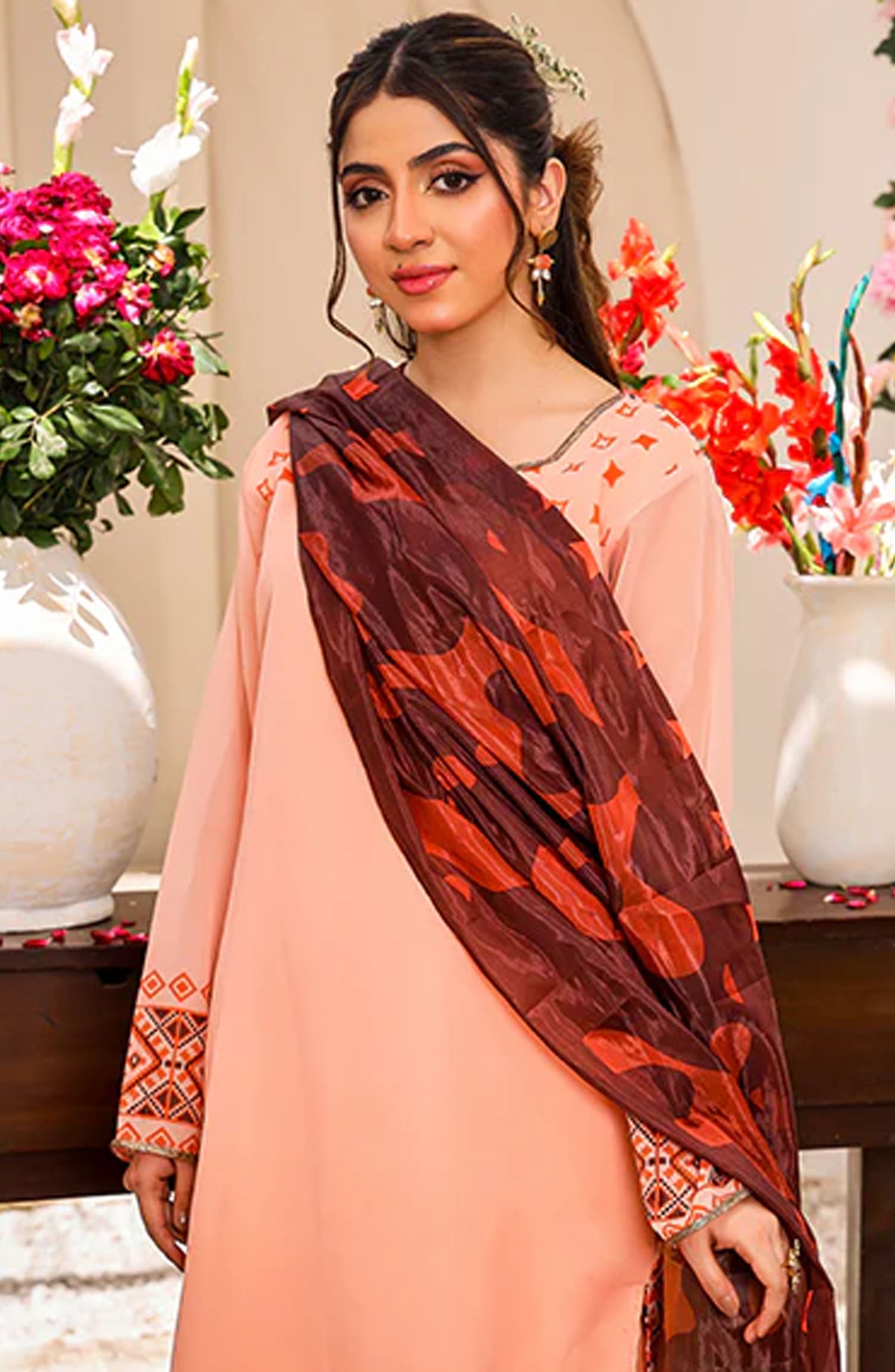 The standard style comes as a long-sleeved kameez with dupatta and trouser/shawlar.
