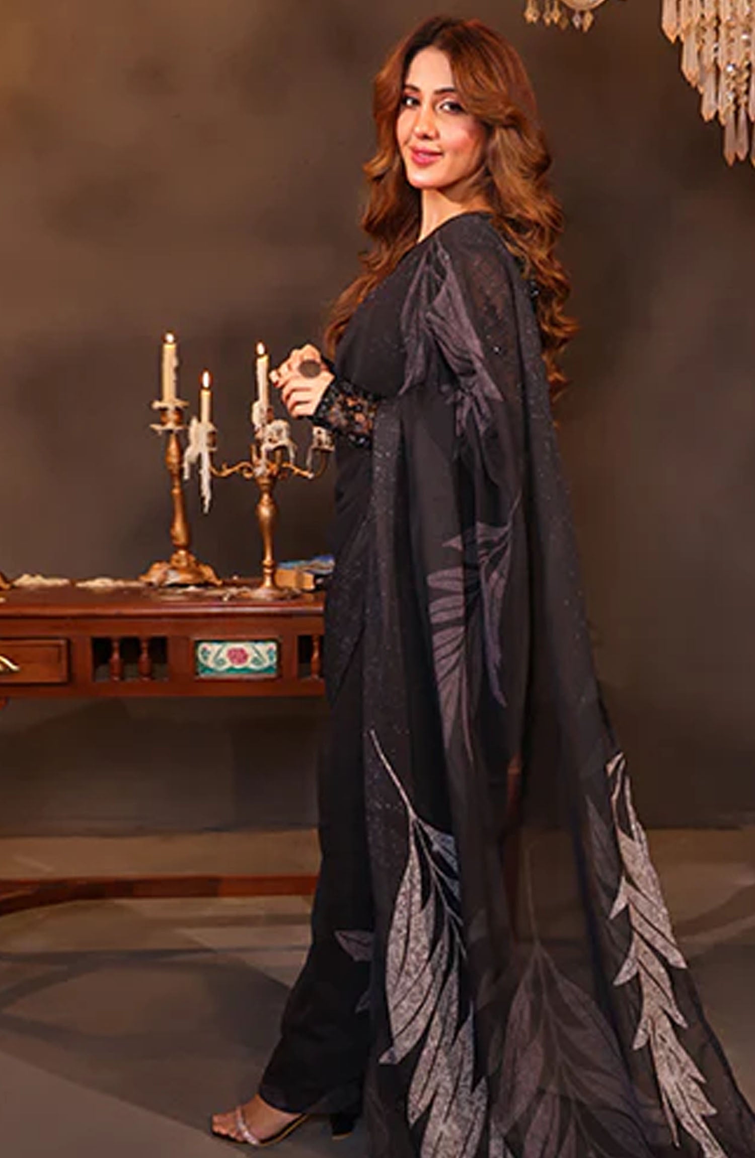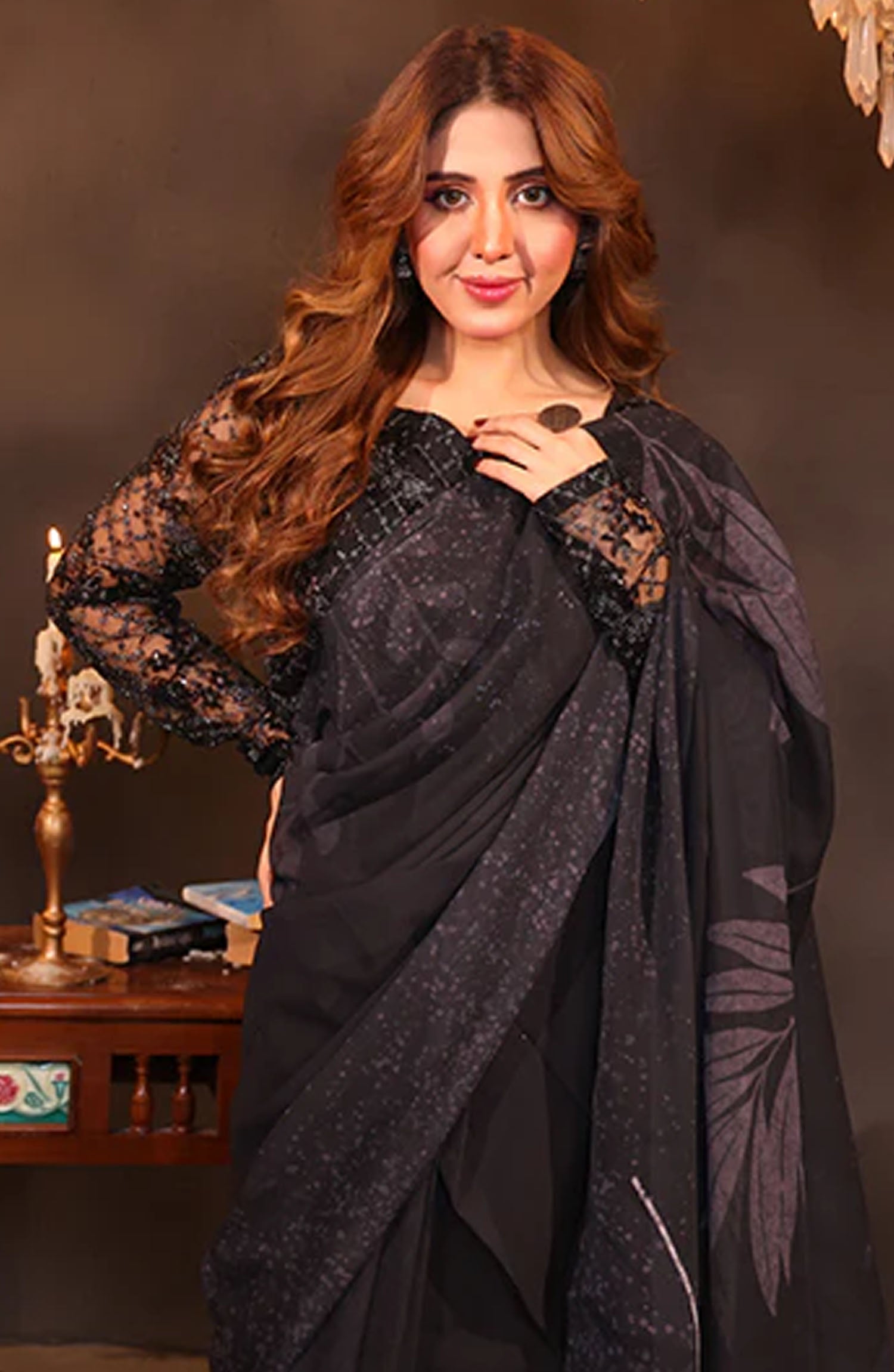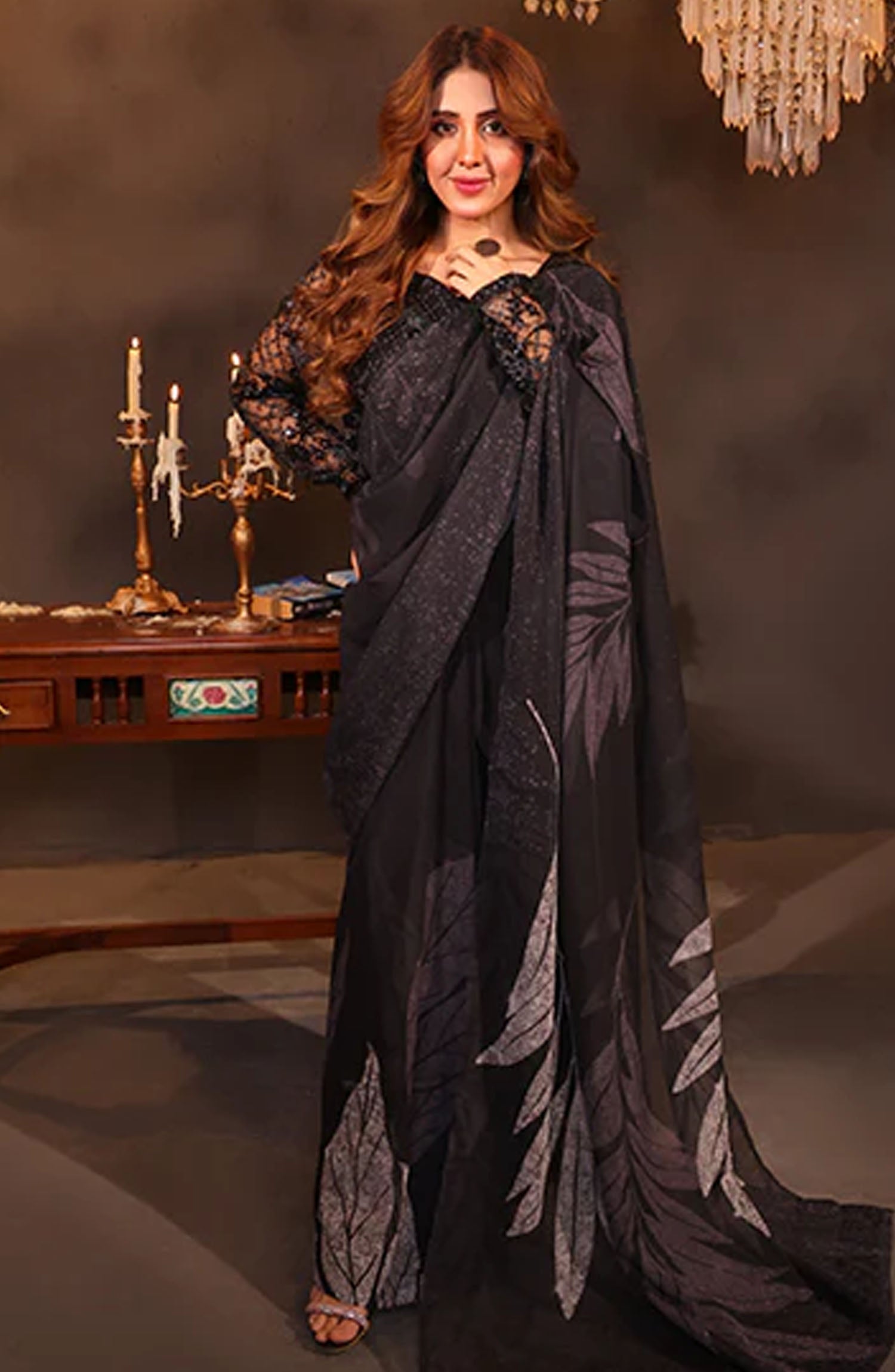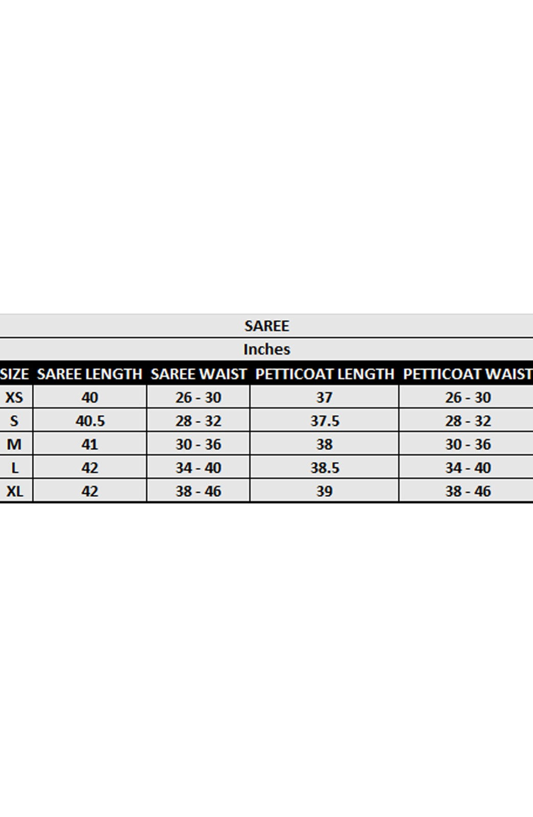Saree Fabric : Sheer Chiffon (Stitched)Ã Blouse Fabric : Embellished Weave Net (Unstitched)Petticoat : StitchedSaree: 6 yardsBlouse : 1 yard (Finished and Hemmed)