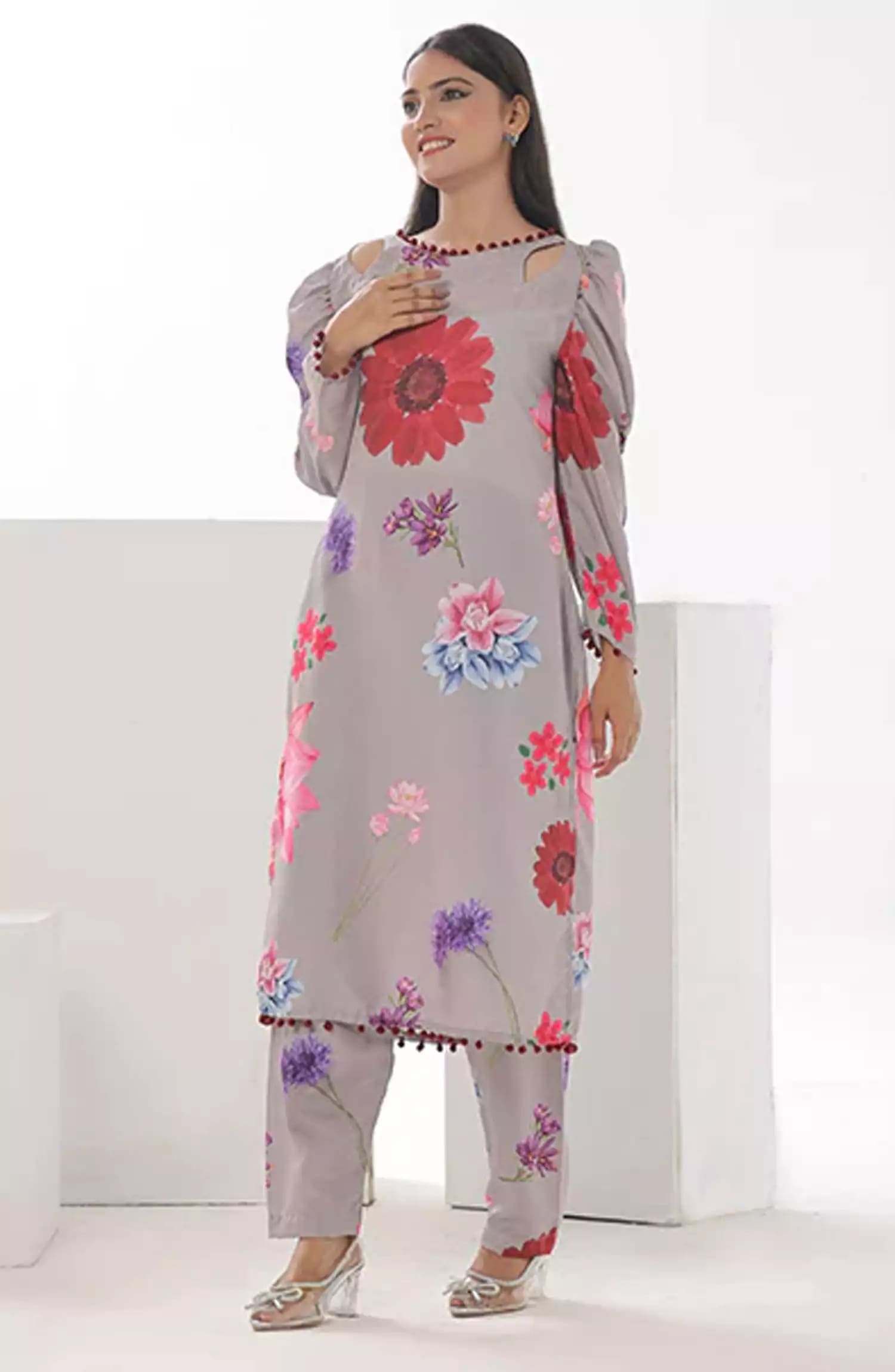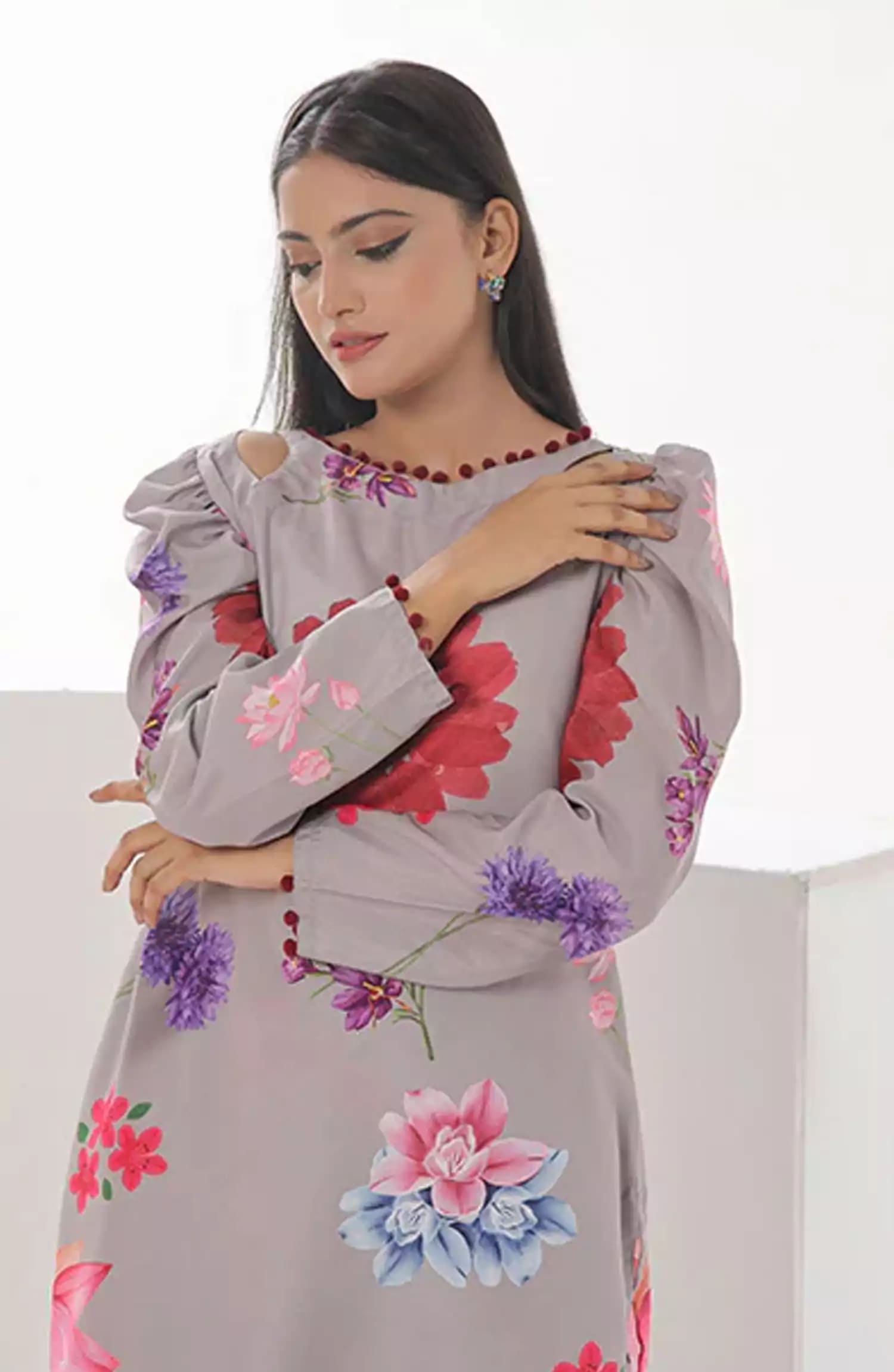 Nazmina Floret Luxury Swiss Lawn Collection has been styled in the image for photography and illustrative purposes.