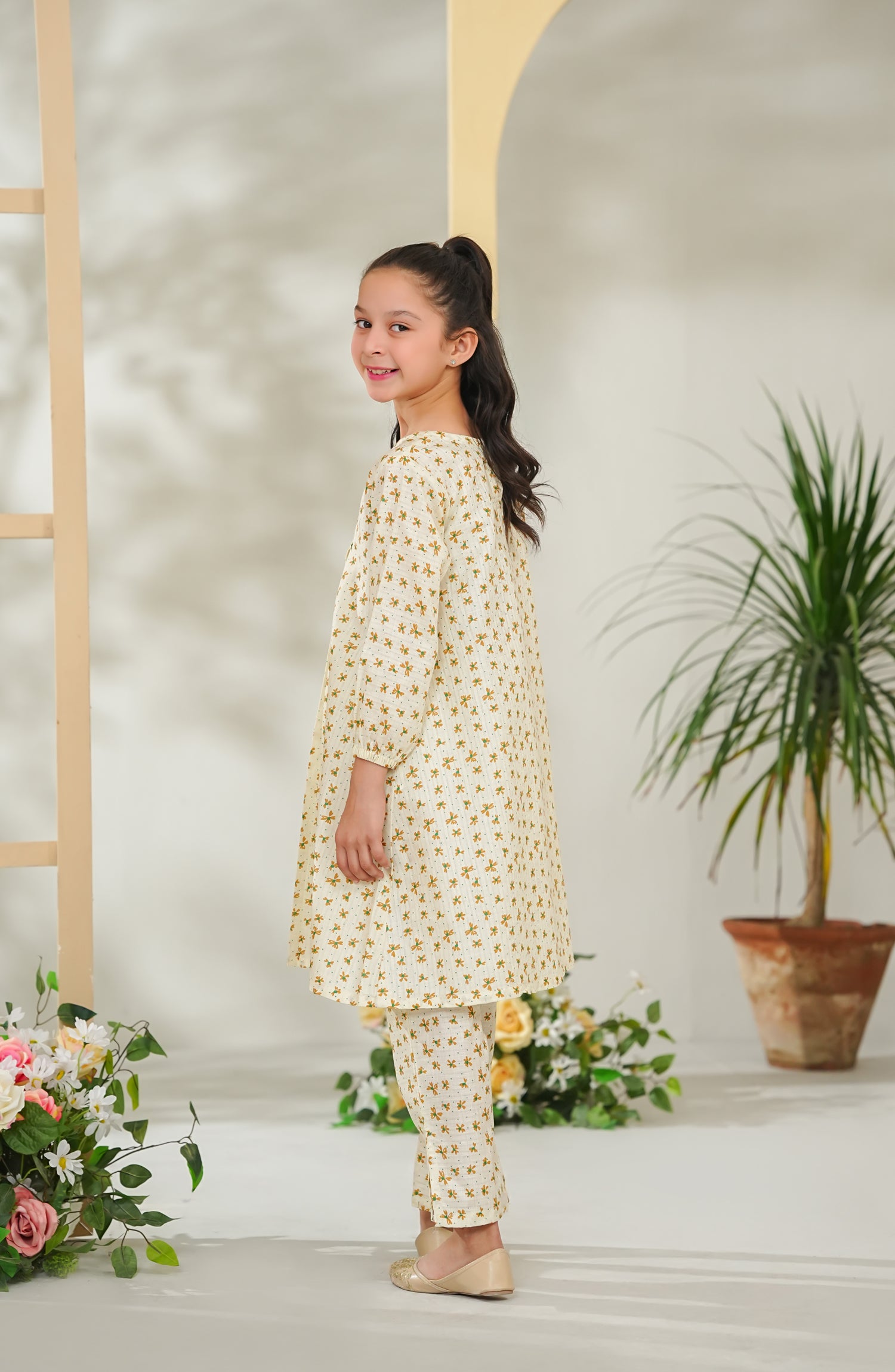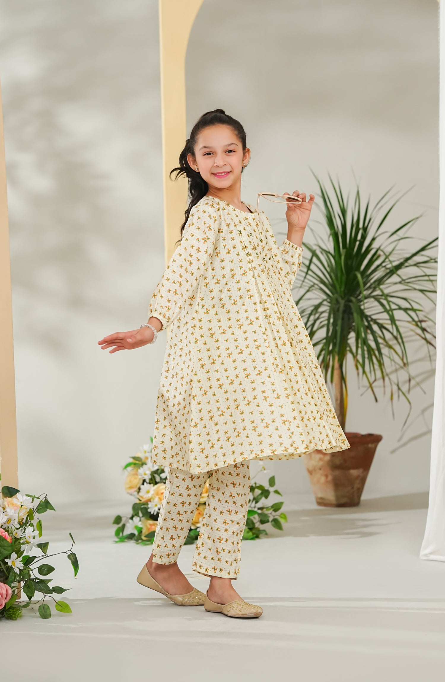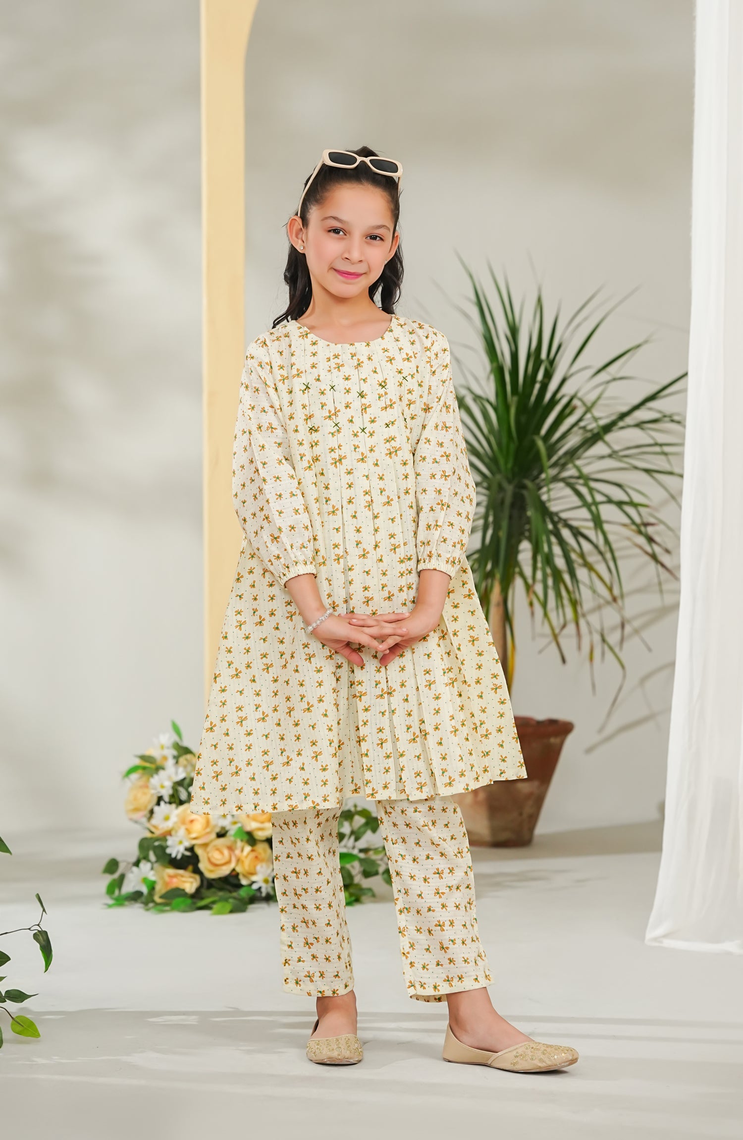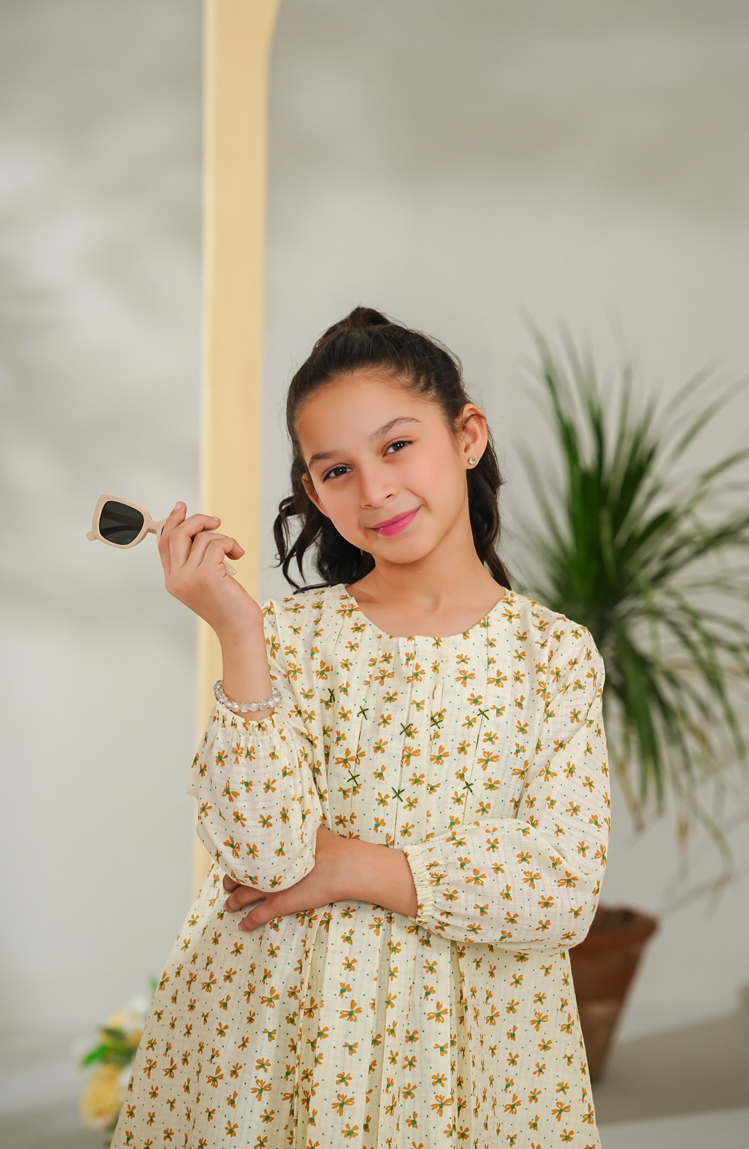 2 Piece Printed Cotton Frock Style with Pleated and Thread Work