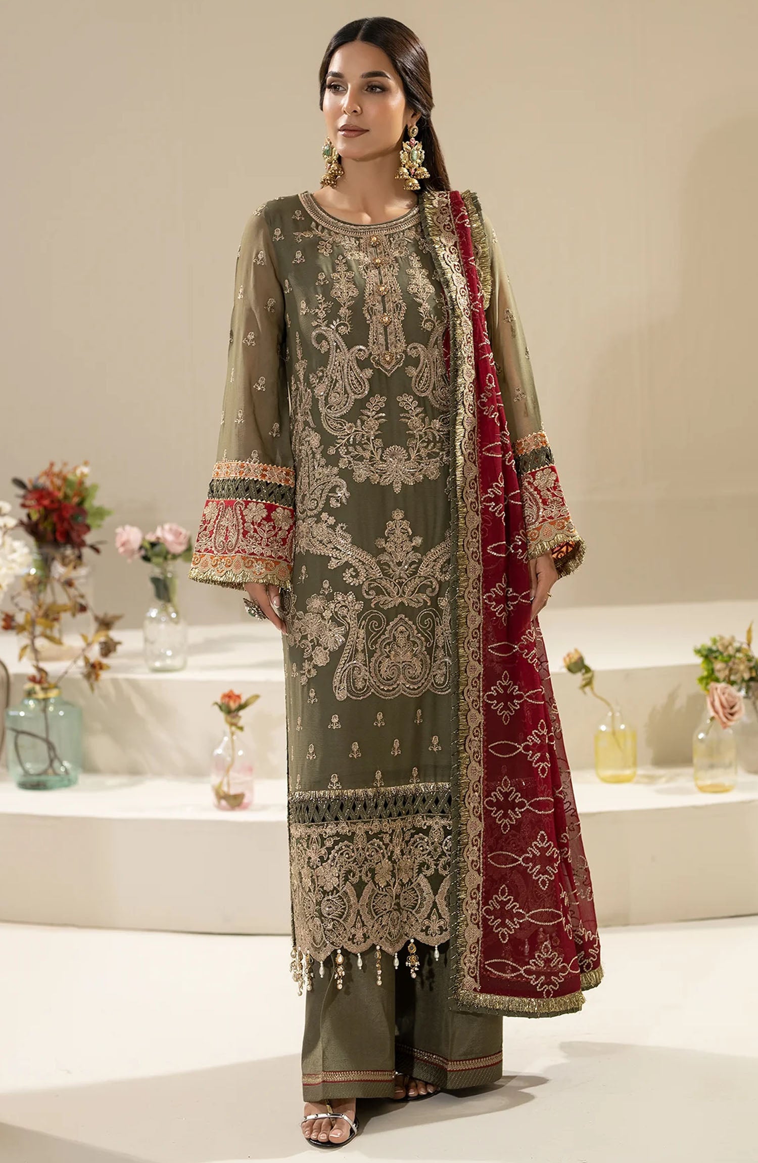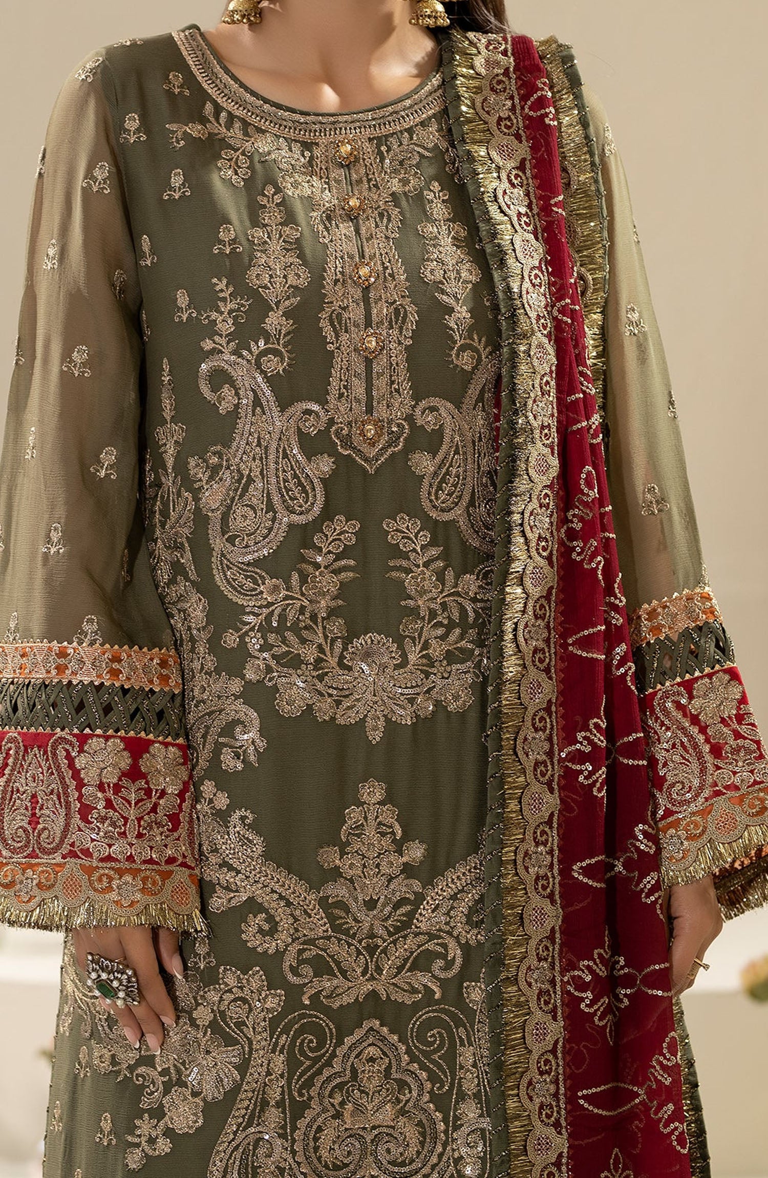 The standard style comes as a long-sleeved kameez with dupatta and trouser/shawlar.