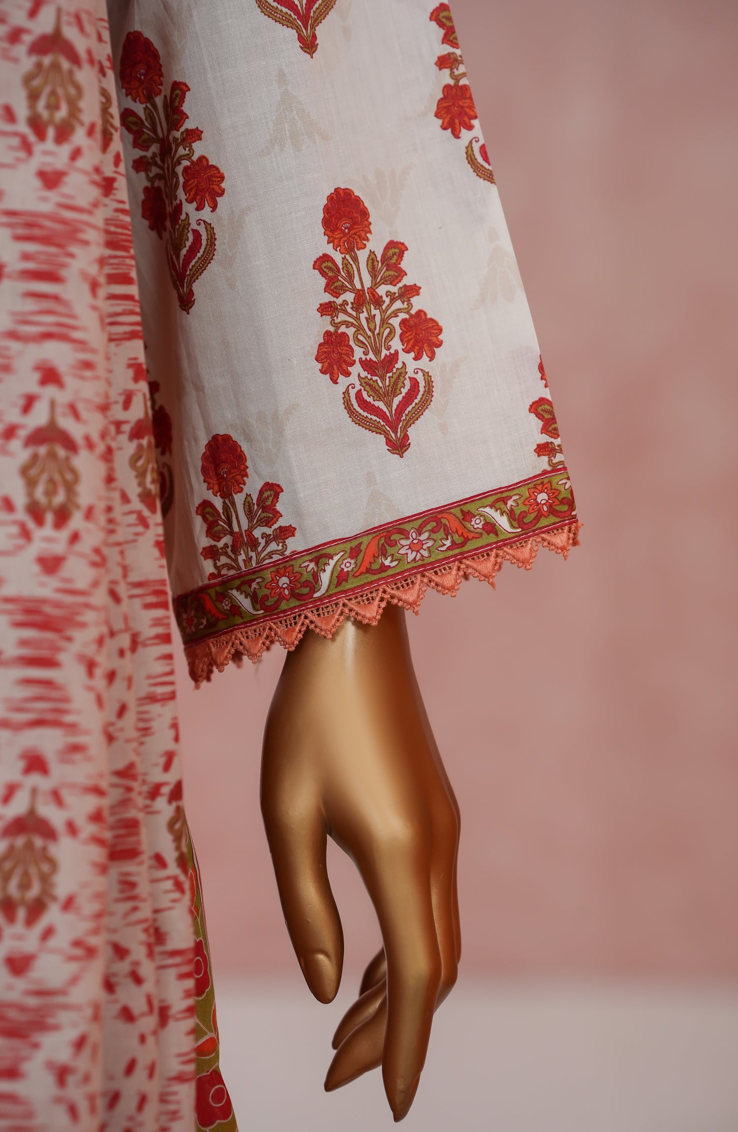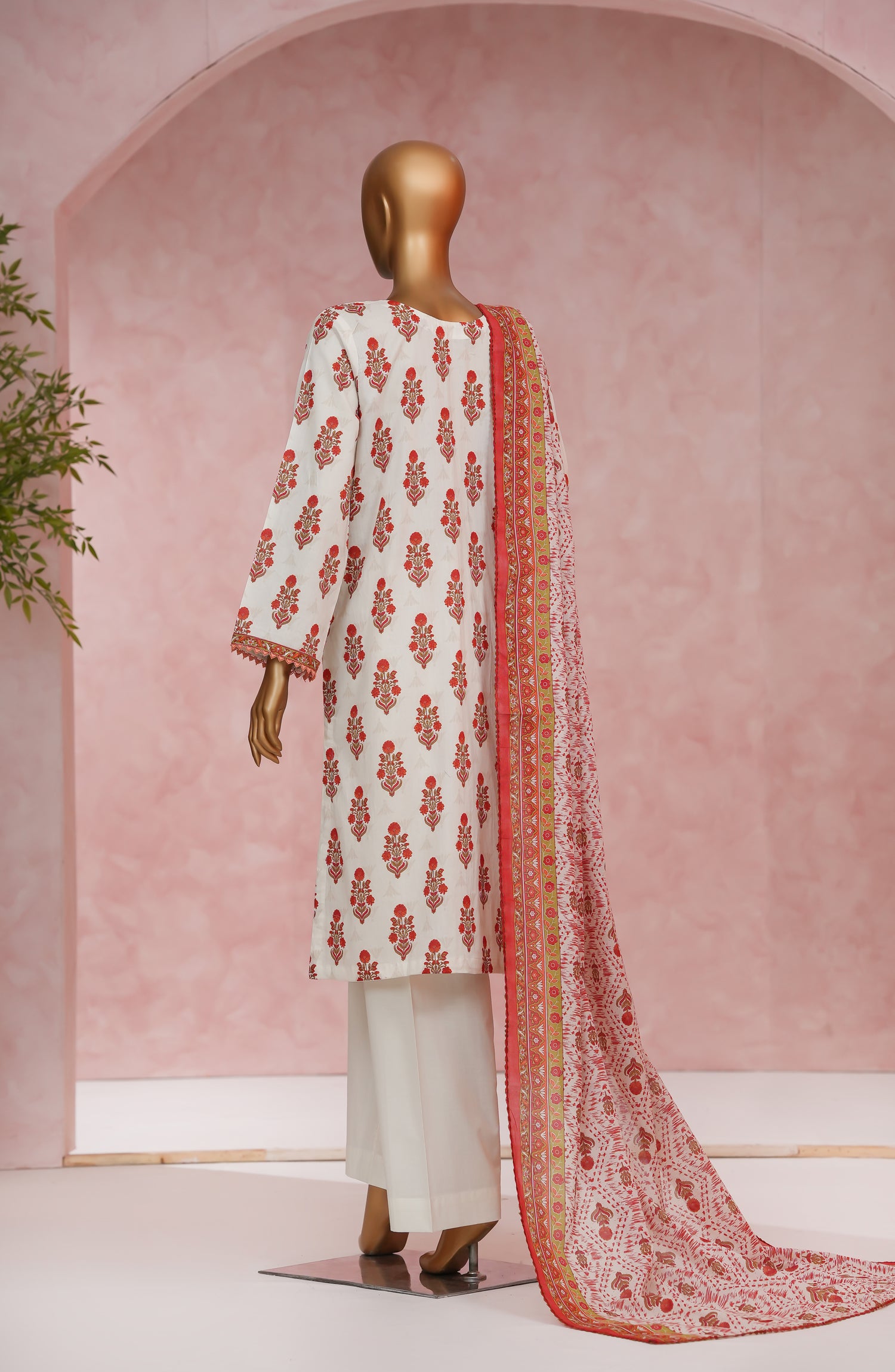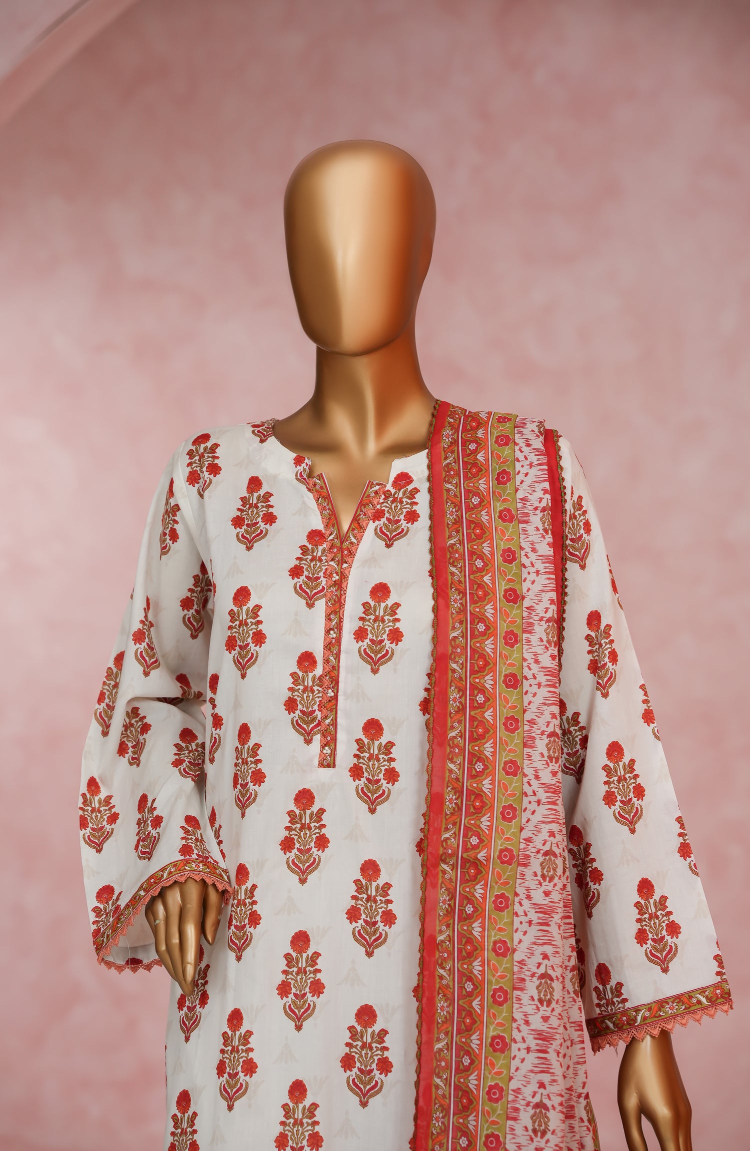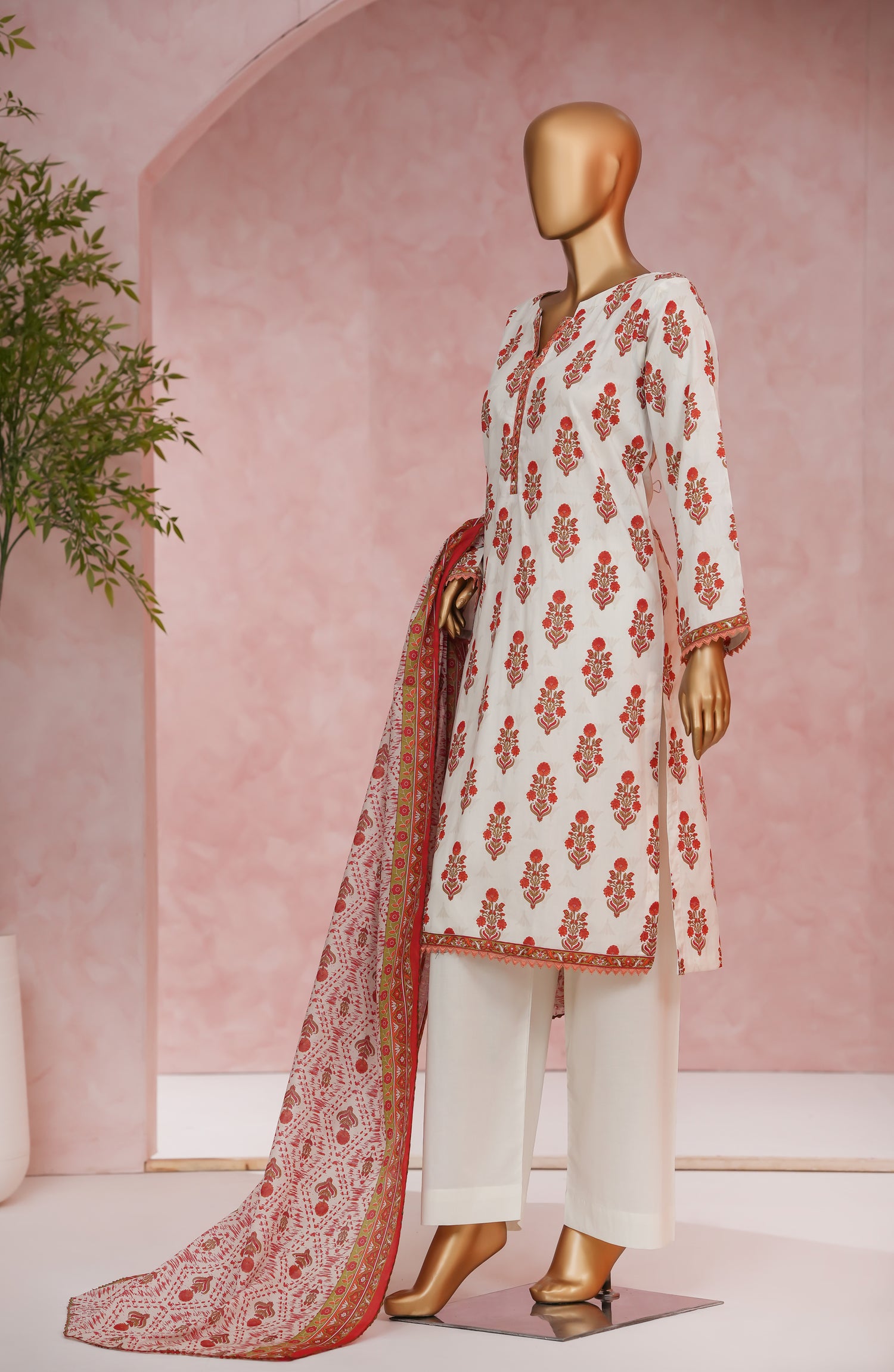 Stitched Digital Print Cotton Cambric 3-piece suit with embellishments with Digital Print and Qureshia dupatta and tailored trouser.