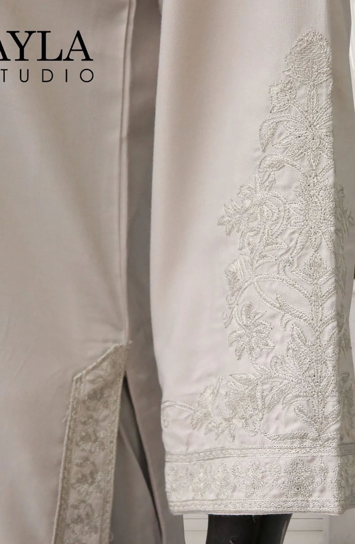 Elevate your evening look with Ayla Studio’s Raat Ki Roshi – a 2-piece solid embroidered outfit in a deep Charcoal Grey.