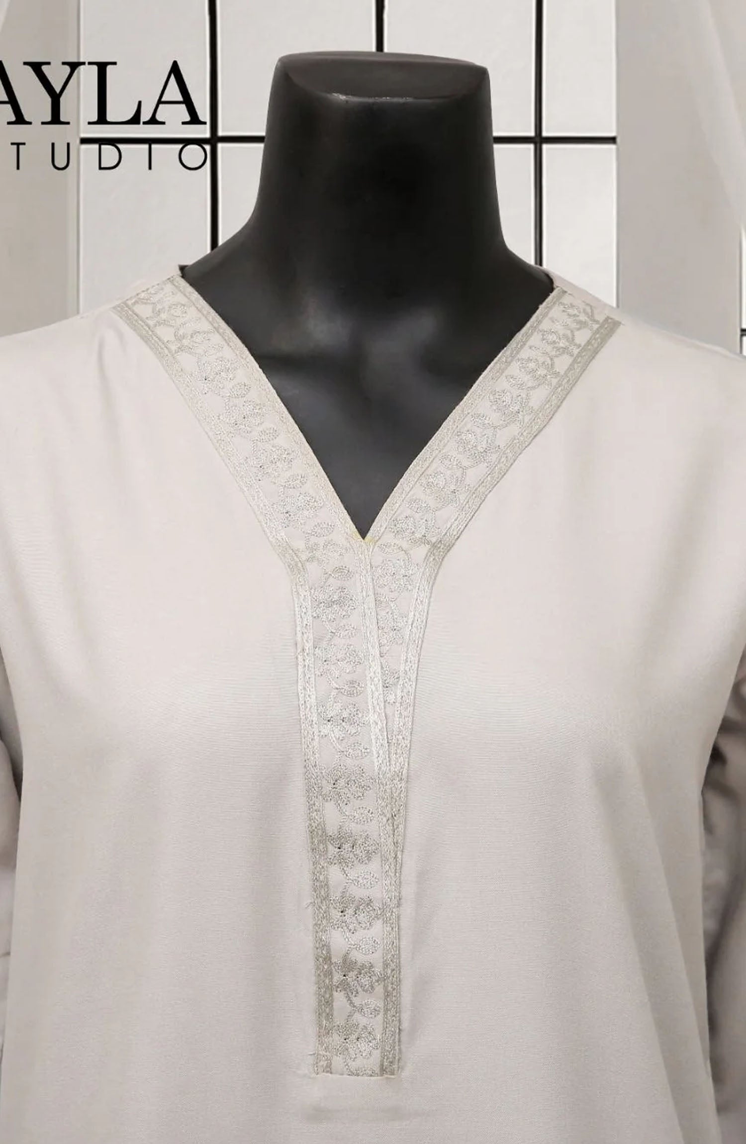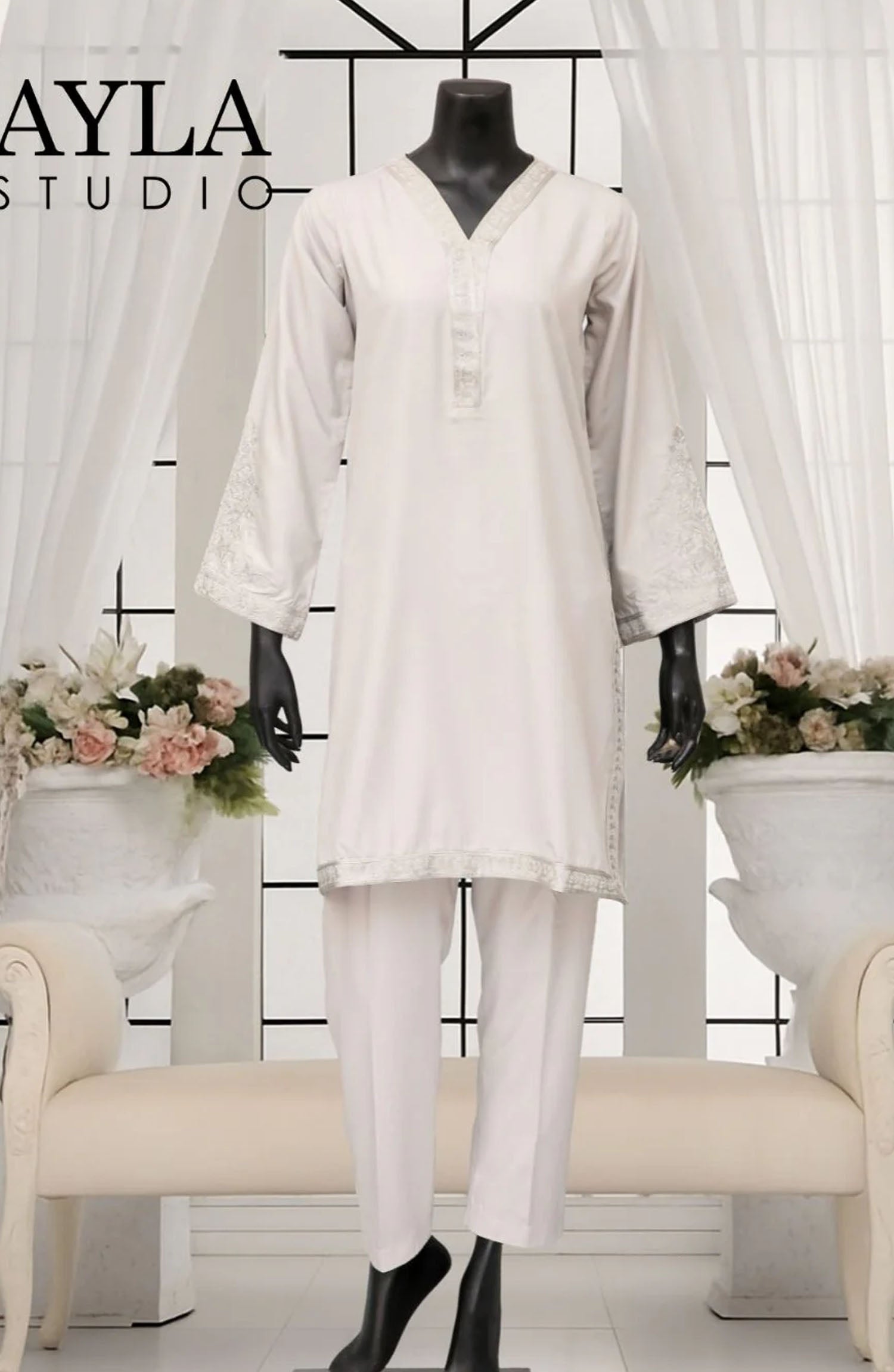Crafted with fine embroidery on premium fabric, this elegant eastern suit includes a beautifully detailed shirt and matching trousers. The subtle yet striking color adds a timeless charm, making it perfect for festive dinners, get-togethers, or semi-formal events.