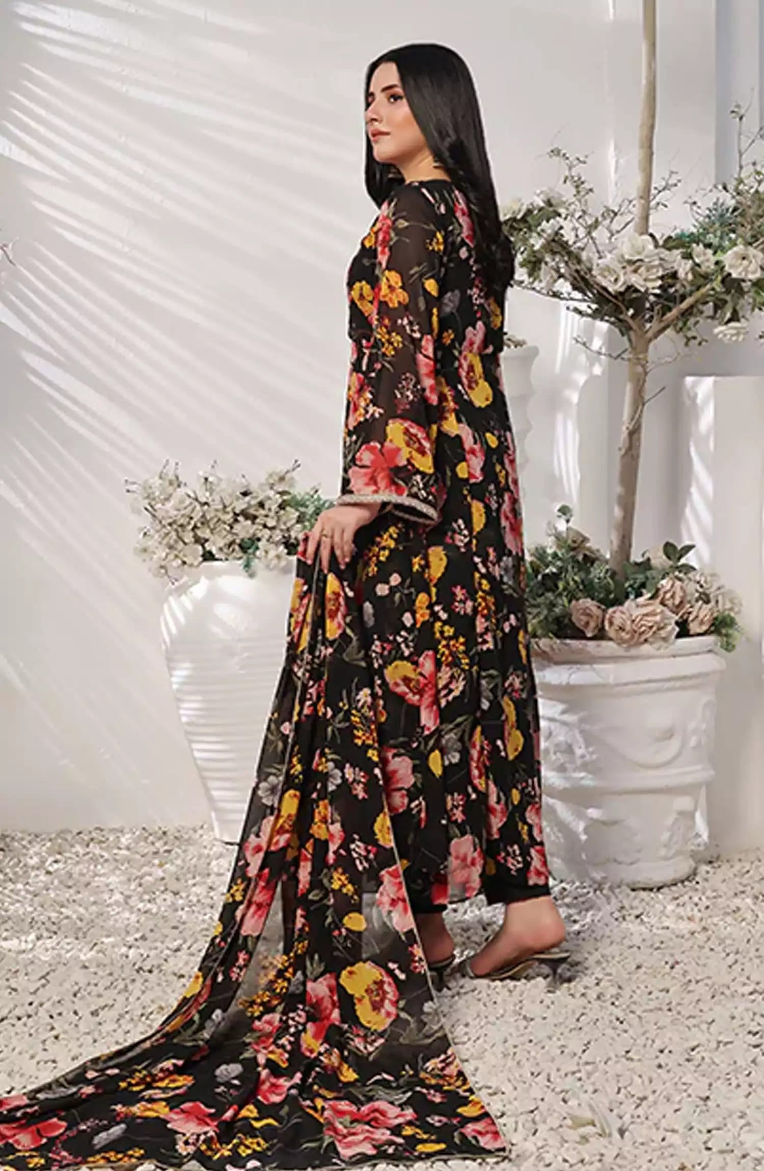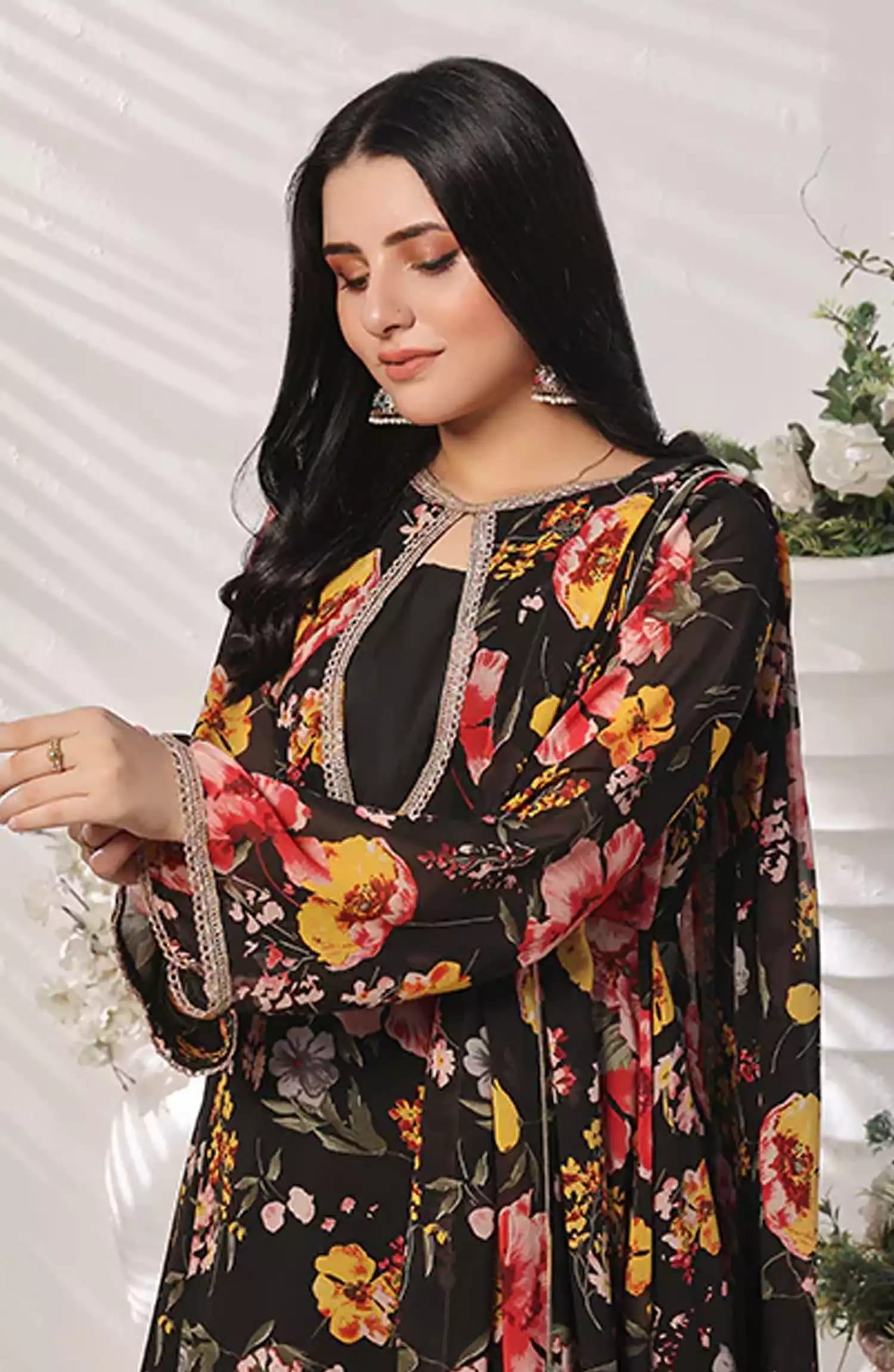 Introduce elegance into your wardrobe with "Charcoal charm flowy dress" rendered on an Charcoal canvas. The chiffon maxi features an Oval neckline with lace features, further enhanced by Charcoal floral print. Bursting. paired with crepe trouser and chiffon dupatta .