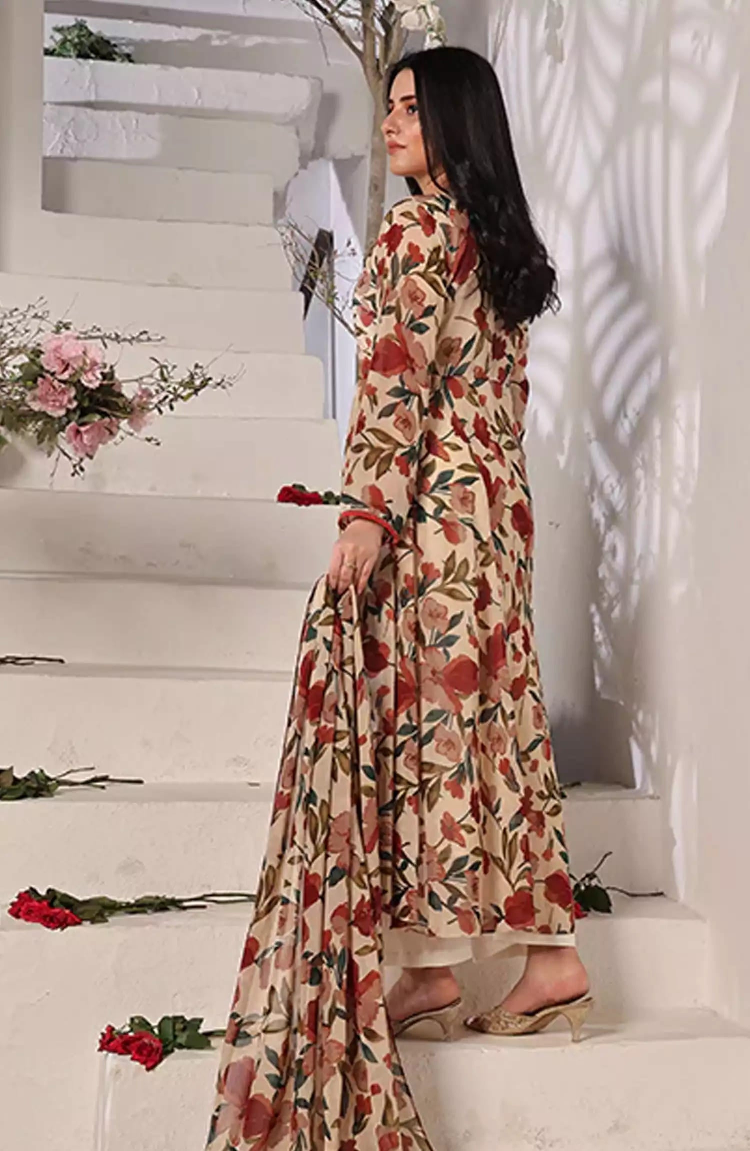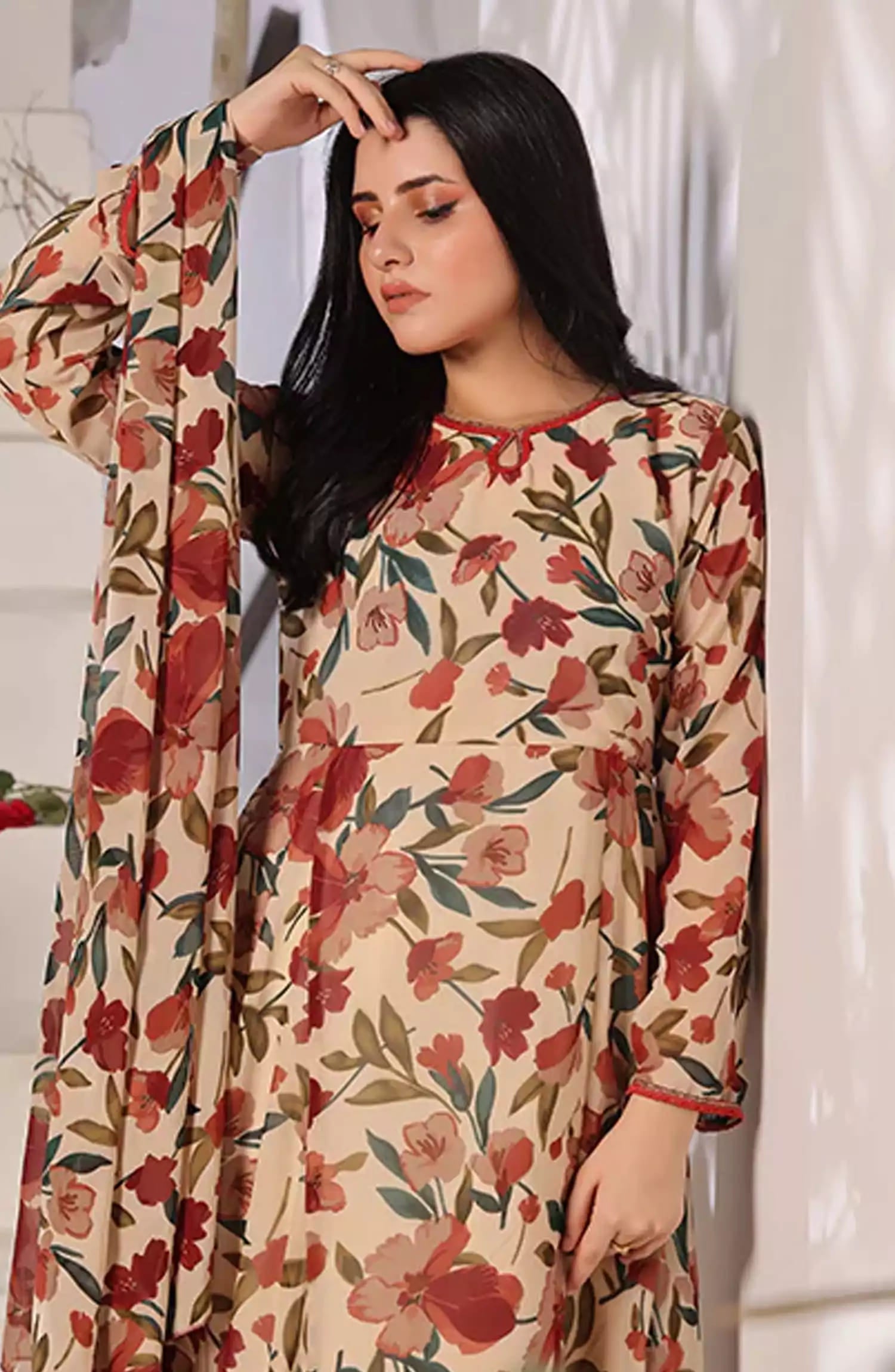 Introduce a touch of elegance and style with Calico flowers printed Chiffon maxi adorned with an lace neckline. The lace on the sleeves adds a unique and sophisticated touch. Complete the look with the paired crepe straight trousers for a stunning and comfortable outfit.